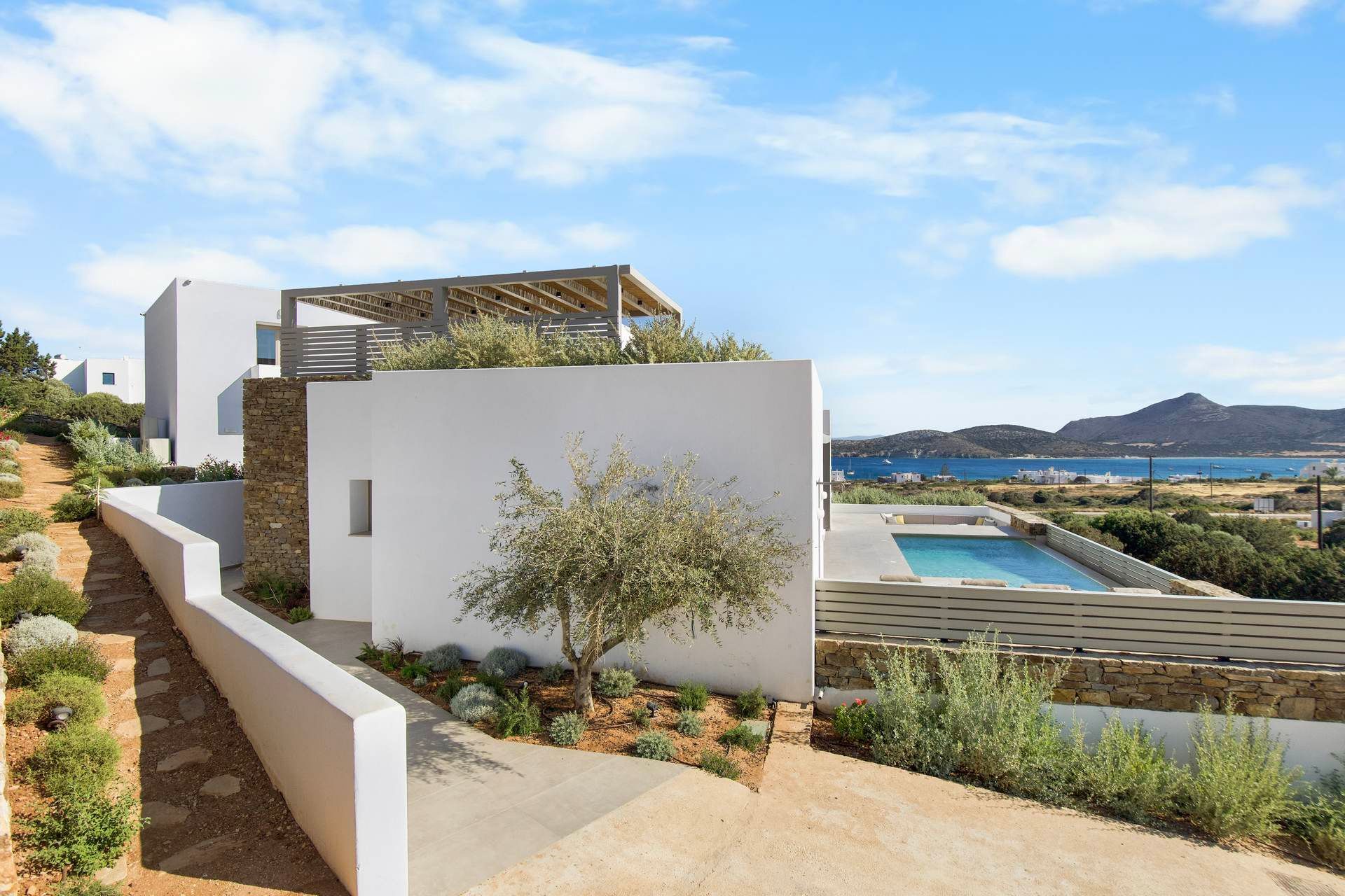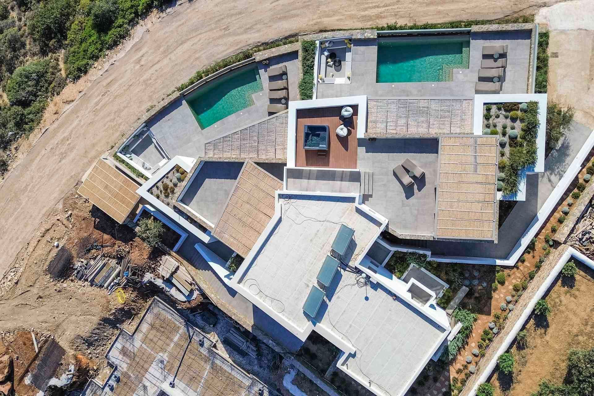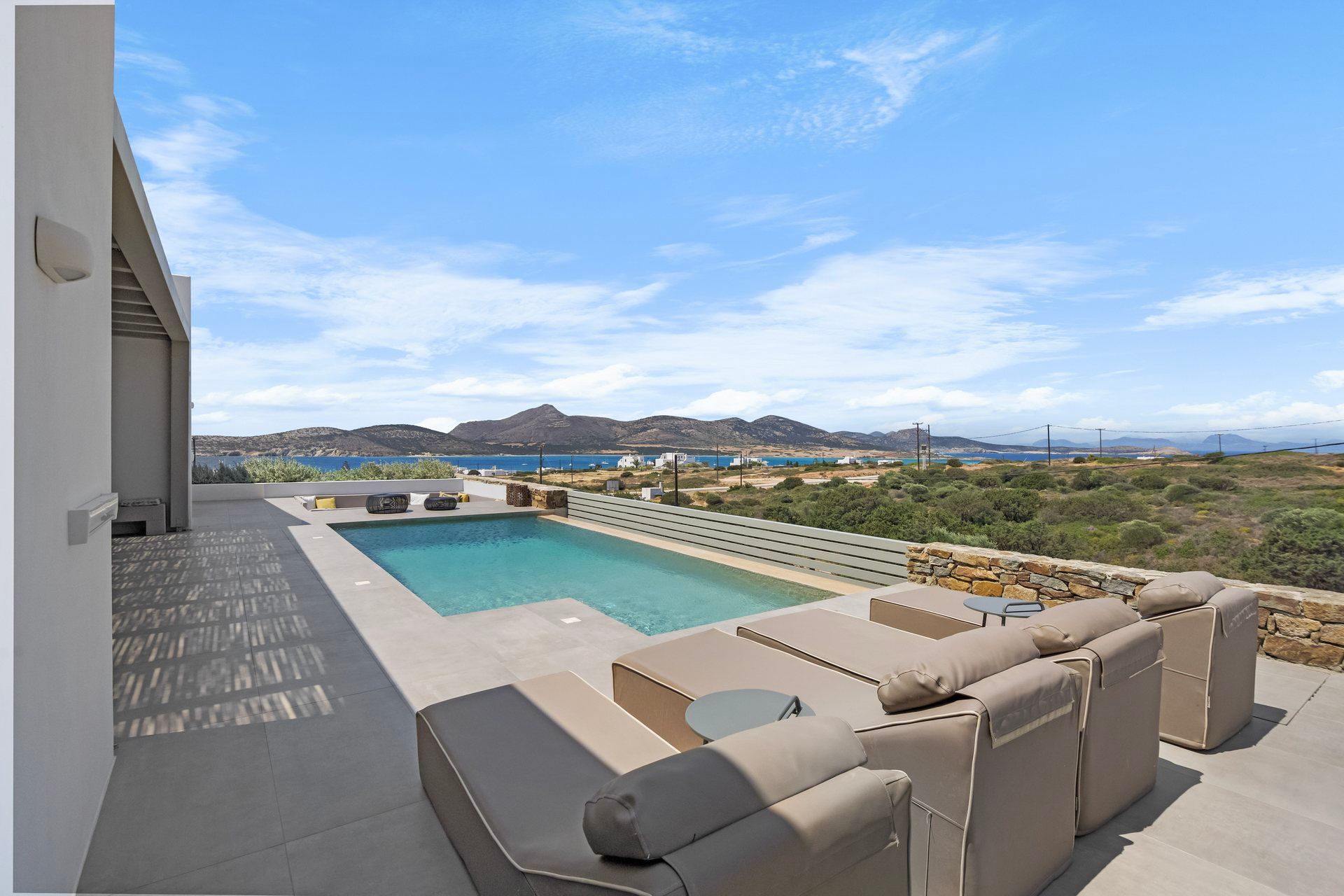 Much of life at Abyss unfolds around the main terrace, where the pool, dining area, and lounge spaces are all positioned to make the most of the view. The pergola-covered dining corner brings shade to long lunches and slower dinners, while the sun loungers and built-in seating keep the atmosphere relaxed. There is a clear sense of openness throughout, with the landscape stretching out and the sea remaining in sight from nearly every angle. The BBQ and sound system make the exterior just as suited to quiet days at home as to more social evenings outdoors.