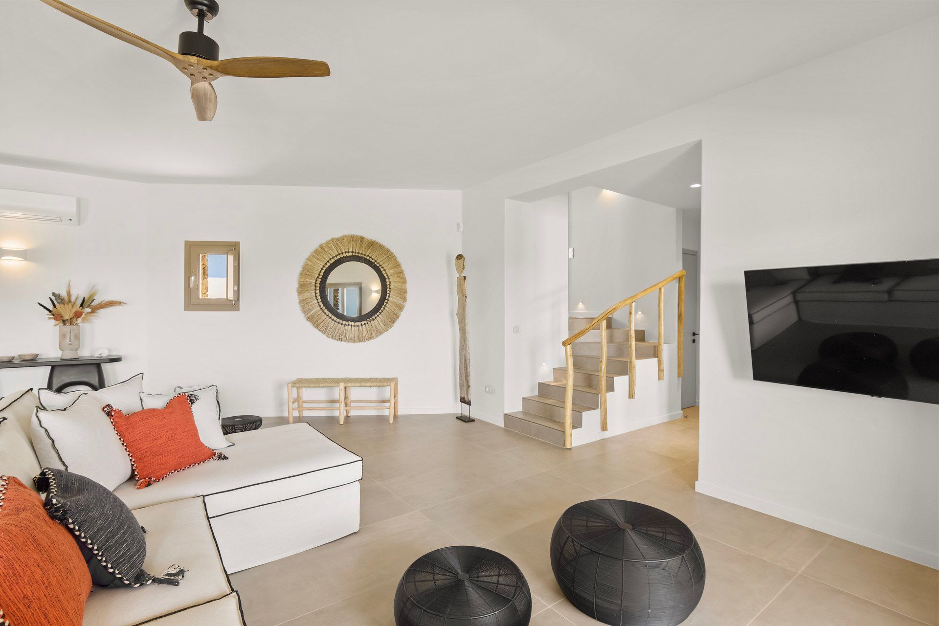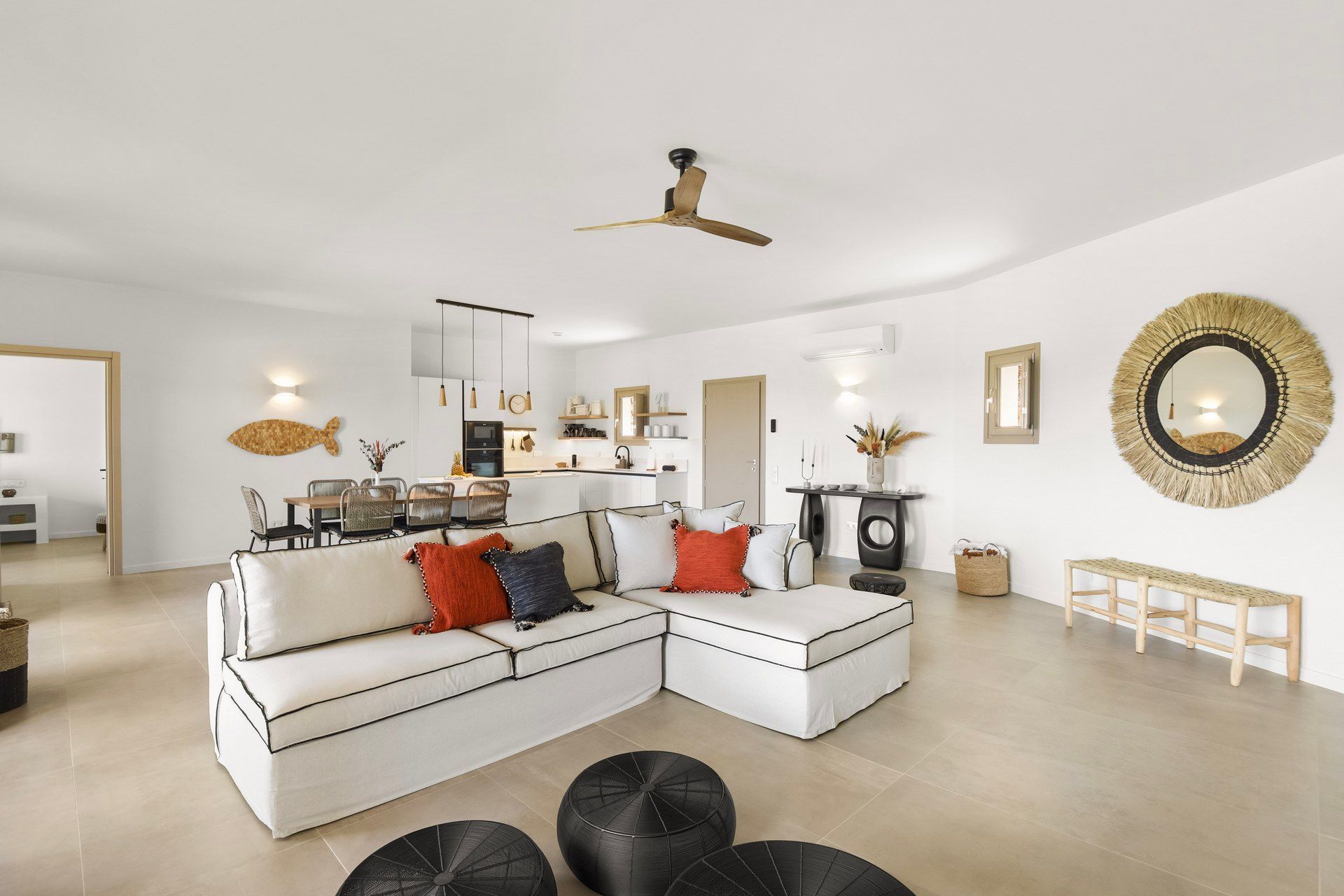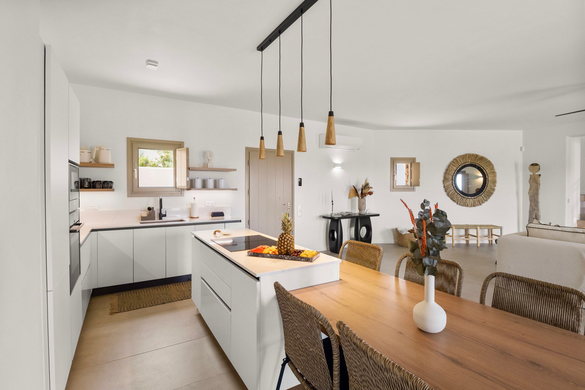Inside, Abyss is bright, cozy, and deliberately understated. The main living area combines kitchen, dining, and living room in one open space, giving the villa a more social character, while the bedrooms remain clearly separated for privacy. White walls and clean lines establish the contemporary tone, but woven textures, warmer accents, and softer furnishings keep the interiors from becoming too stark. The ground floor holds two of the bedrooms, while the master upstairs feels more private and slightly removed.