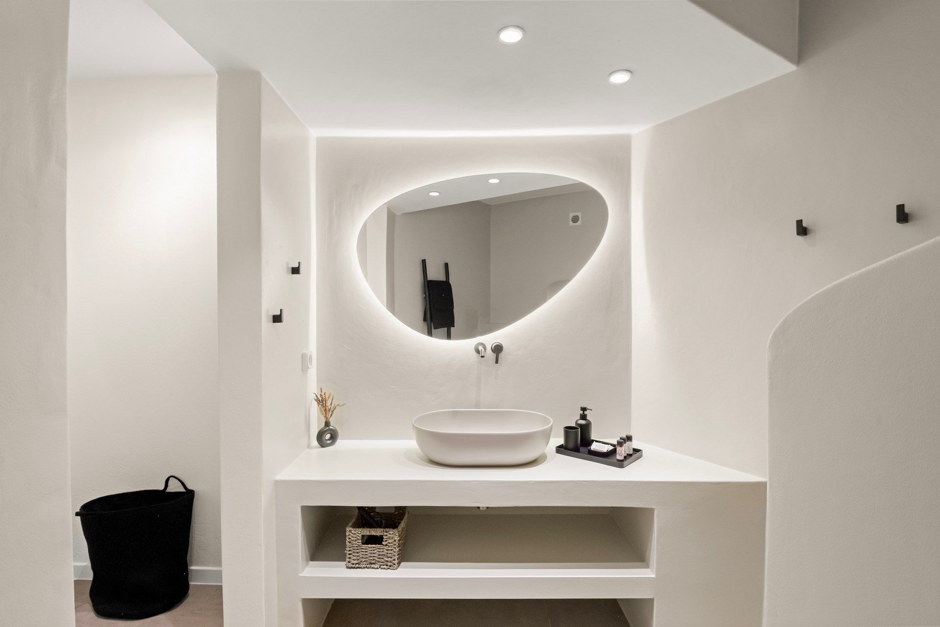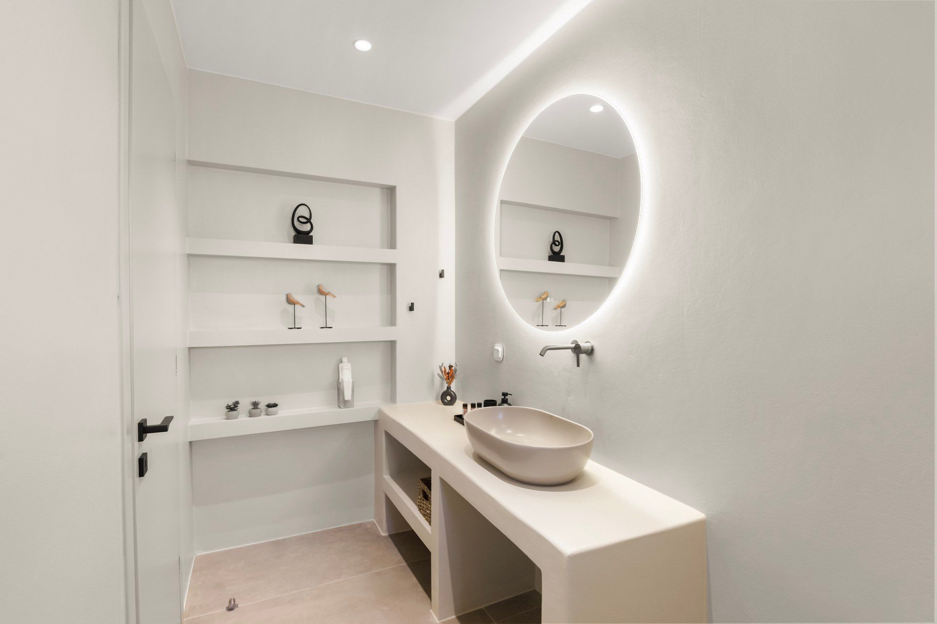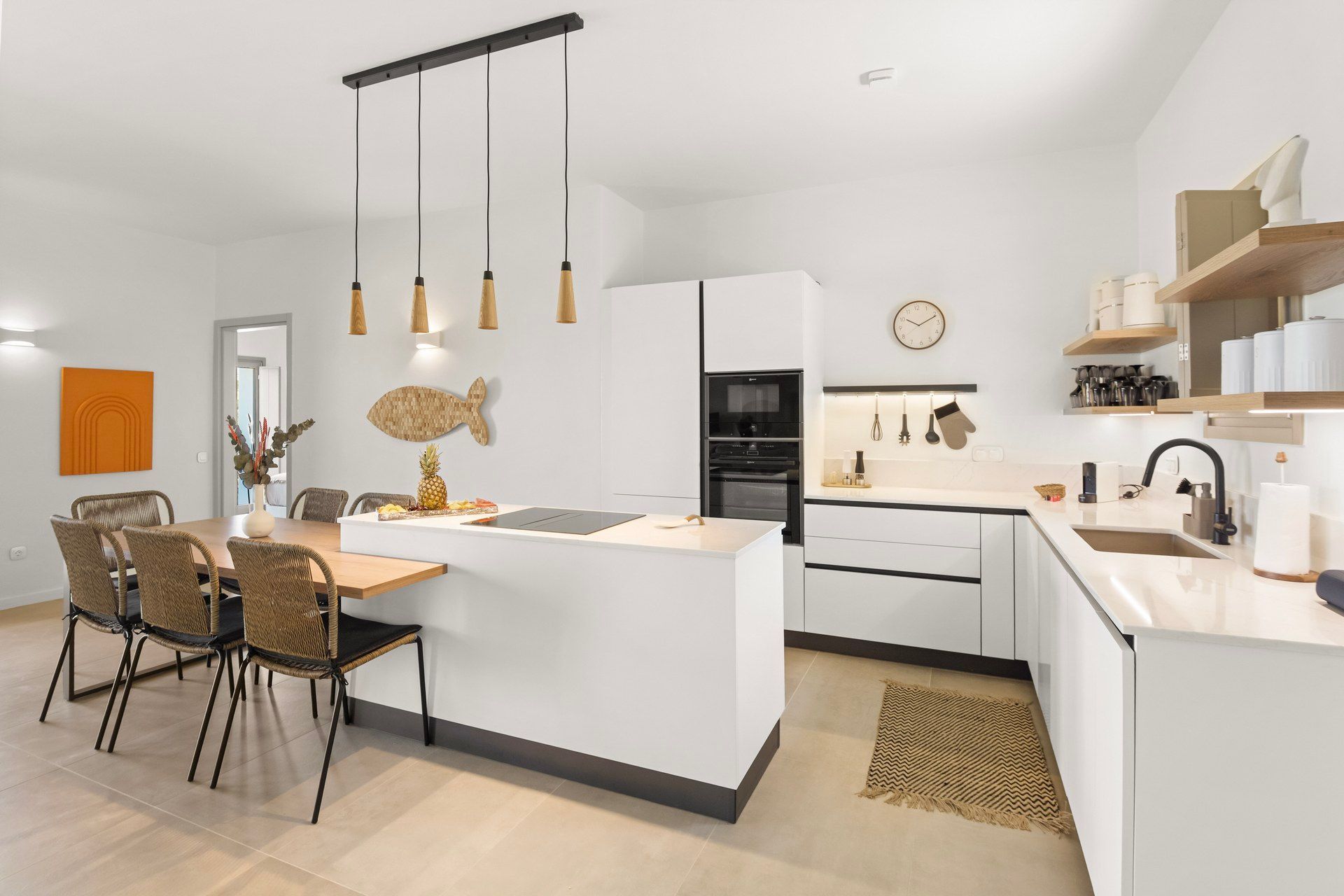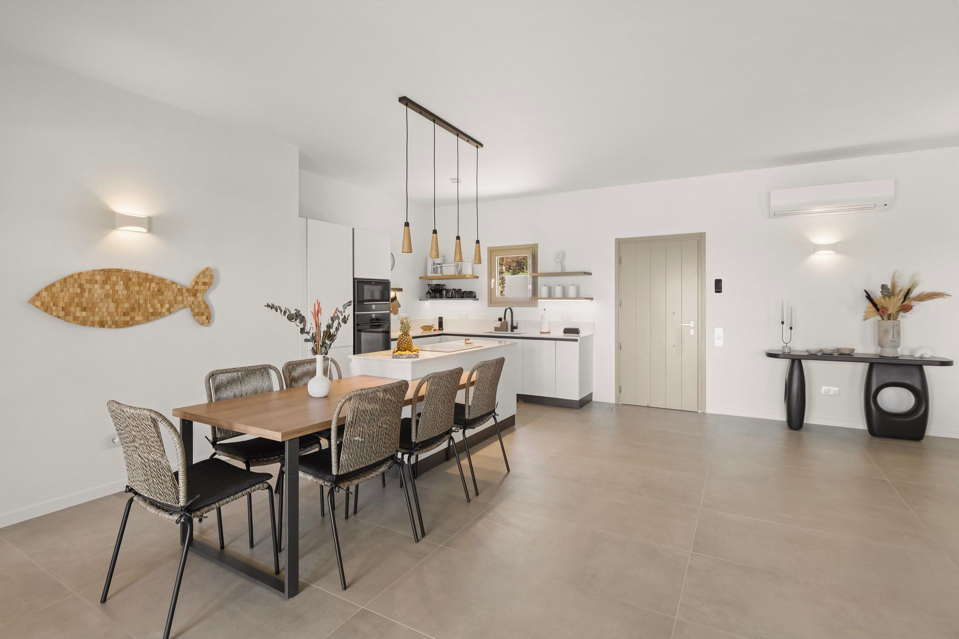 Inside, Abyss is bright, cozy, and deliberately understated. The main living area combines kitchen, dining, and living room in one open space, giving the villa a more social character, while the bedrooms remain clearly separated for privacy. White walls and clean lines establish the contemporary tone, but woven textures, warmer accents, and softer furnishings keep the interiors from becoming too stark. The ground floor holds two of the bedrooms, while the master upstairs feels more private and slightly removed.
