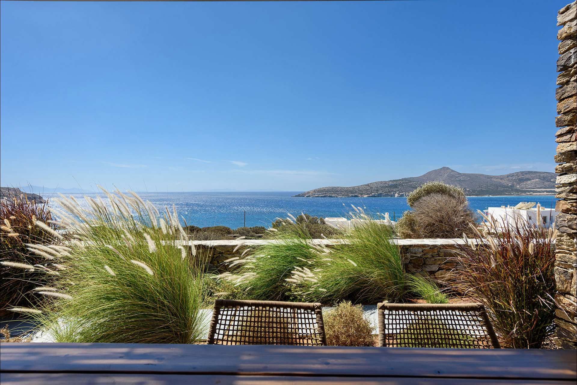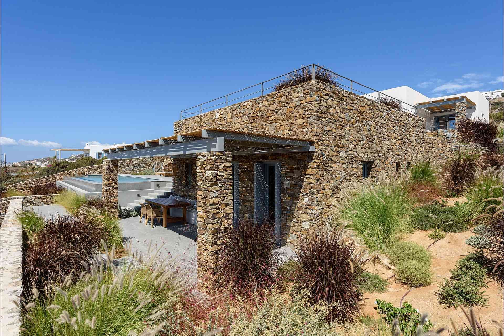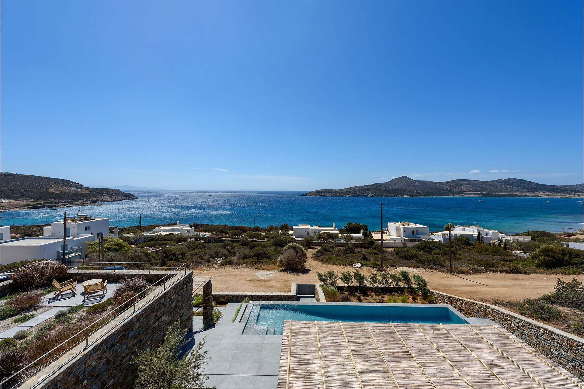 Skyblue’s location keeps the stay close to the sea. An unorganized sandy beach is just a short walk away, while Soros Beach and Antiparos cave can be reached without much effort by car. The villa also includes a gym with basic equipment, a laundry room, staff accommodation, and private parking, all of which support a more comfortable stay behind the scenes. Pets are welcome on request, which is another practical advantage for those planning a longer stay on the island.