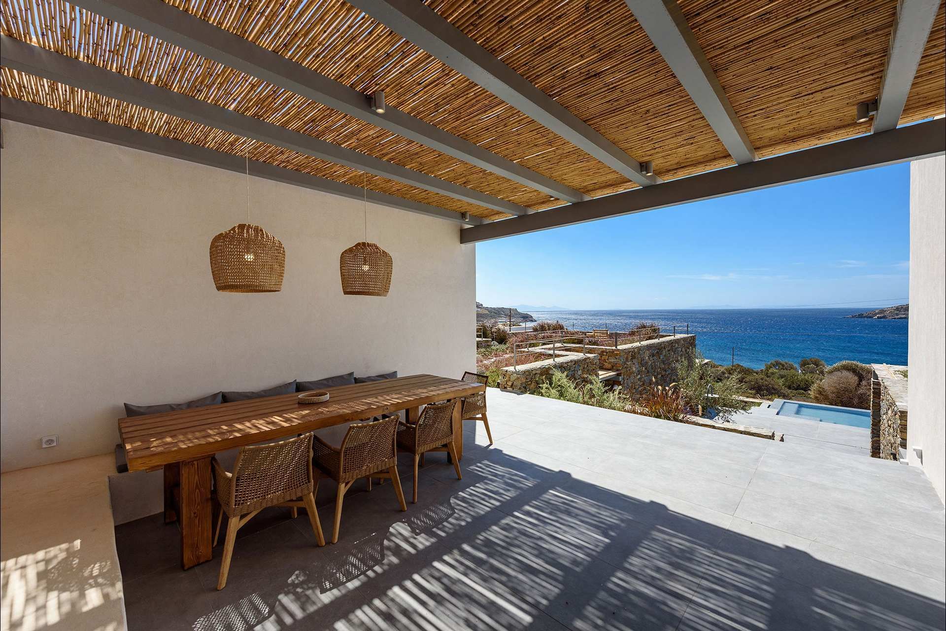 At the heart of the villa is a generous pool terrace, with sunbeds, shaded seating, and dining space arranged to make outdoor living feel easy and uninterrupted. Stone detailing and planting soften the cleaner architectural lines, helping Skyblue settle more naturally into its setting, while the outdoor kitchenette makes it simple to keep meals and gatherings outside. As the light changes, the fire pit adds another focal point, and the sea view remains the constant thread running through it all.
