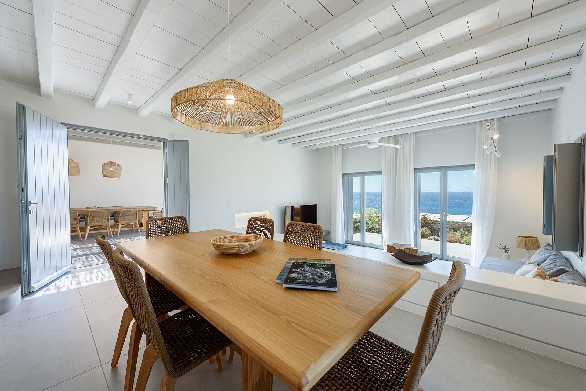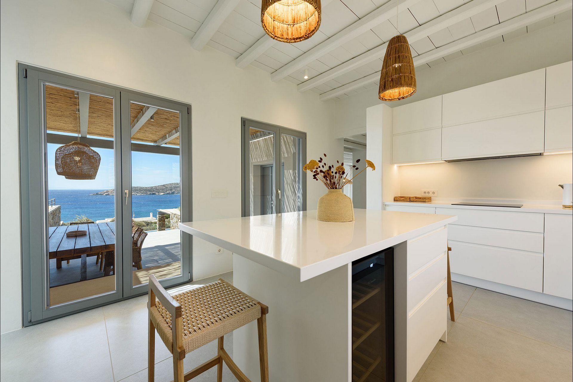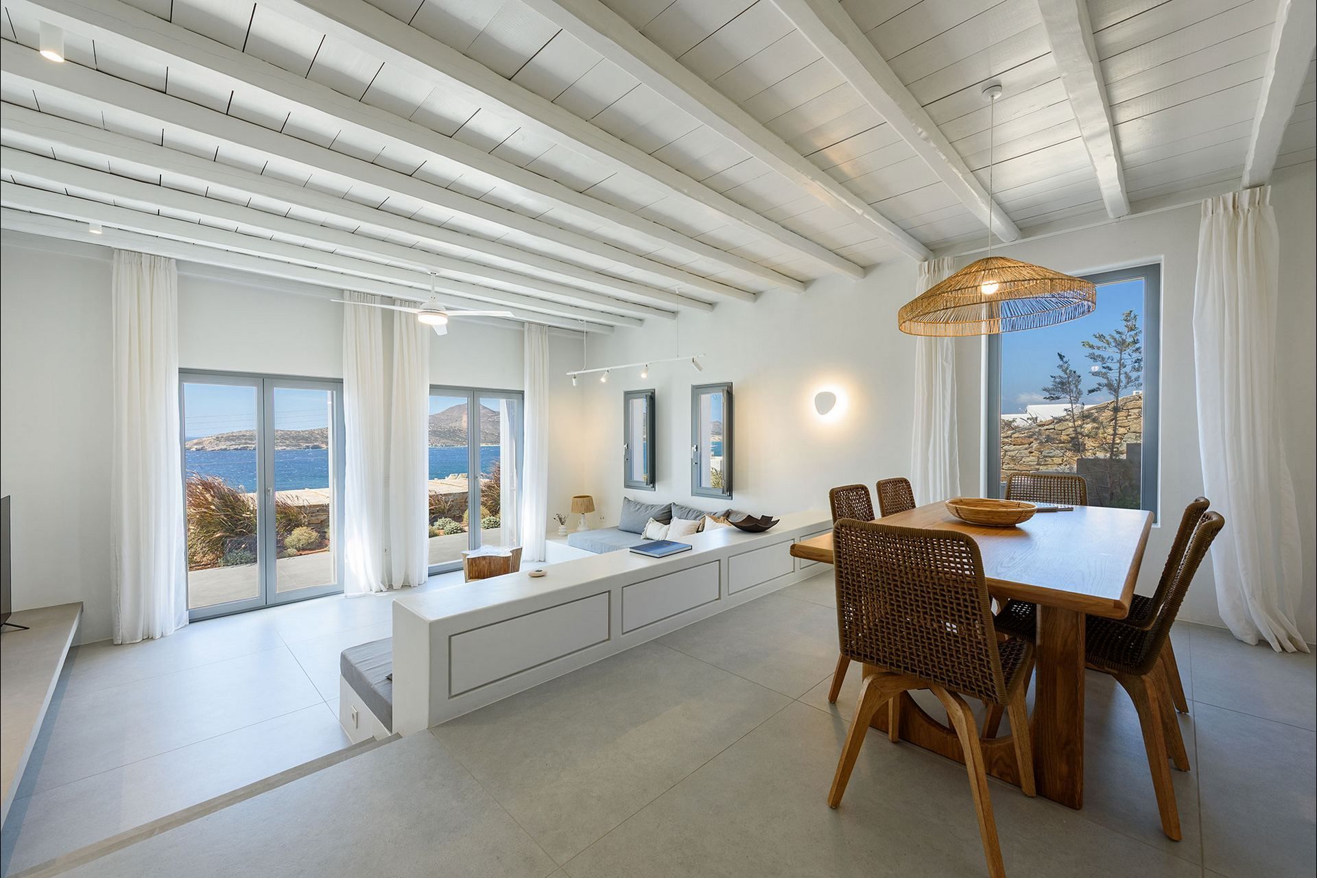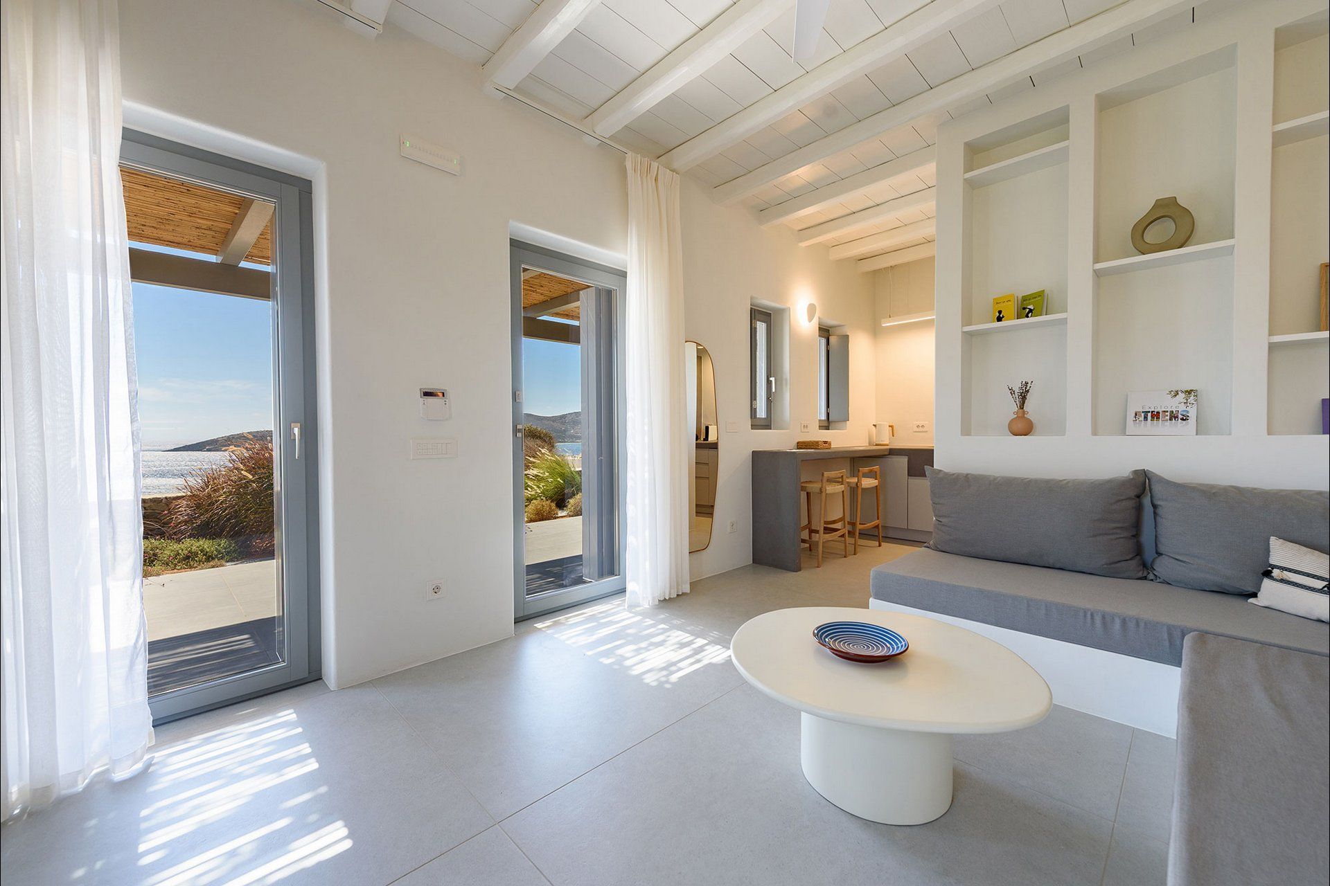 The interiors favour a quieter, more understated aesthetic, with white-beamed ceilings, pale surfaces, natural textures, and large openings that draw in both light and sea. The ground level of the main house brings together the living area, dining space, kitchen, and two ensuite bedrooms, all with access outdoors, while the master bedroom upstairs feels more secluded and self-contained, opening to its own jacuzzi. The guesthouse continues the same visual mood with an open-plan bedroom, living area, and kitchen, adding flexibility without interrupting the overall flow.