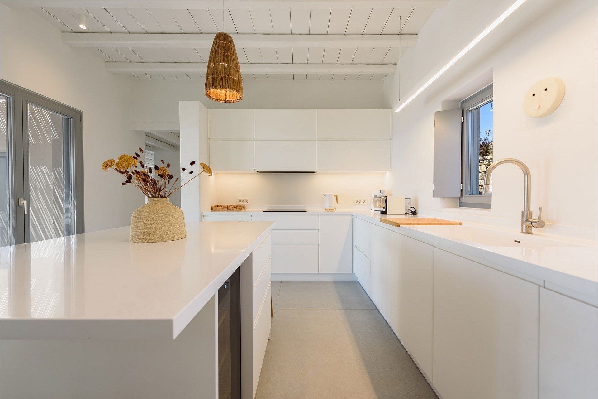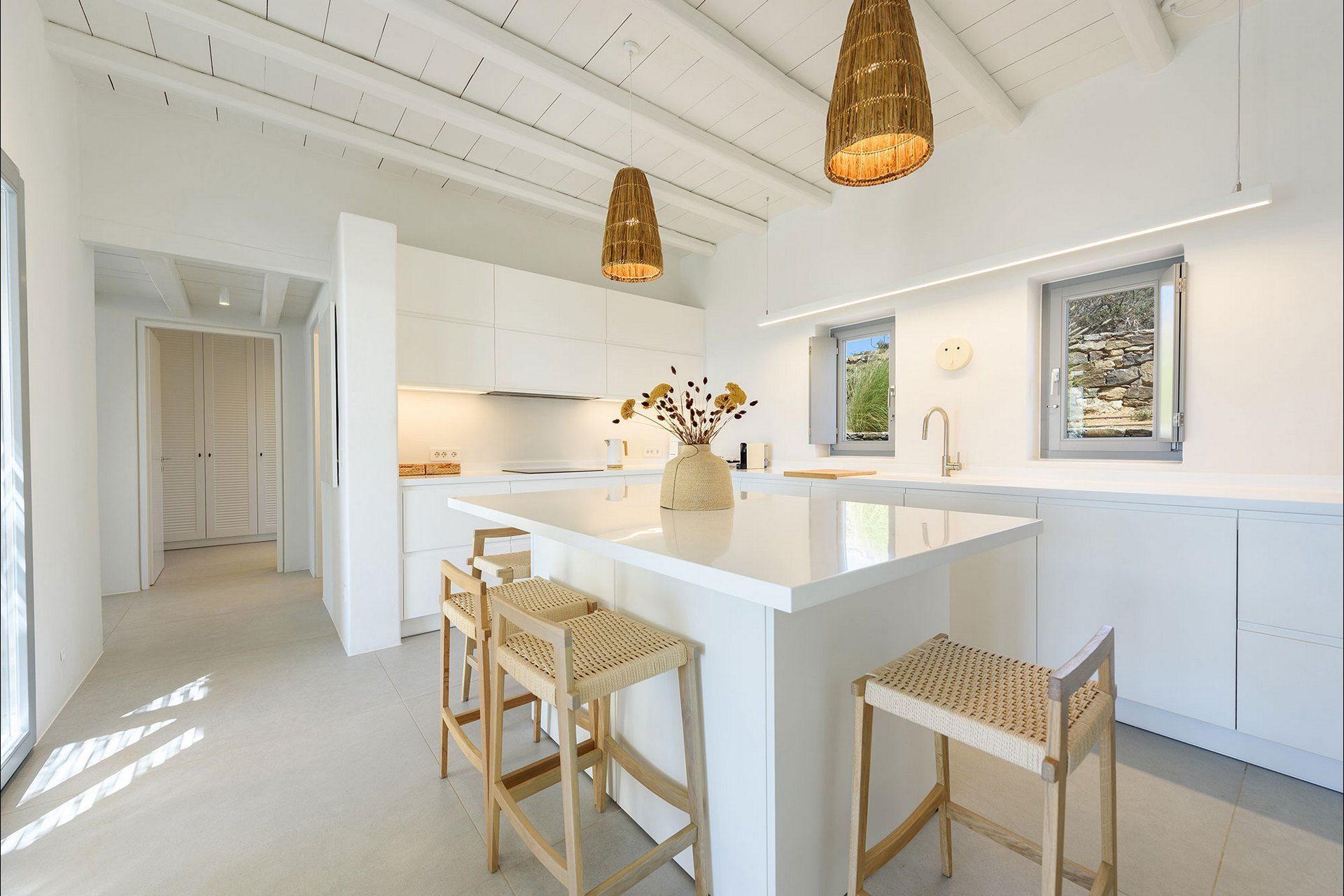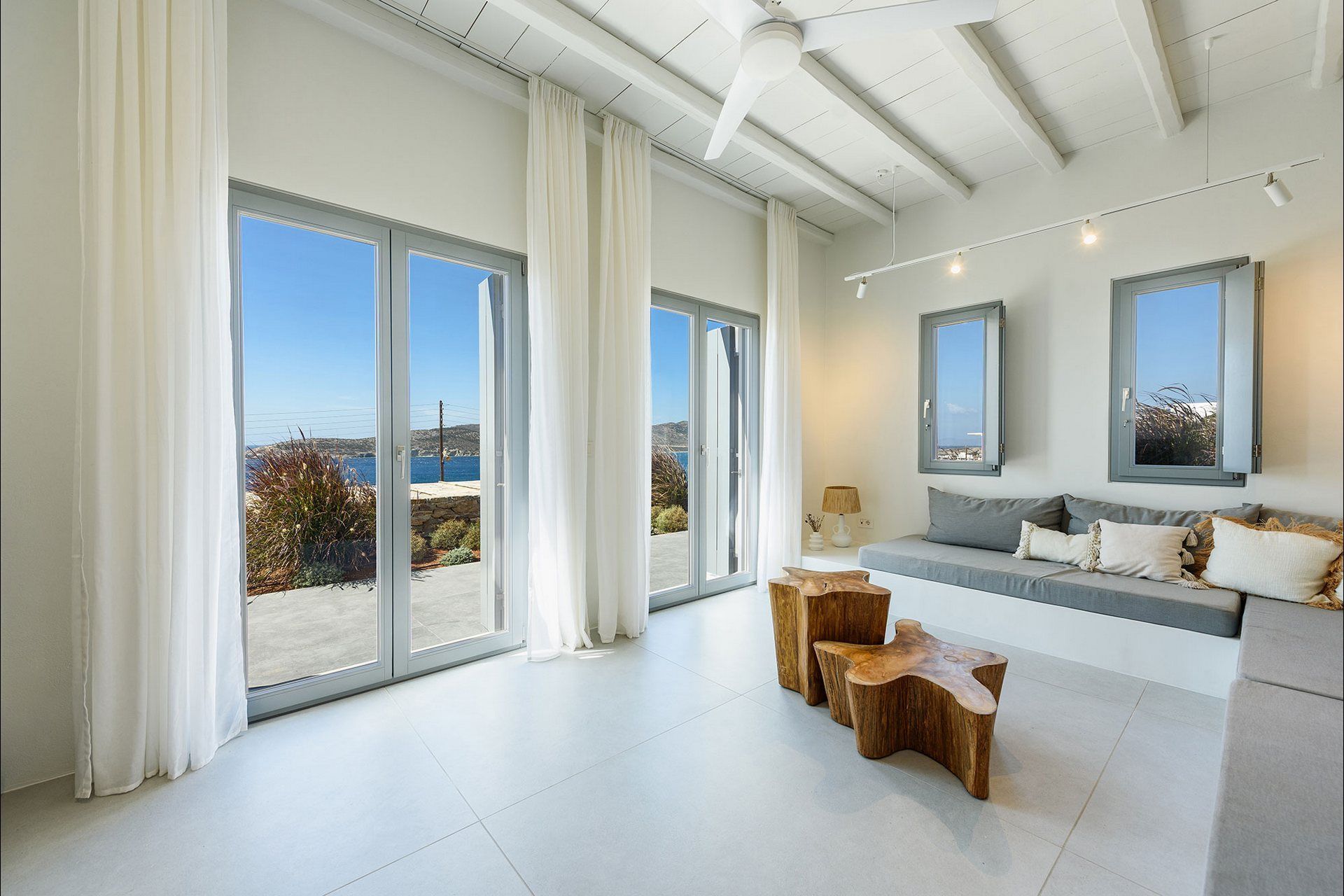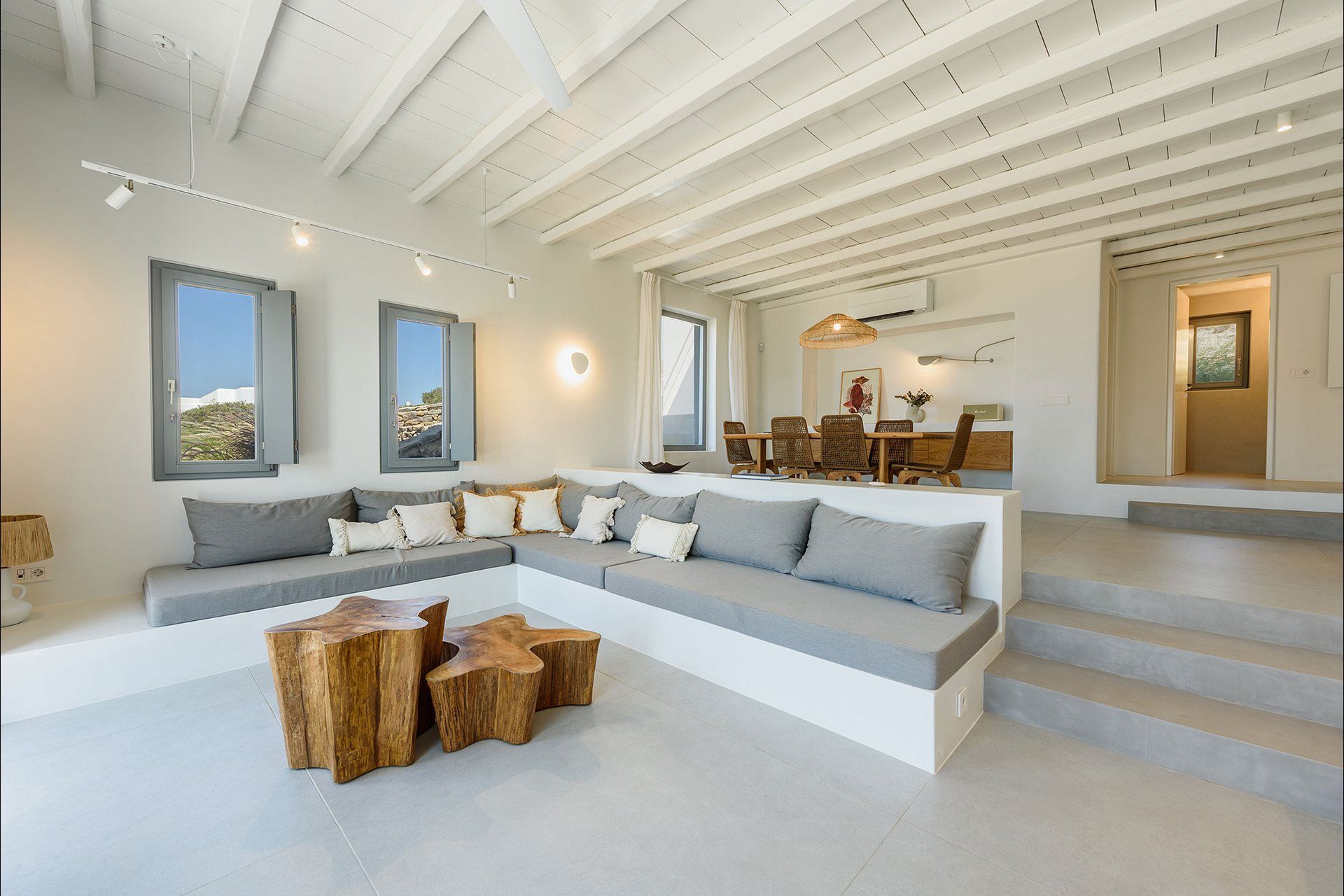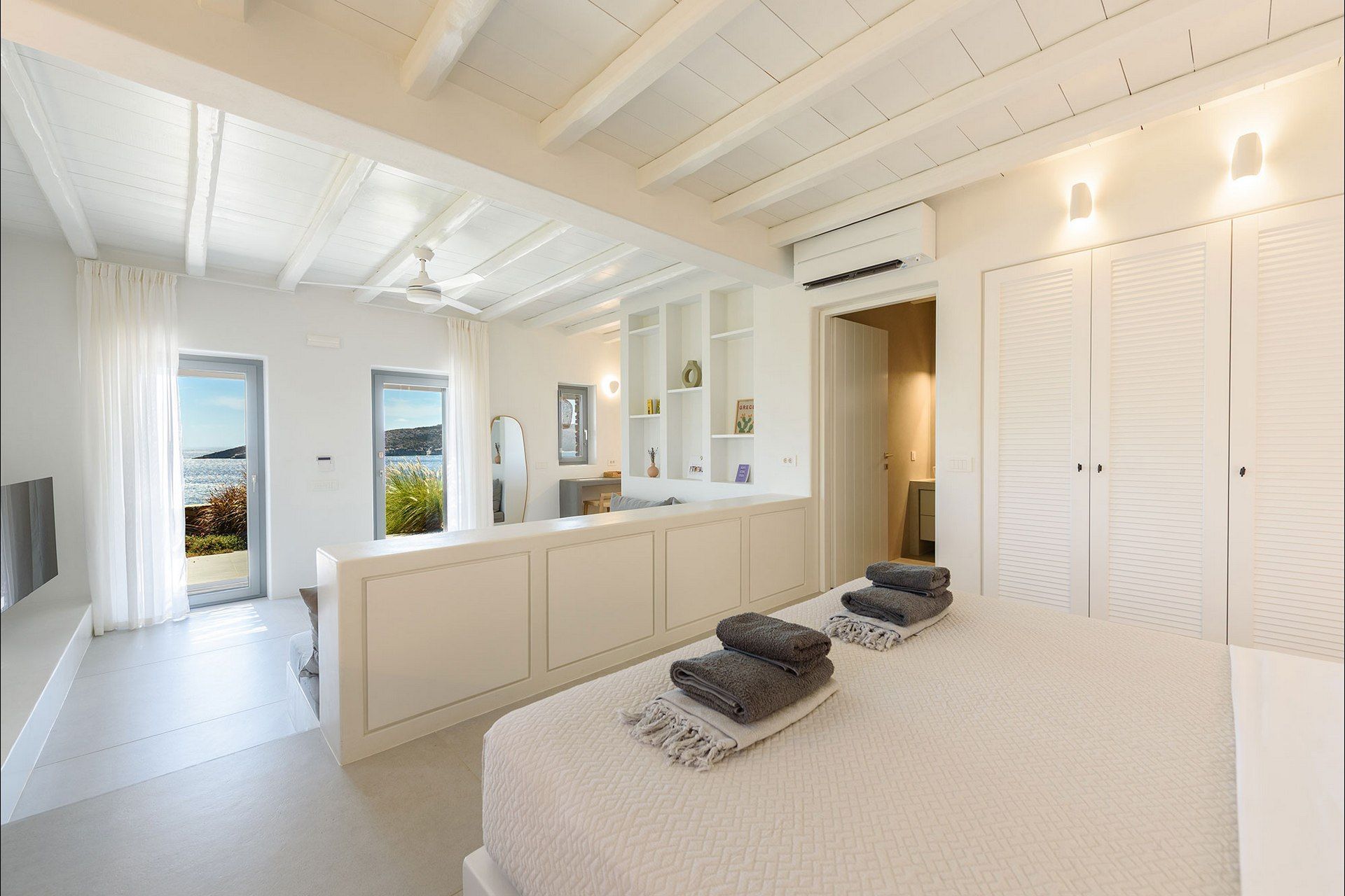 The interiors favour a quieter, more understated aesthetic, with white-beamed ceilings, pale surfaces, natural textures, and large openings that draw in both light and sea. The ground level of the main house brings together the living area, dining space, kitchen, and two ensuite bedrooms, all with access outdoors, while the master bedroom upstairs feels more secluded and self-contained, opening to its own jacuzzi. The guesthouse continues the same visual mood with an open-plan bedroom, living area, and kitchen, adding flexibility without interrupting the overall flow.