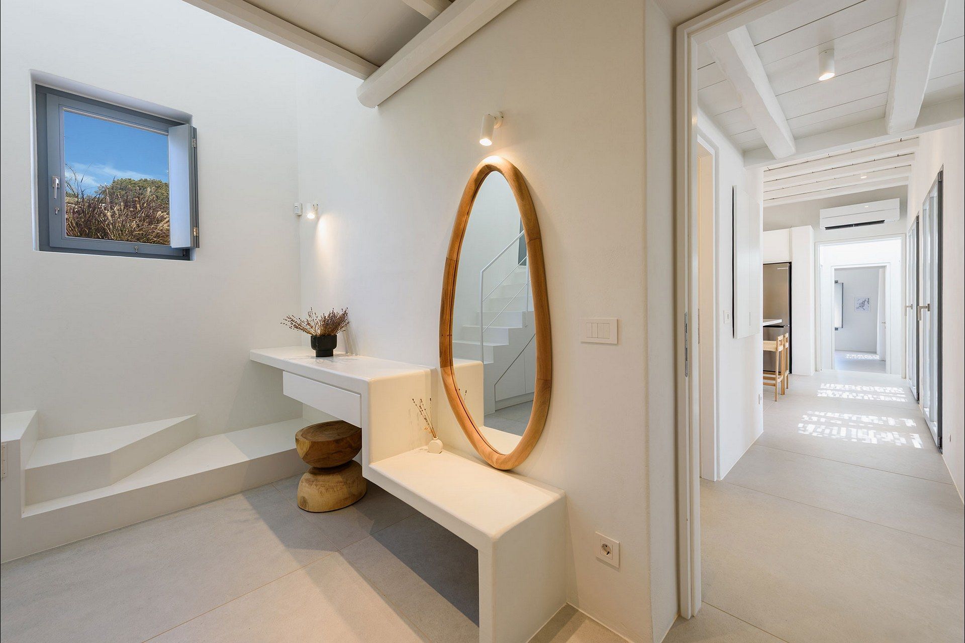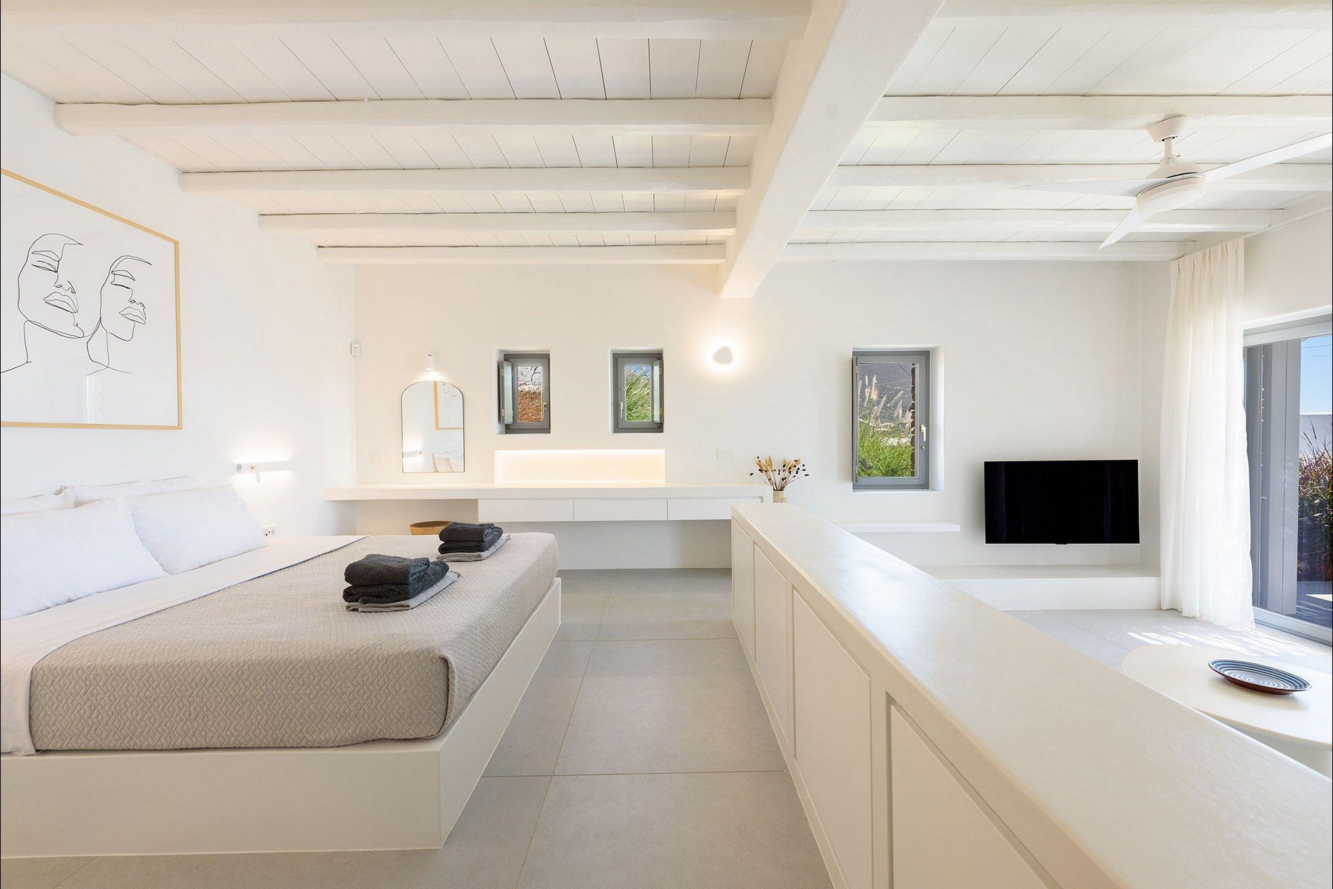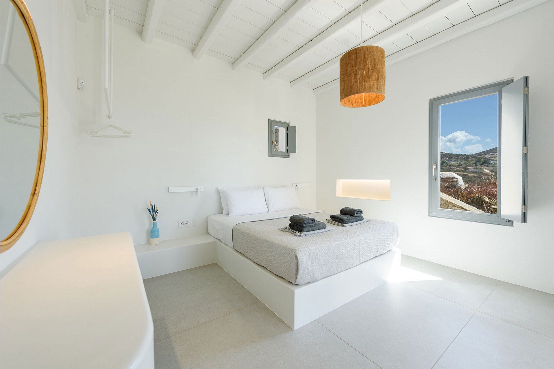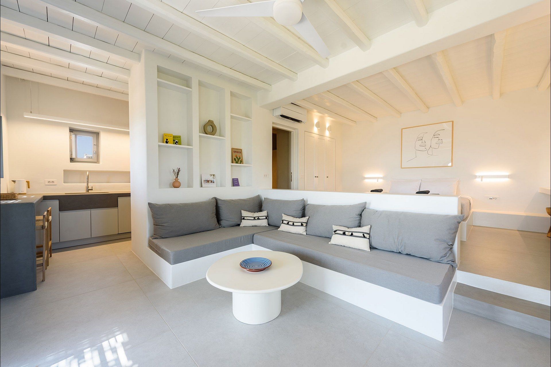 The interiors favour a quieter, more understated aesthetic, with white-beamed ceilings, pale surfaces, natural textures, and large openings that draw in both light and sea. The ground level of the main house brings together the living area, dining space, kitchen, and two ensuite bedrooms, all with access outdoors, while the master bedroom upstairs feels more secluded and self-contained, opening to its own jacuzzi. The guesthouse continues the same visual mood with an open-plan bedroom, living area, and kitchen, adding flexibility without interrupting the overall flow.