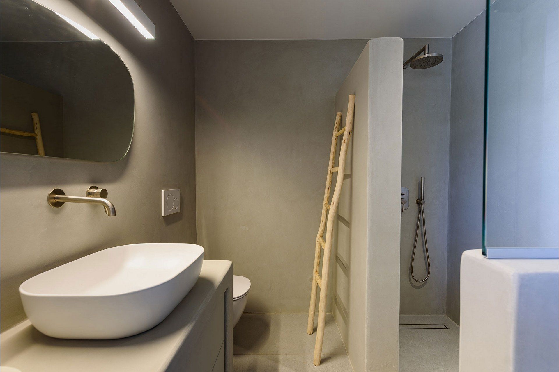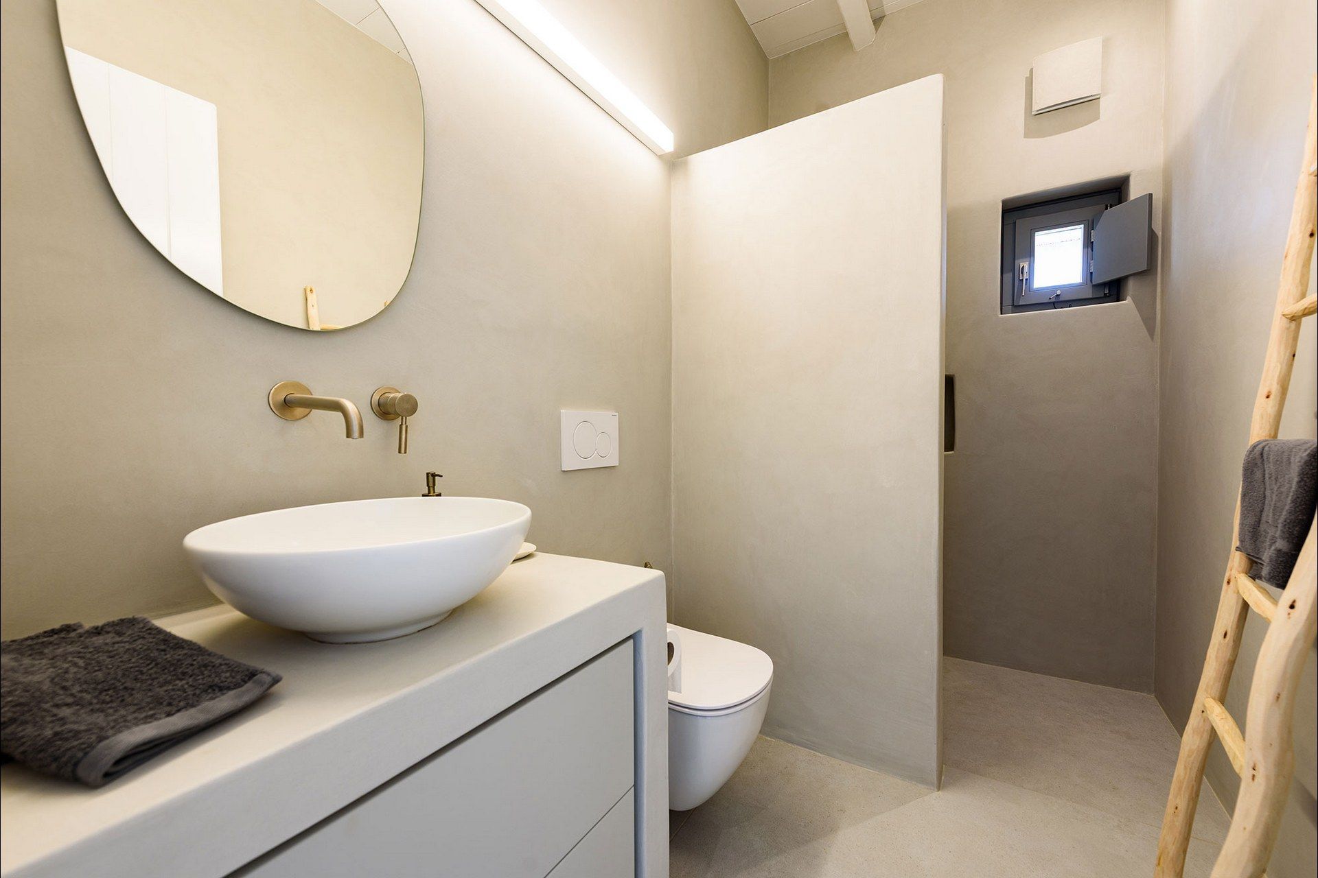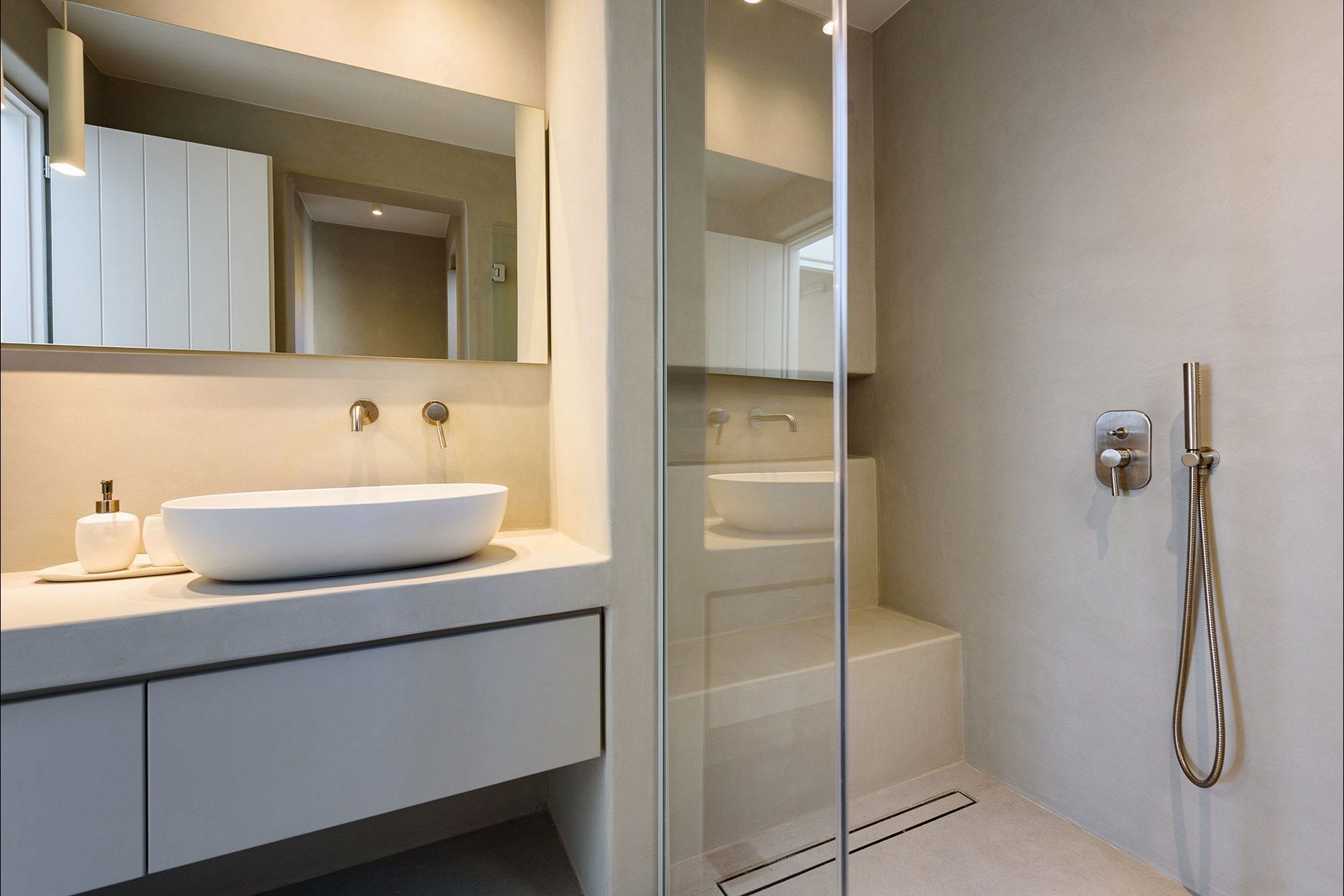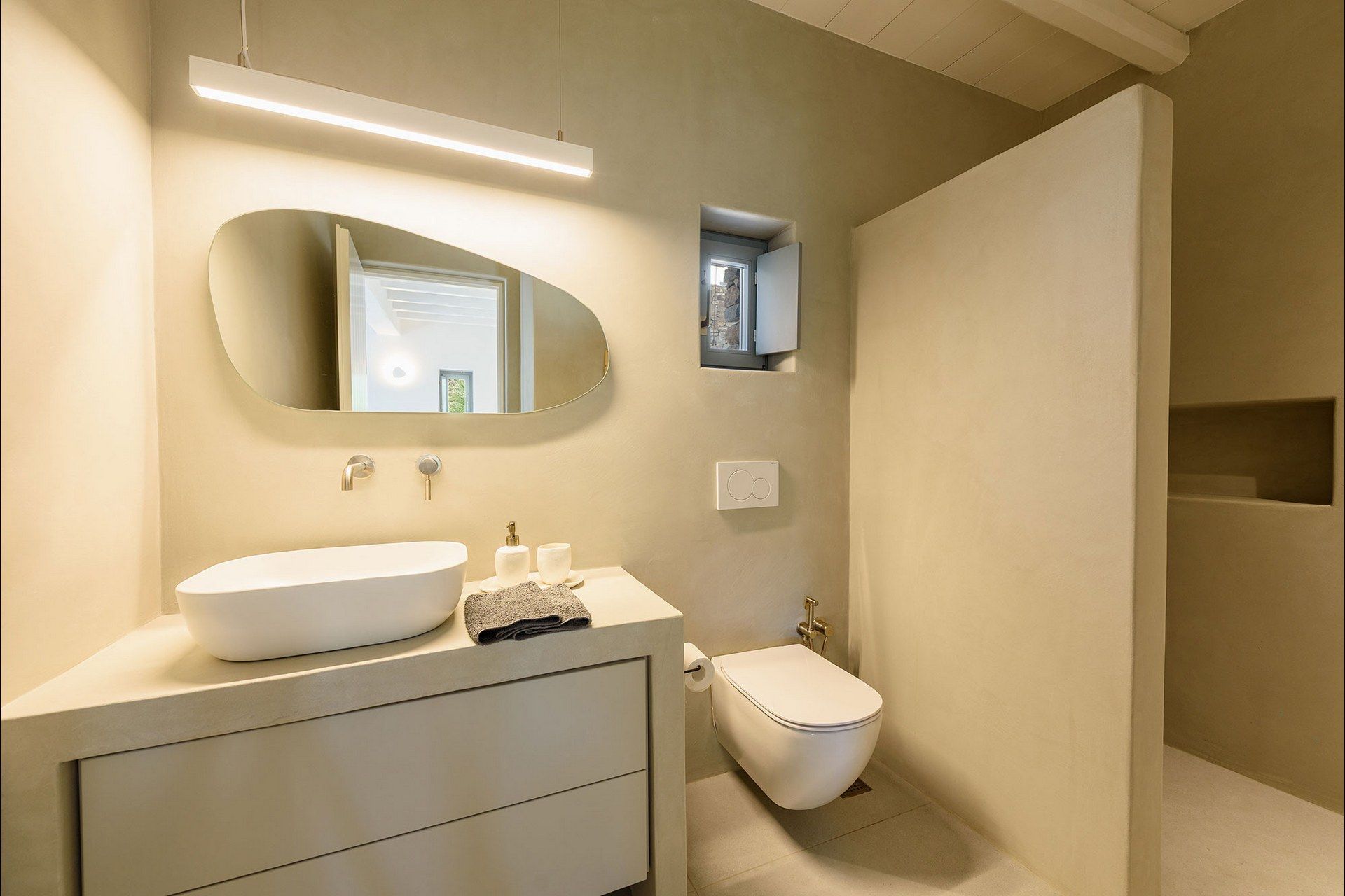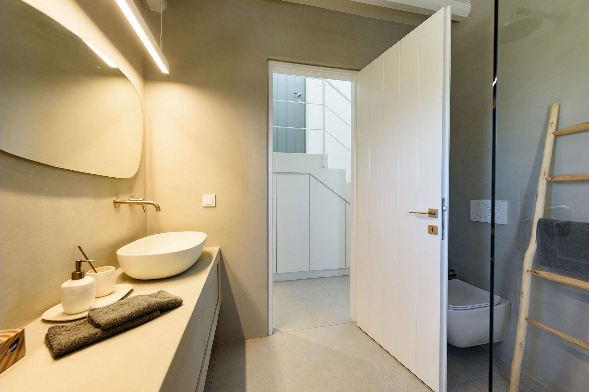 The interiors favour a quieter, more understated aesthetic, with white-beamed ceilings, pale surfaces, natural textures, and large openings that draw in both light and sea. The ground level of the main house brings together the living area, dining space, kitchen, and two ensuite bedrooms, all with access outdoors, while the master bedroom upstairs feels more secluded and self-contained, opening to its own jacuzzi. The guesthouse continues the same visual mood with an open-plan bedroom, living area, and kitchen, adding flexibility without interrupting the overall flow.