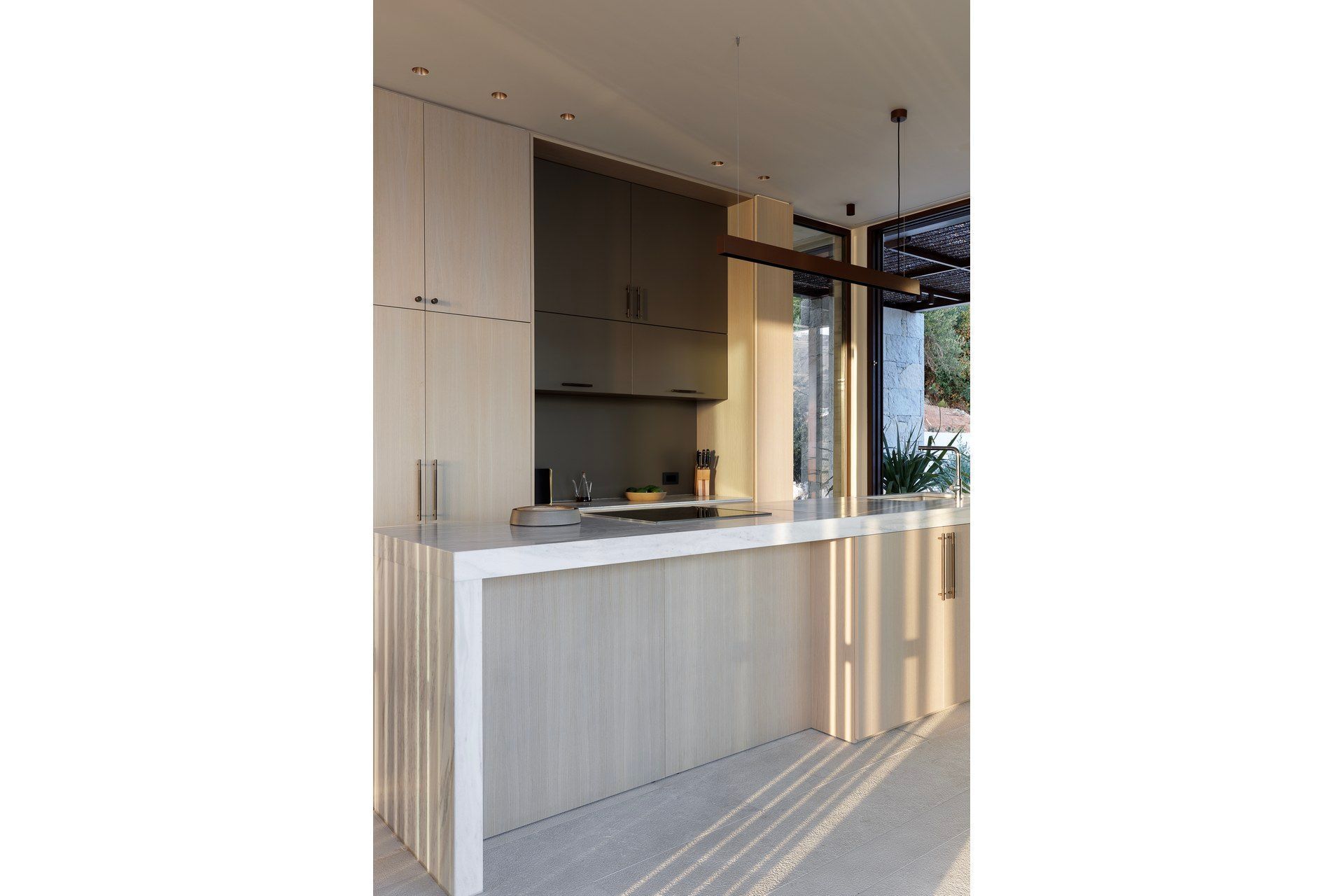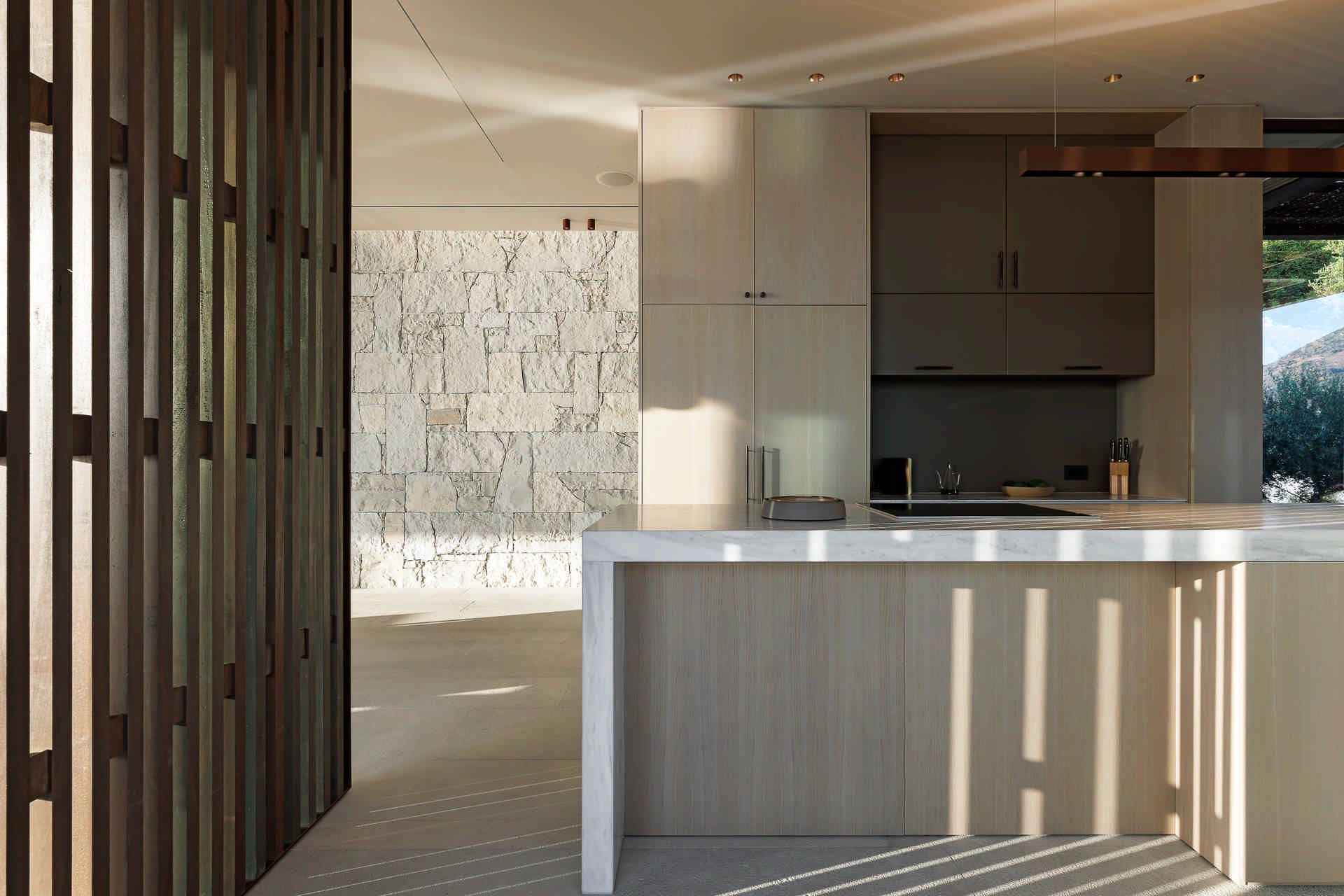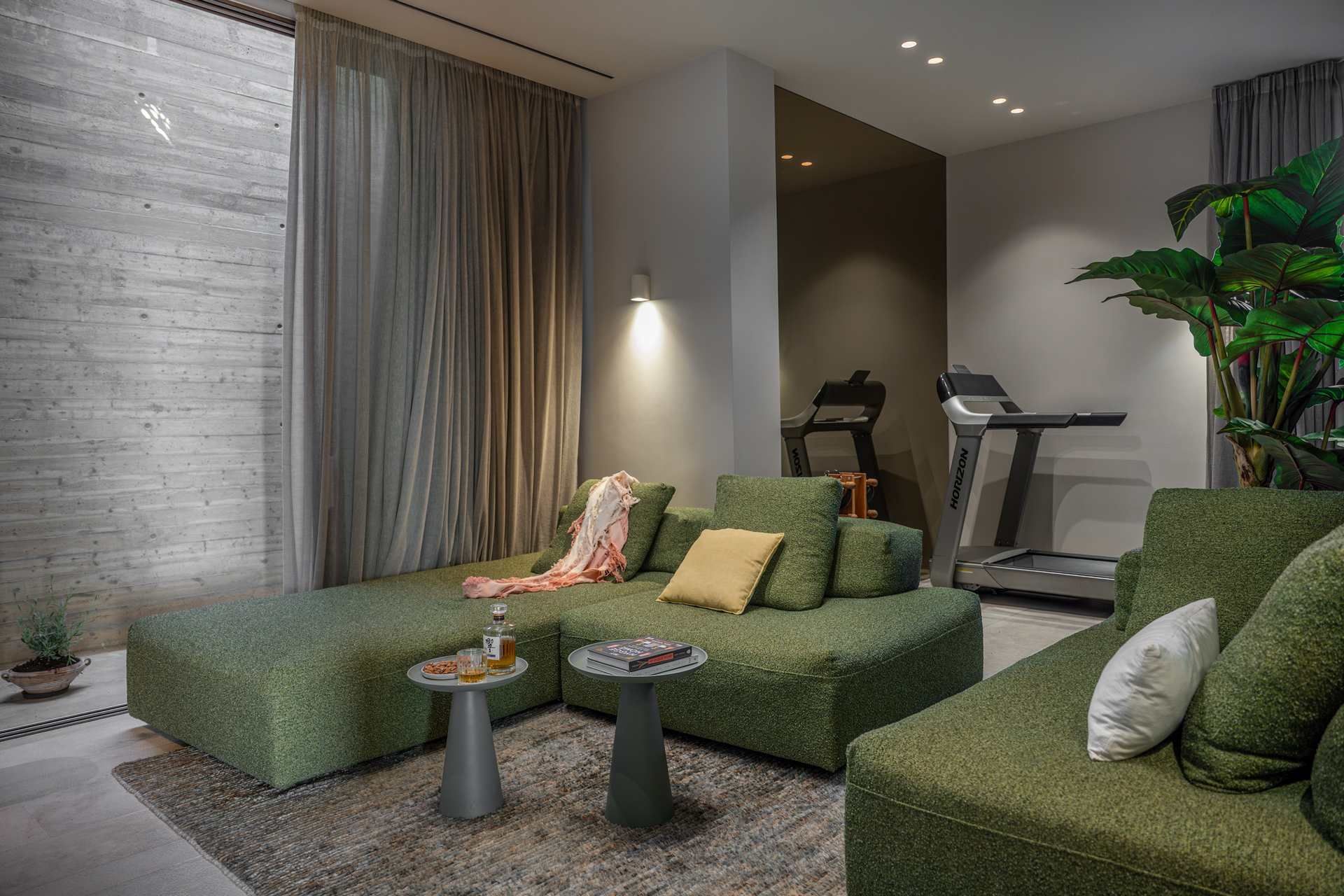 In the villa, contemporary furnishing and subtle, earthy tones create a sanctuary of light, while minimalist design imbues every room with a sense of calm. The open-plan living area feels directly connected with the pool terrace, capturing breathtaking views from every corner. Undoubtedly, the highlight of the interiors is the cozy multi-functional room located on the ground floor, complete with modern gym equipment, a curated local wine bar, and a playful game area featuring a smart TV and PlayStation—ensuring there’s never a dull moment.