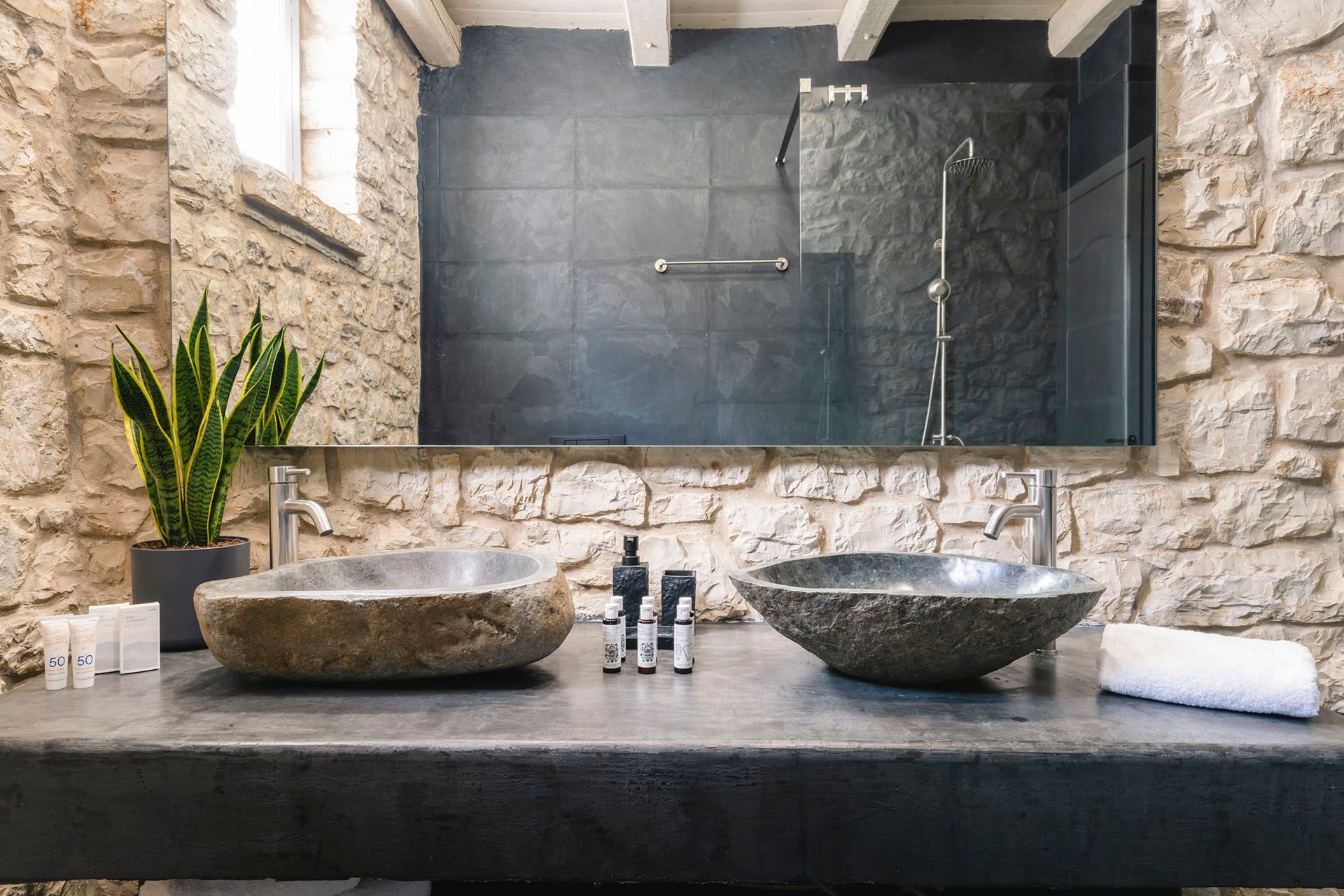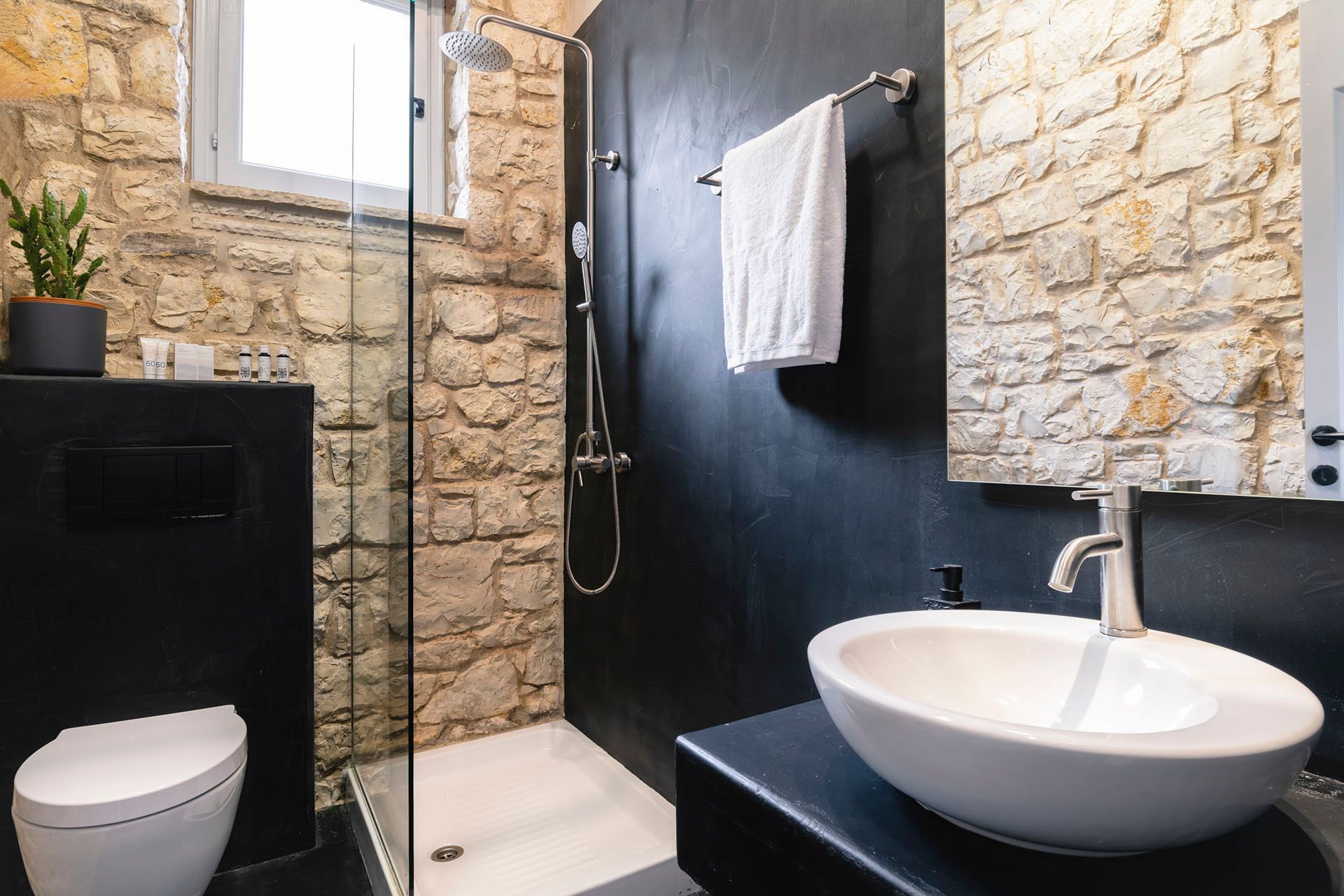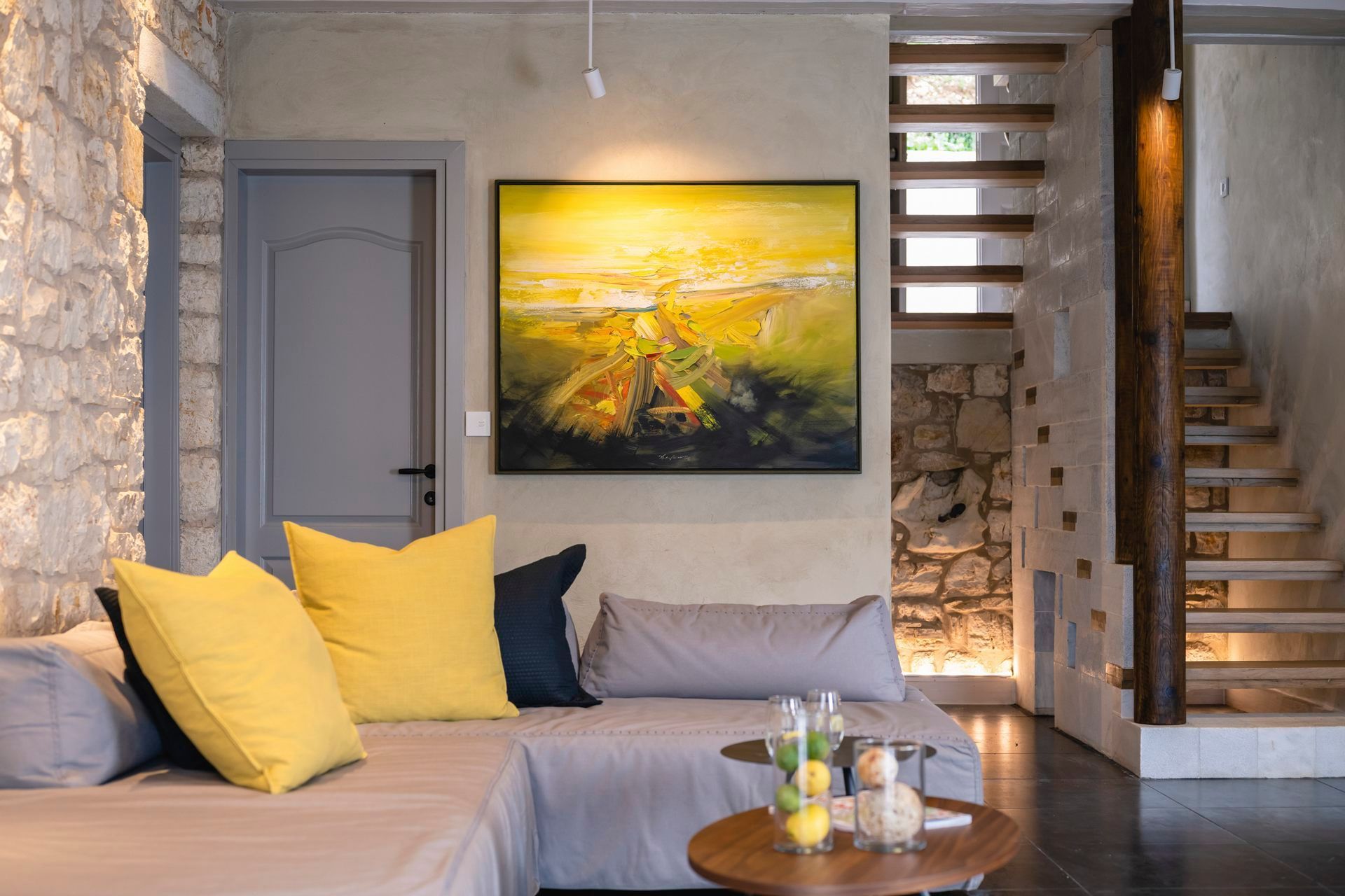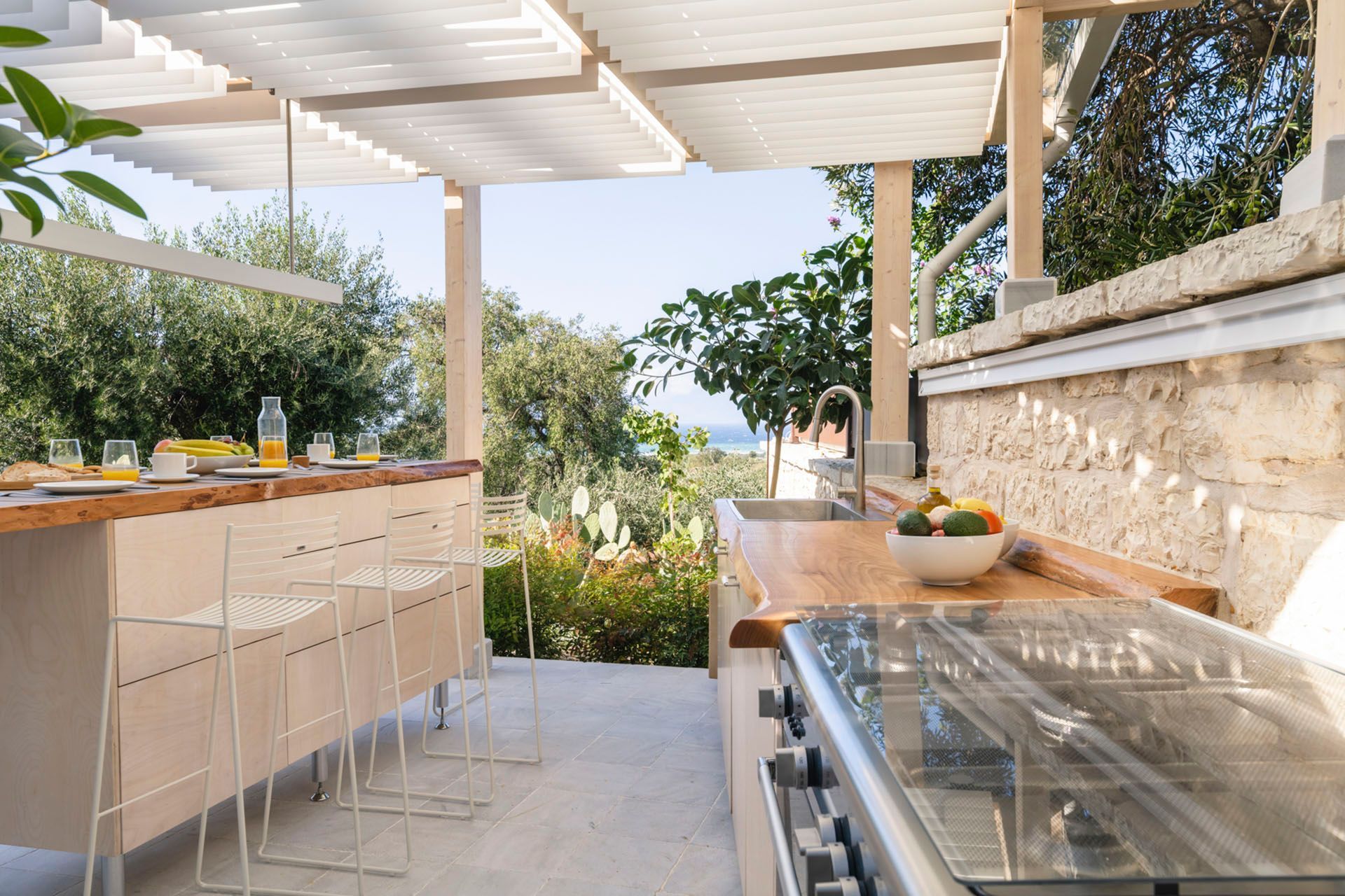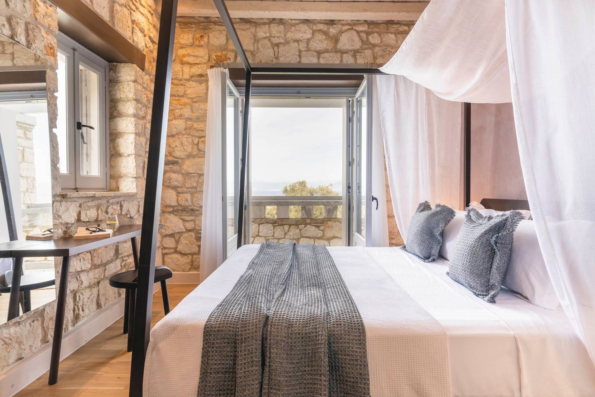 Indoors, the villa has a clean, composed identity shaped by stone, wood, and a light, restrained palette. The living room, dining space, and kitchen all feel practical and connected, opening naturally toward the terrace. Bedrooms are quietly comfortable, with the two upstairs master rooms standing out for their sea-view balconies and slightly more secluded feel. Altogether, the house is thoughtful, functional, and refined.