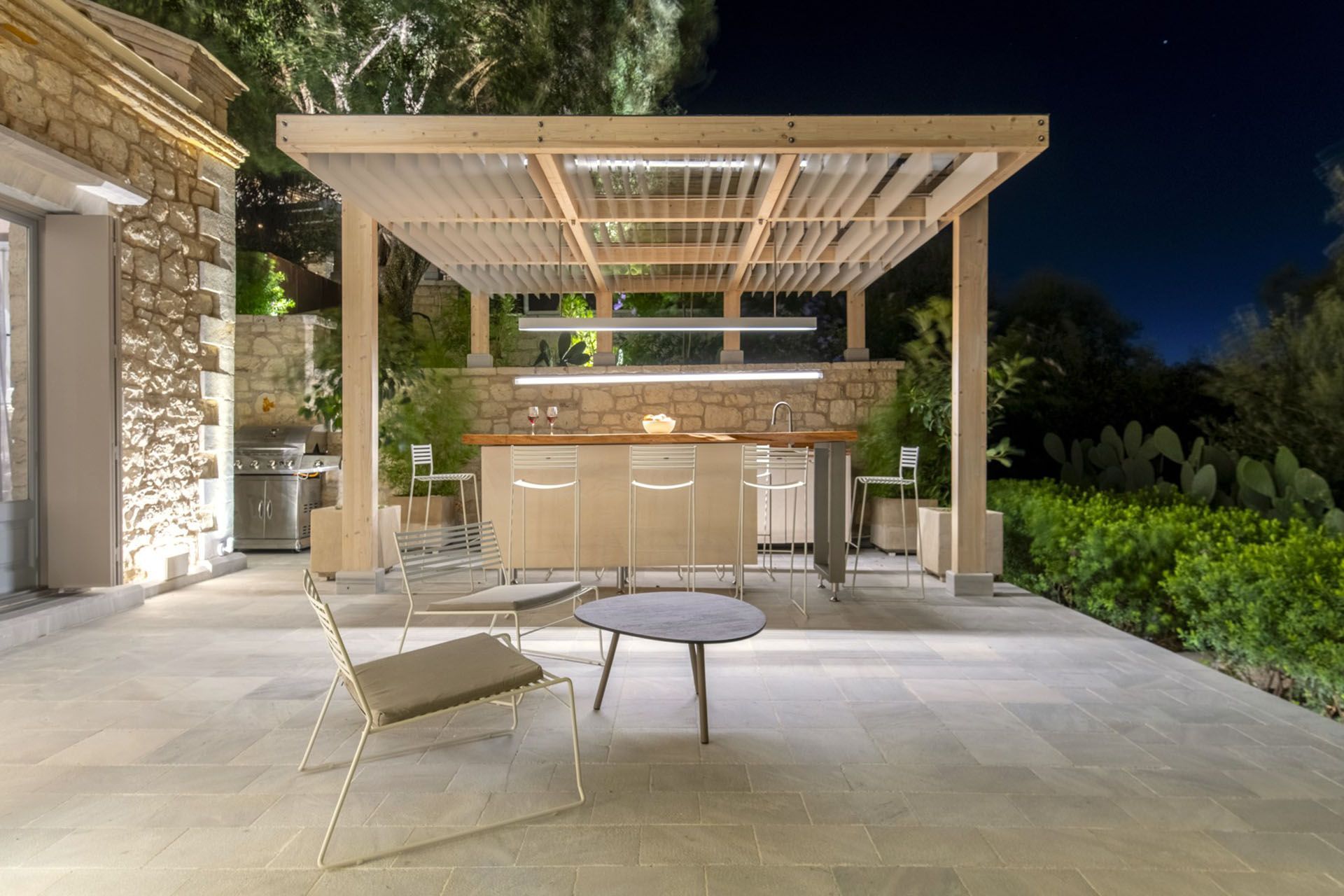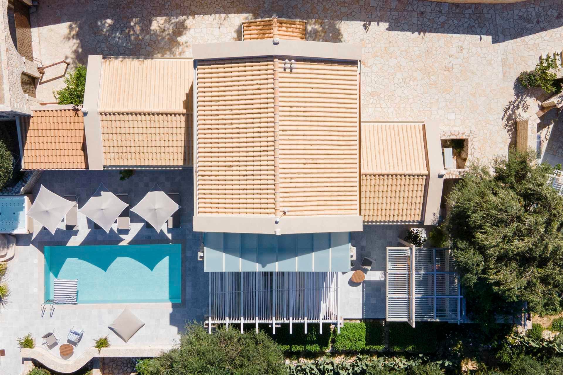 Outdoors, the pool sits at the heart of the terrace, the heated jacuzzi adds another place to unwind, and the outdoor kitchen lets the alfresco area carry most of the day with very little effort. There is enough seating and shade to keep the group outside from morning to evening, while the garden creates privacy and helps preserve the calm atmosphere. Guests who like a more active routine will also appreciate the outdoor fitness equipment available.