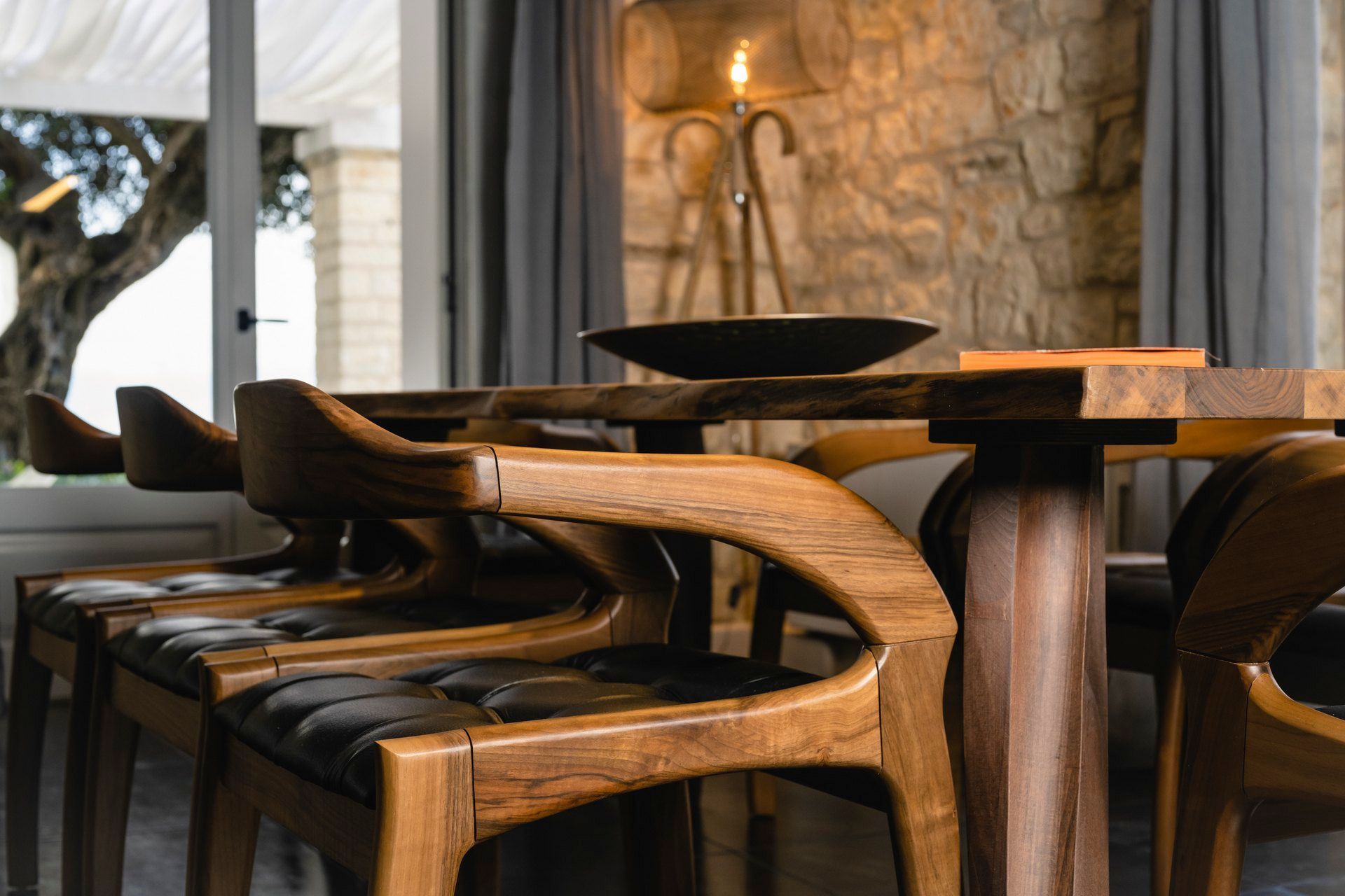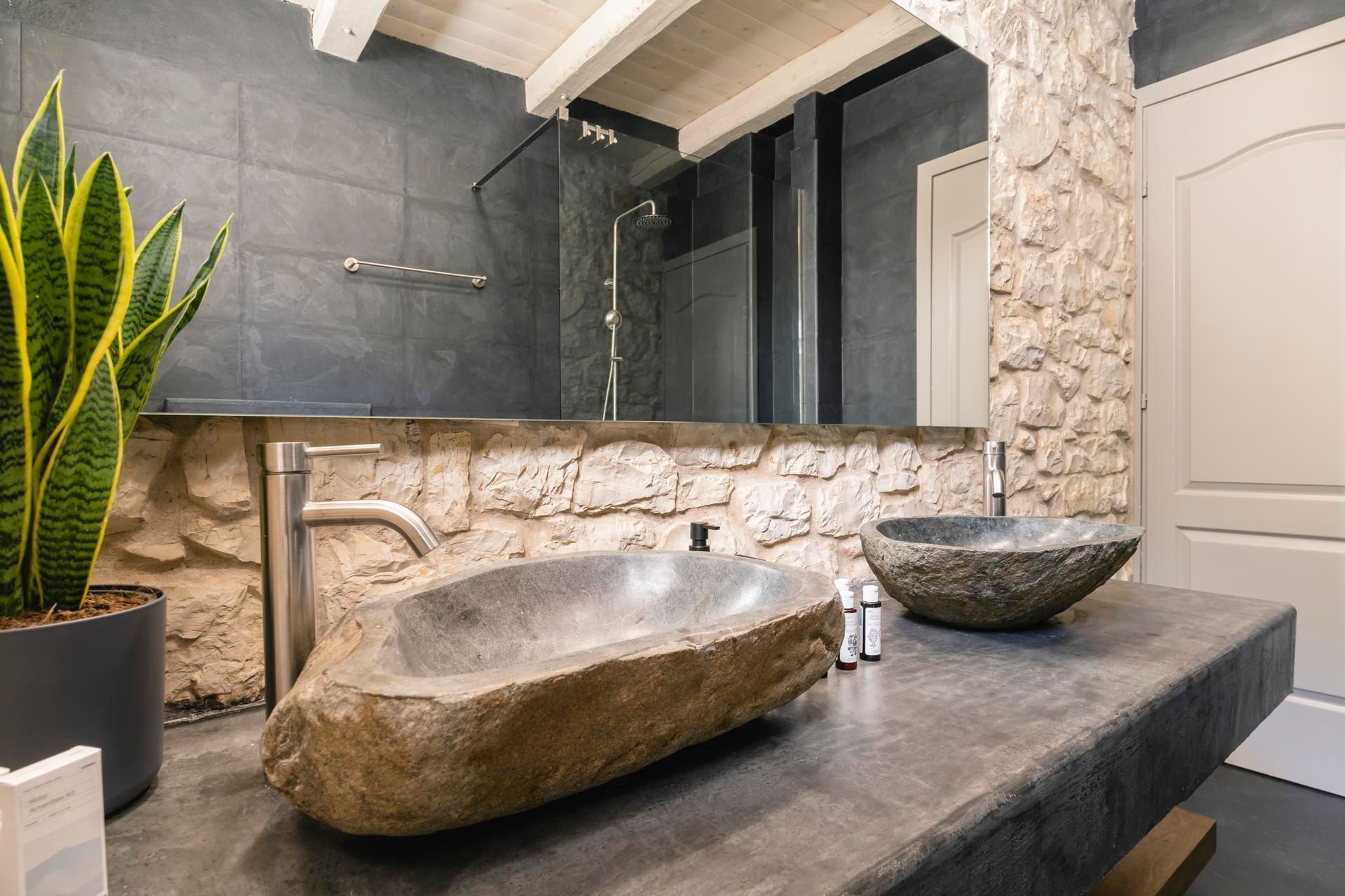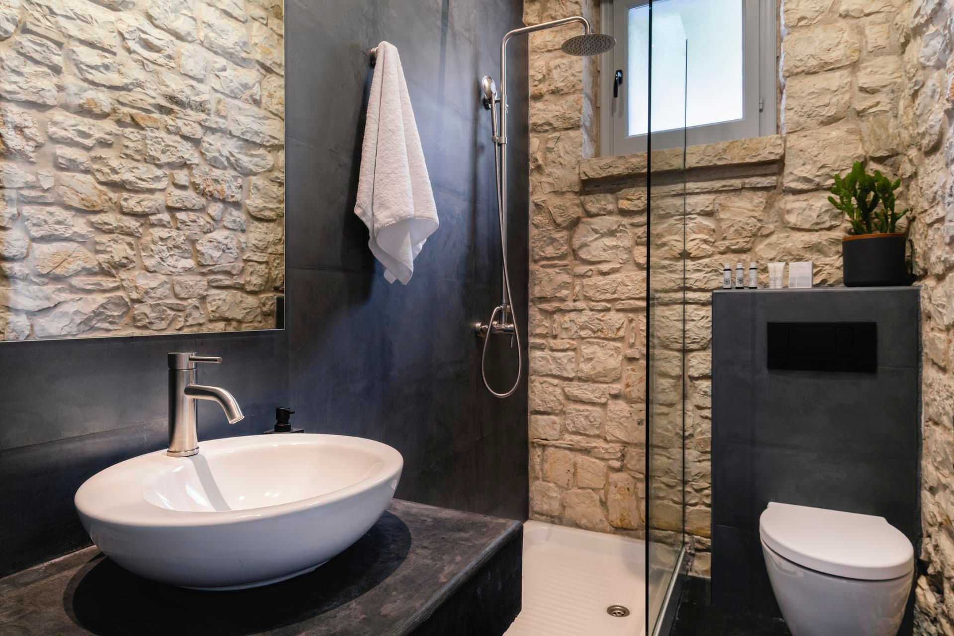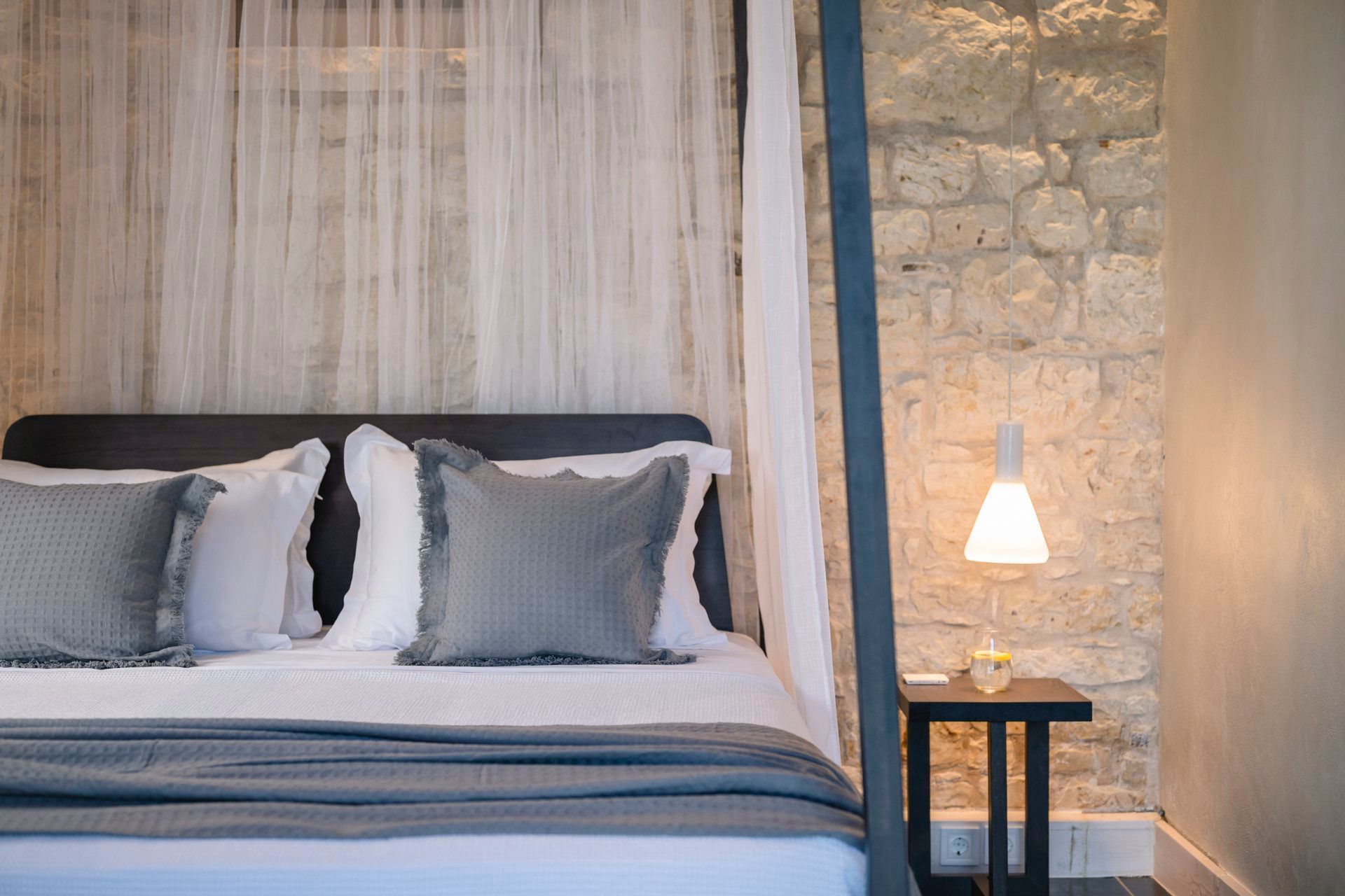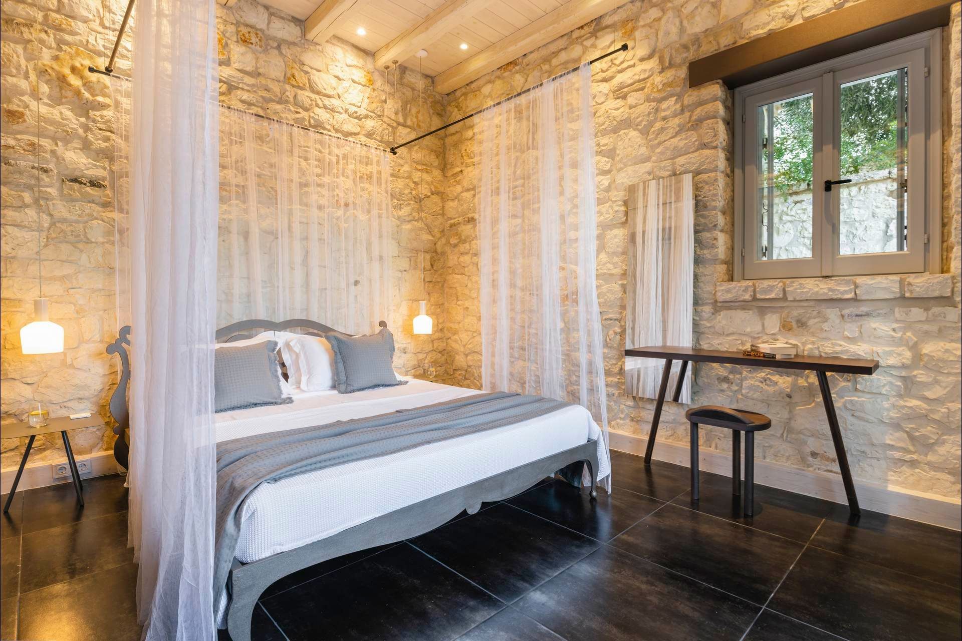 Inside, the contrast between surfaces defines the space. Rough stone, smooth plaster, timber ceilings, and dark flooring create a layered interior that feels considered and rooted in local design. The main living area stays open-plan and connected, while the bedrooms shift in tone depending on their position in the house. The upper rooms feel lighter and more outward-facing, while the lower level stays quieter and more contained.