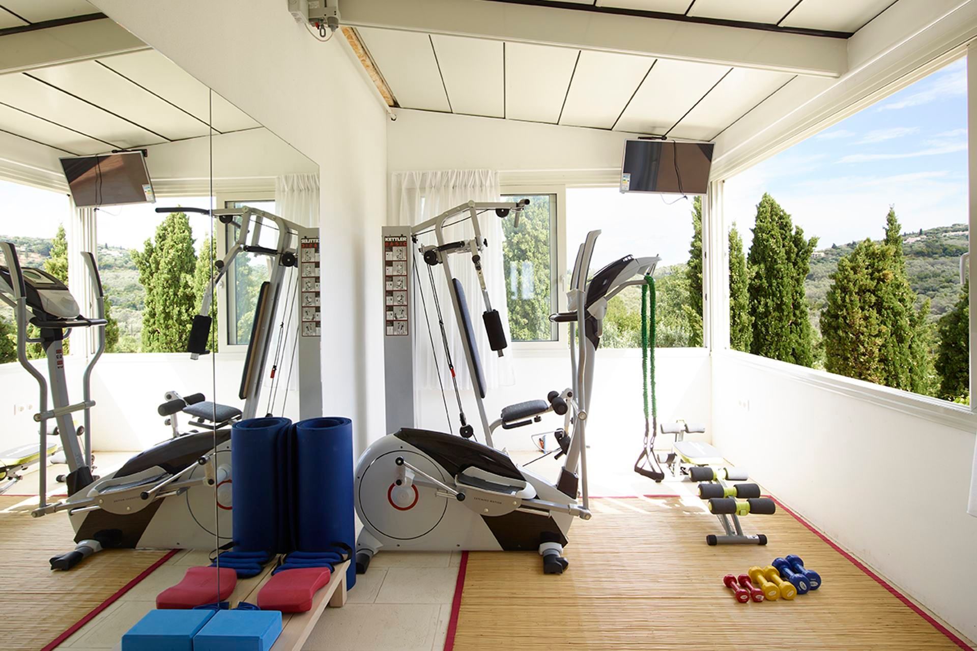 Fitness area with treadmill, elliptical trainer, multi gym, A/C, smart TV, mountain view