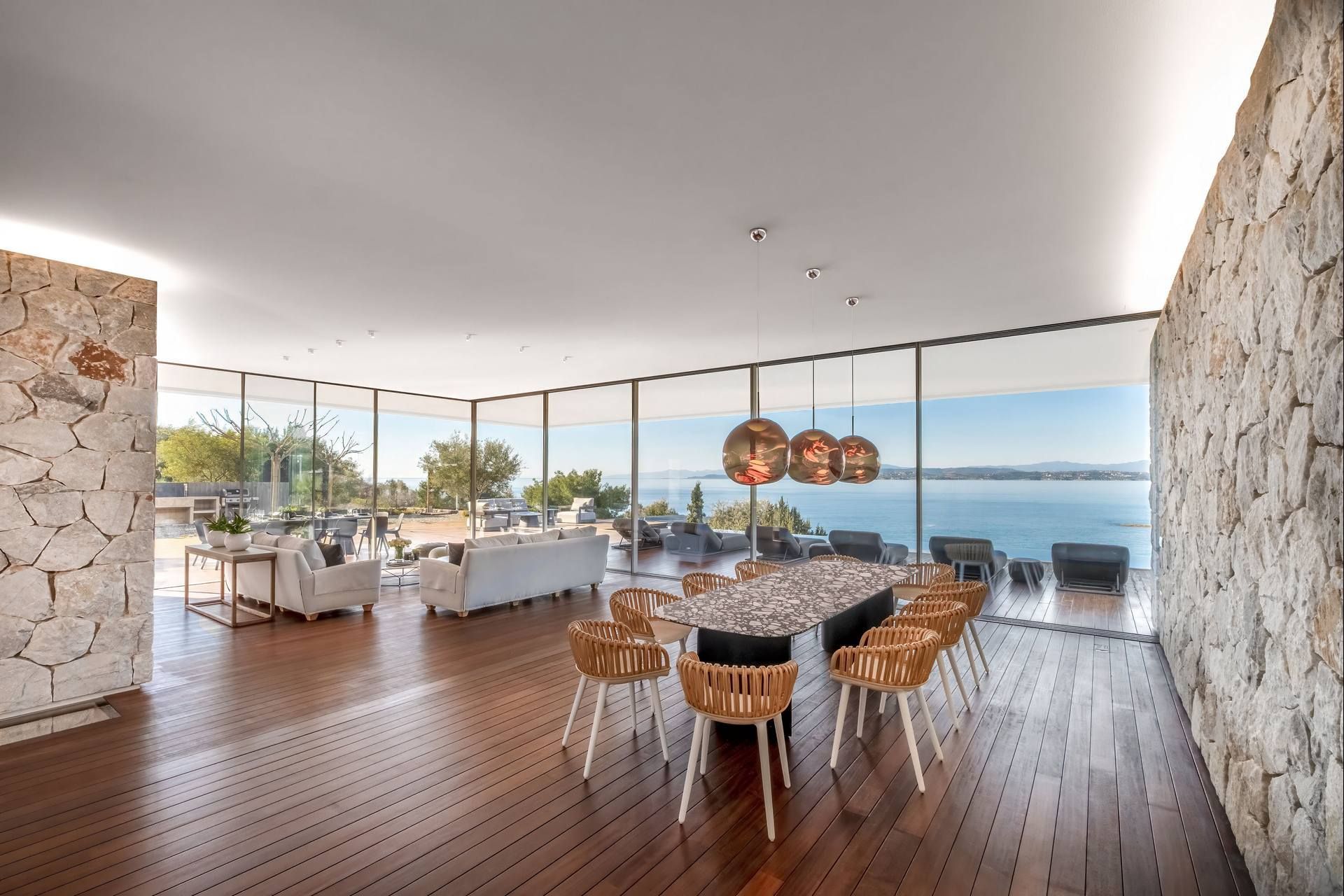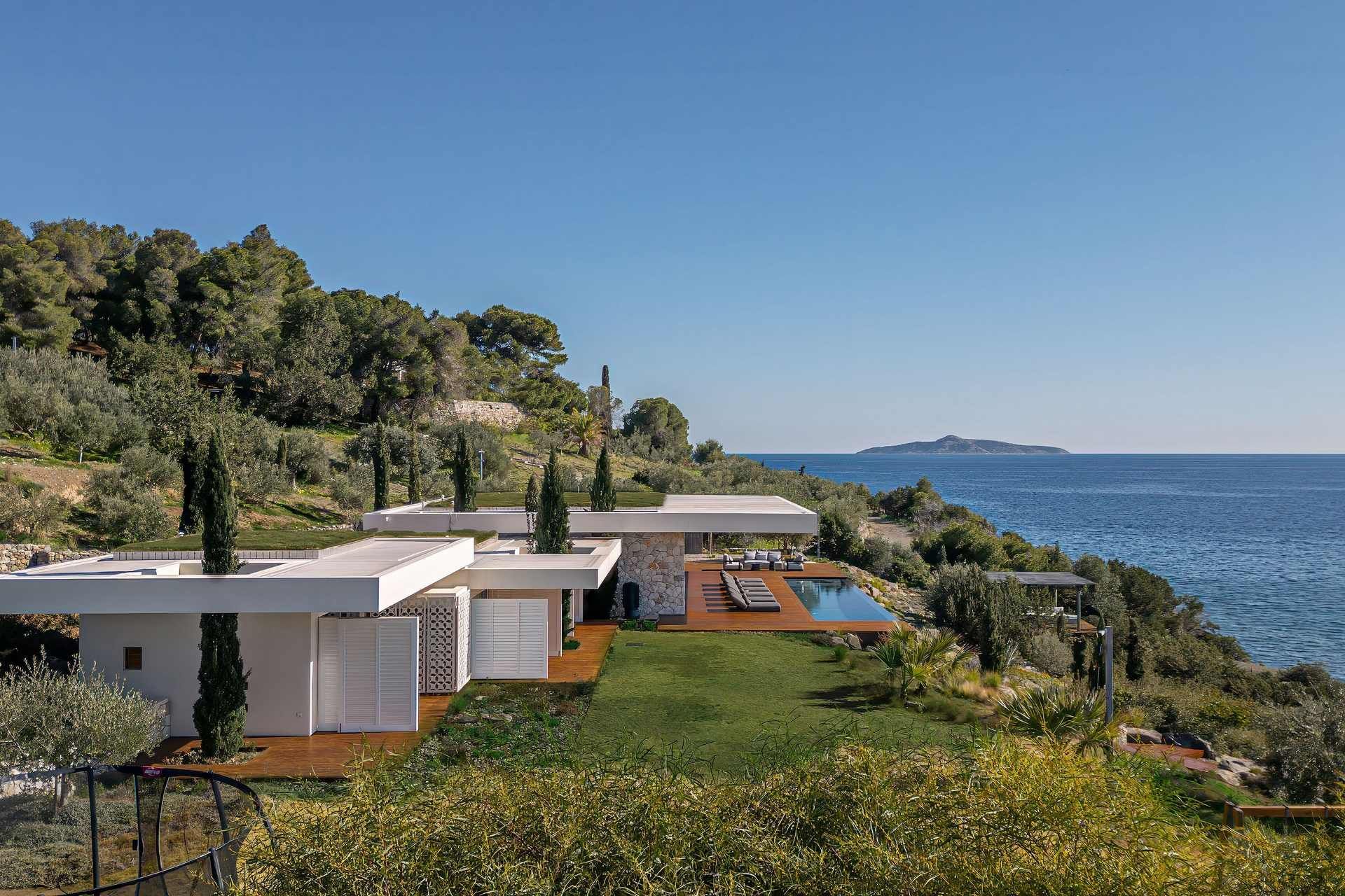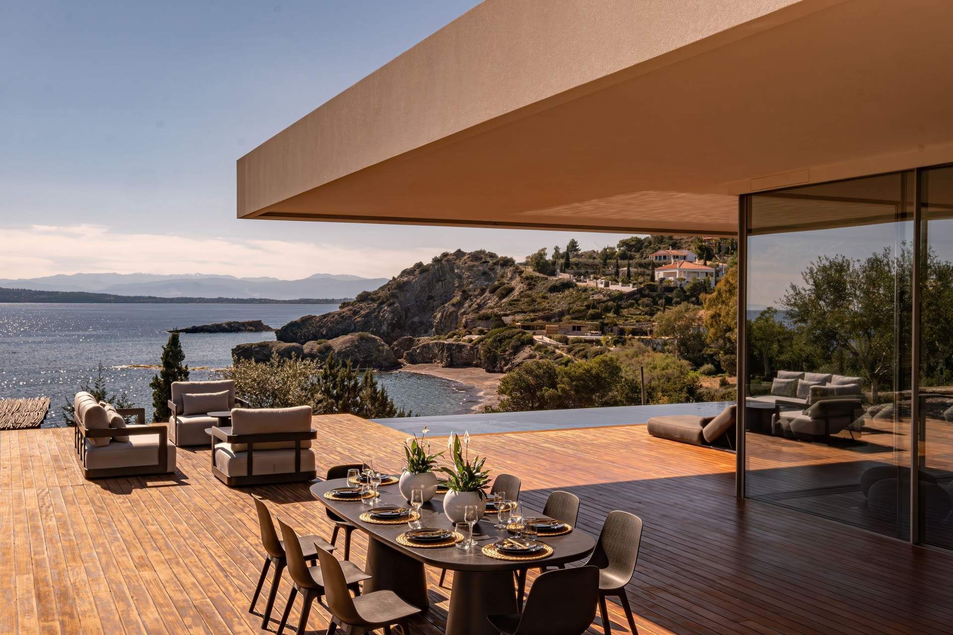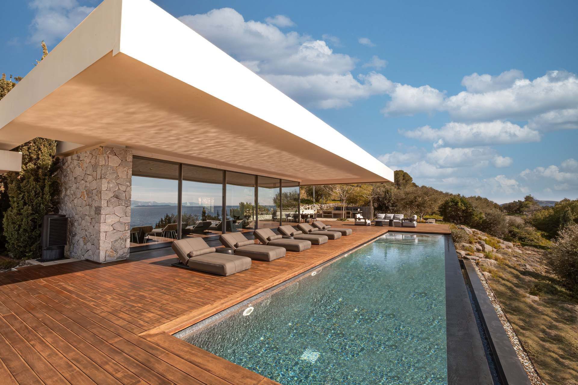 Bayleaf is a luxury Peloponnese villa defined by light, seclusion, and a powerful relationship to the horizon. Located on the waterfront in Ermioni, it accommodates up to six guests in three ensuite bedrooms and combines direct beach access with uninterrupted sea views and an absolute sense of privacy. The materials are central to its identity, with glass, stone, and wood creating a structure that feels both precise and warm, contemporary in line but deeply rooted in the landscape around it.