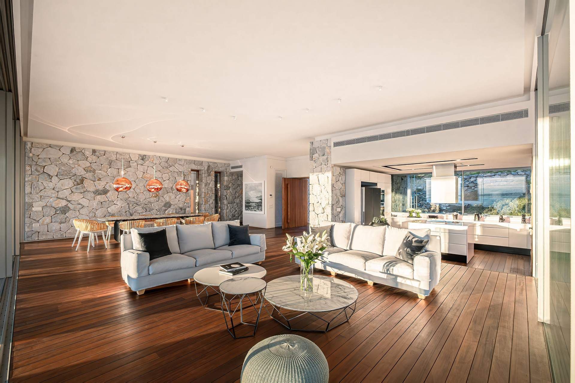 Open plan living area with access to pool terrace, sea view