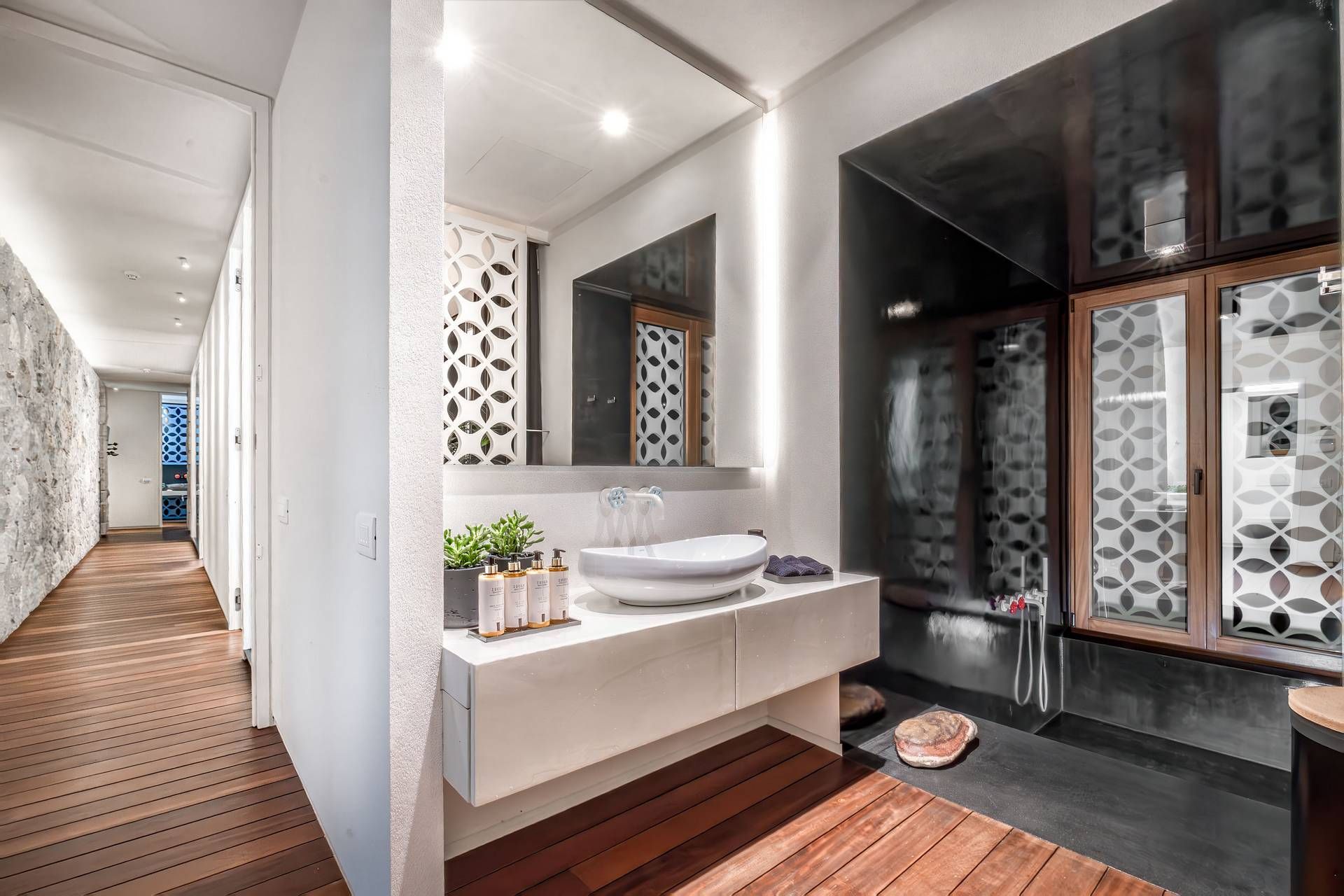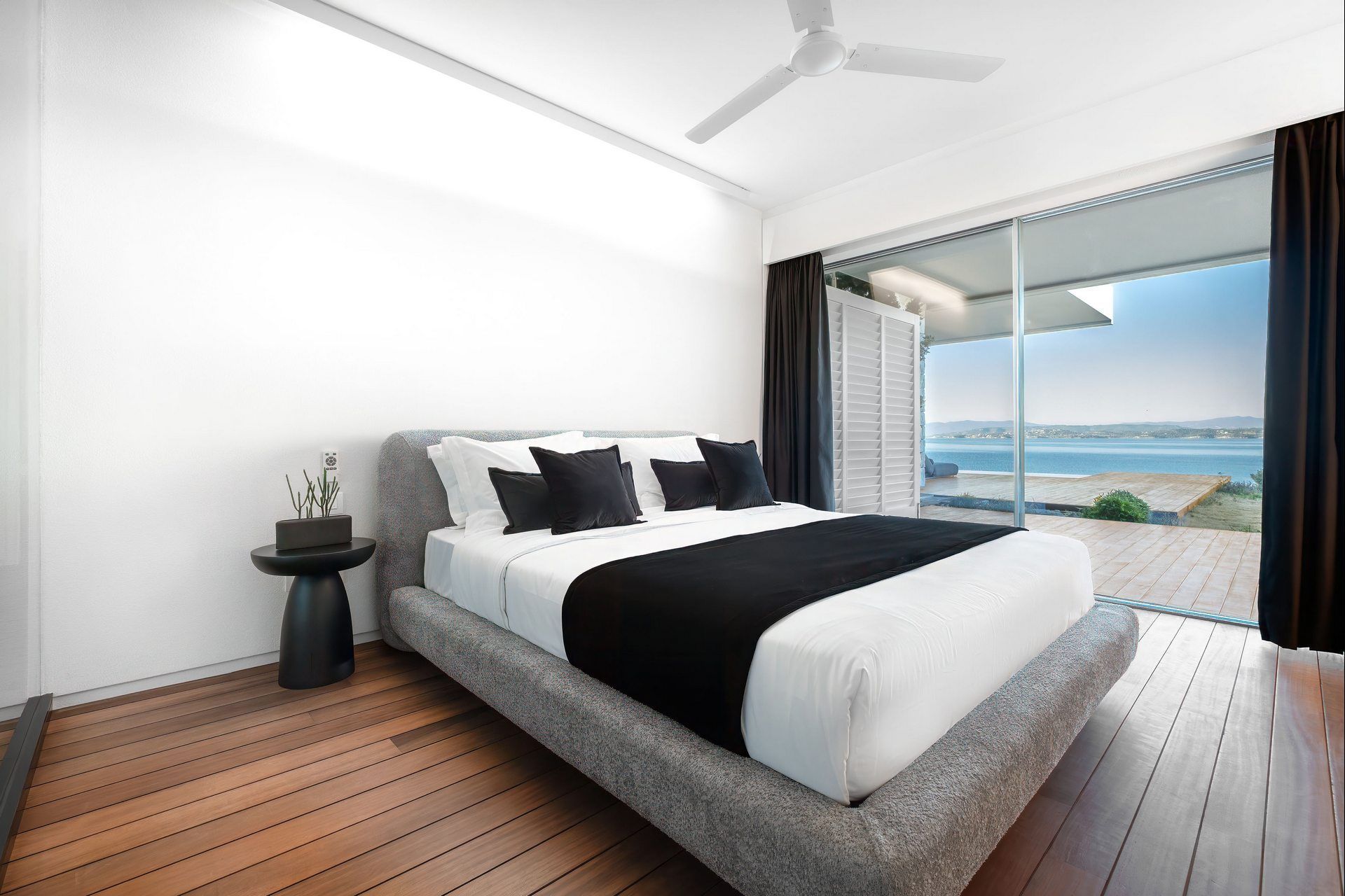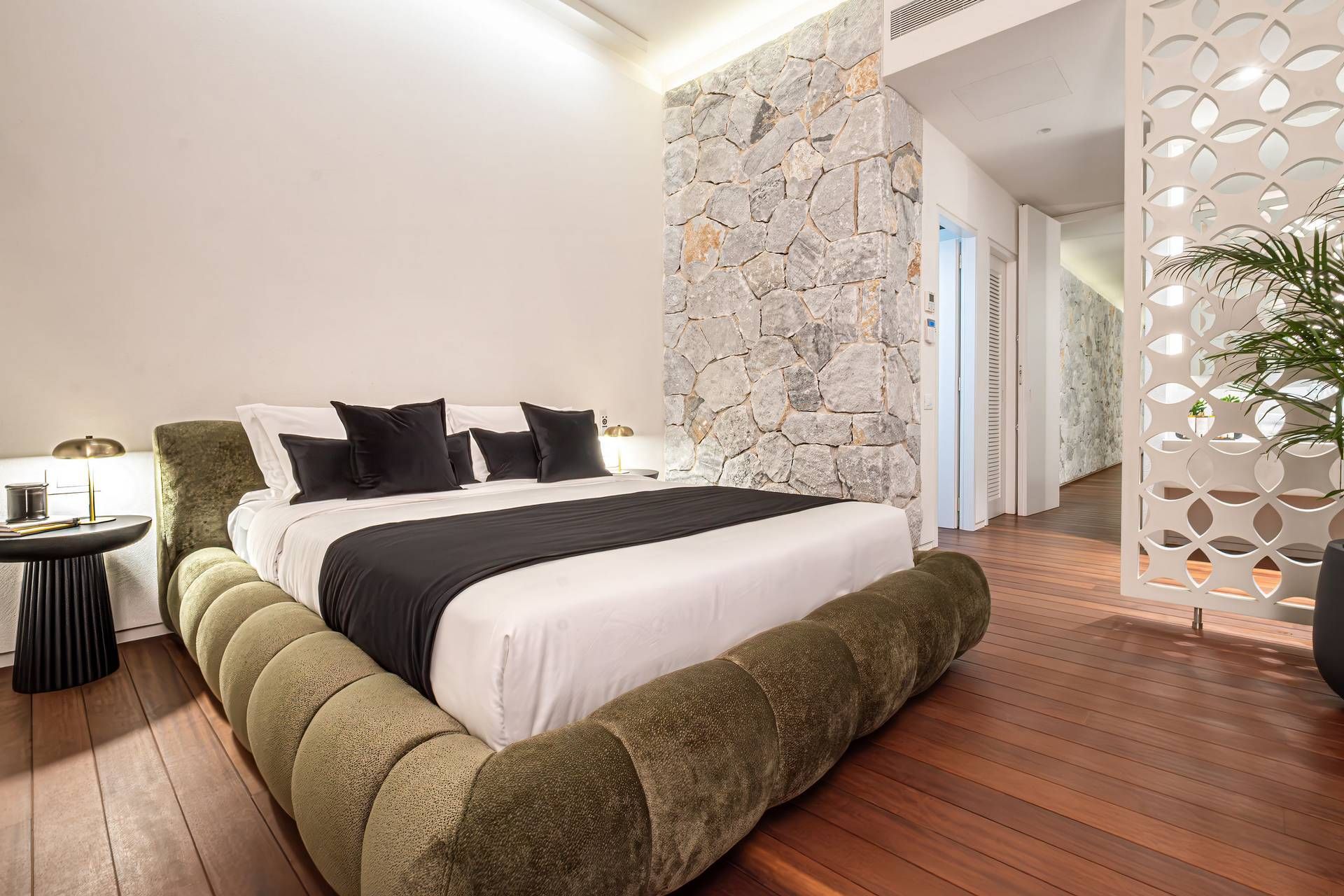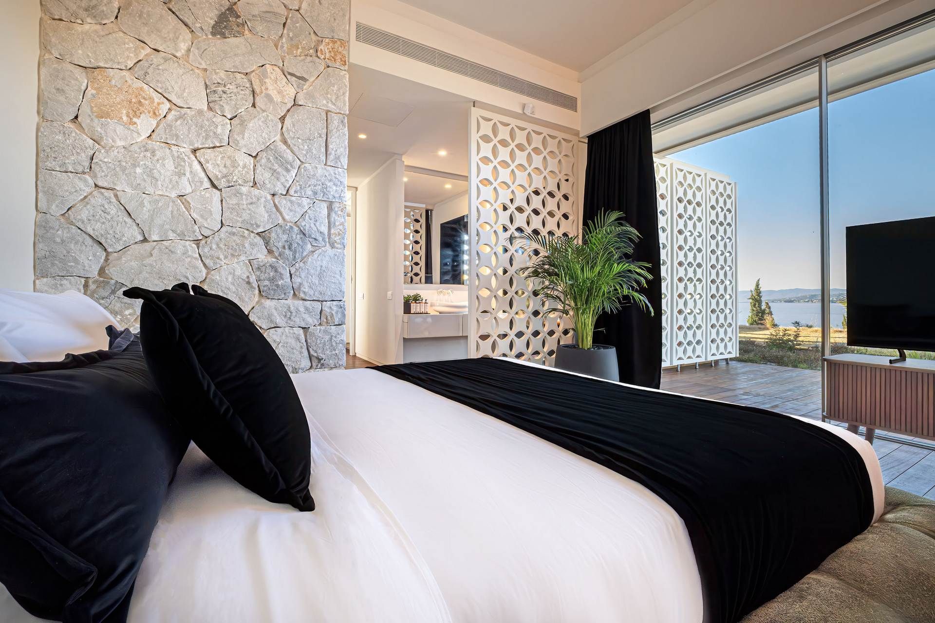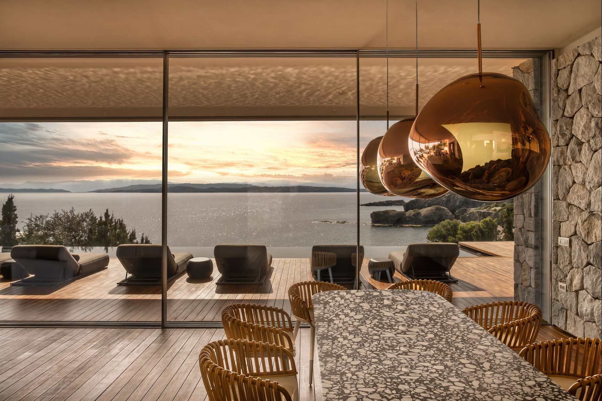 Inside, Villa Bayleaf follows a more restrained expression of luxury. The open-plan living room, dining area, and kitchen are designed as a single, sea-facing space with floor-to-ceiling windows inviting the landscape inward, always keeping the place bright and breezy. The bedrooms continue with that same atmosphere, each with its own bathroom, terrace access, and connection to the view. The interiors are elegant, but their strongest quality is their sense of calm and proportion.
