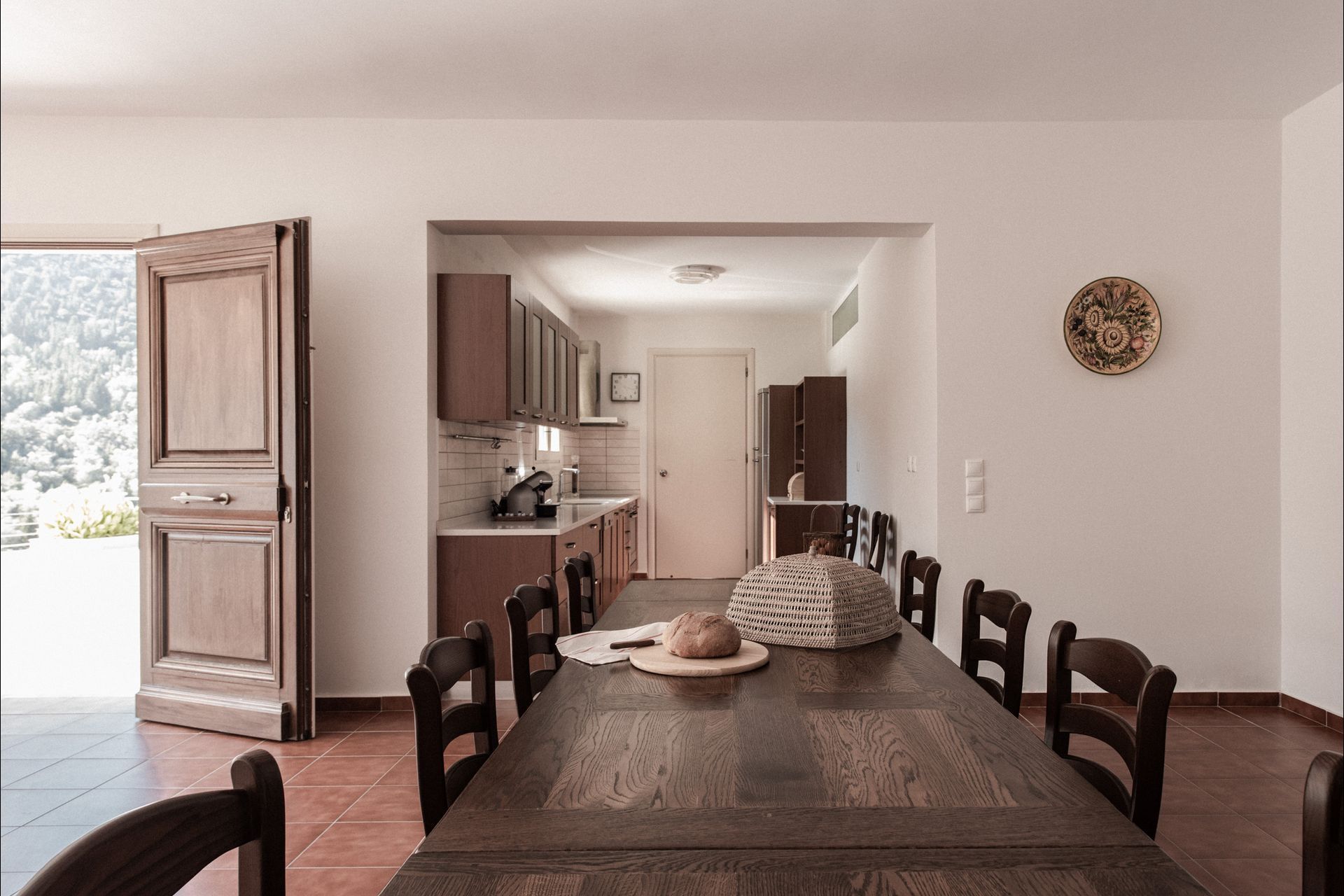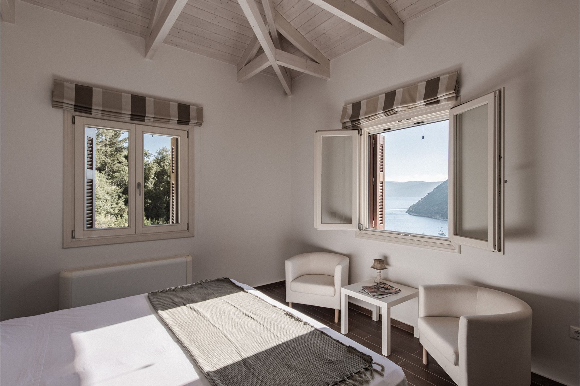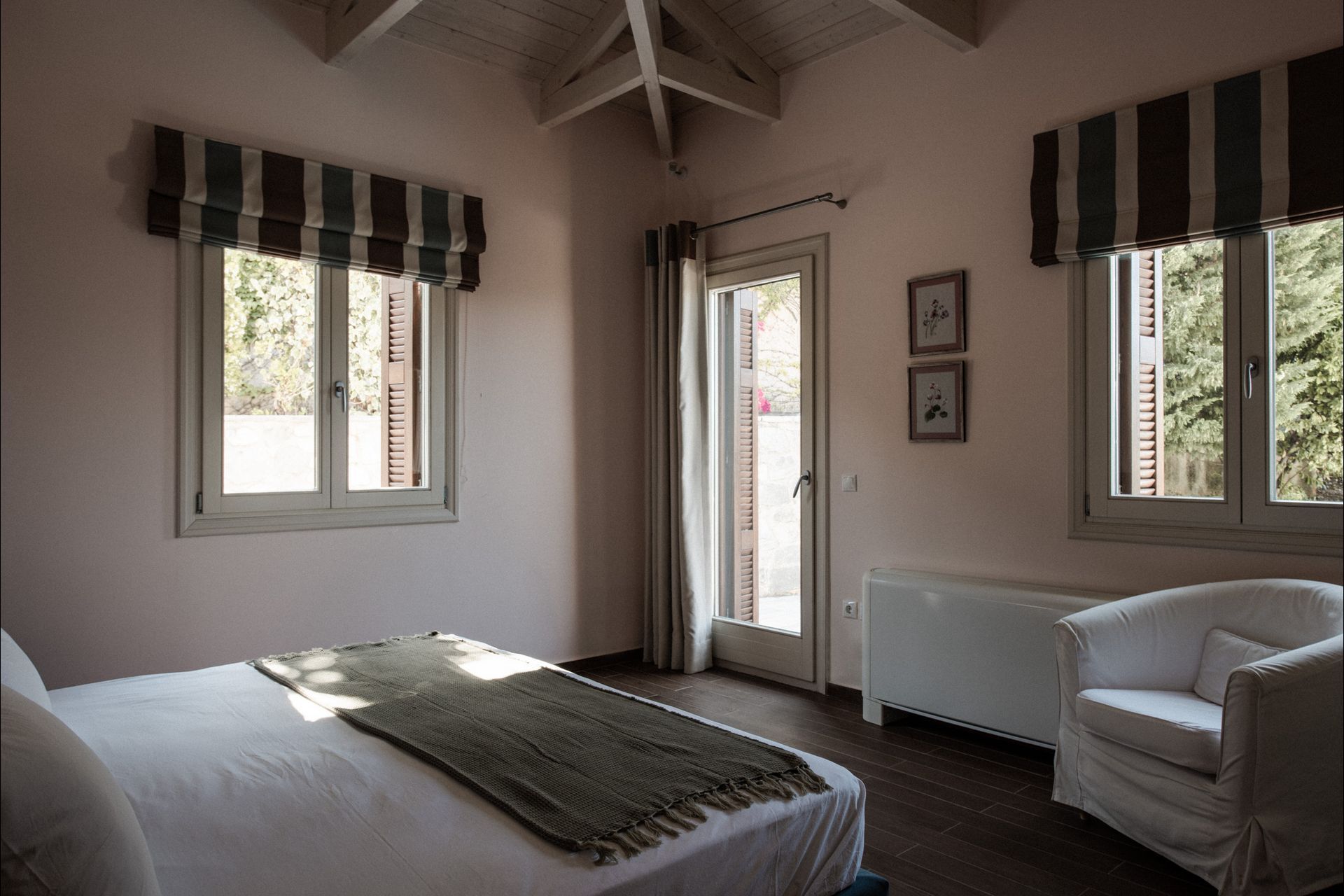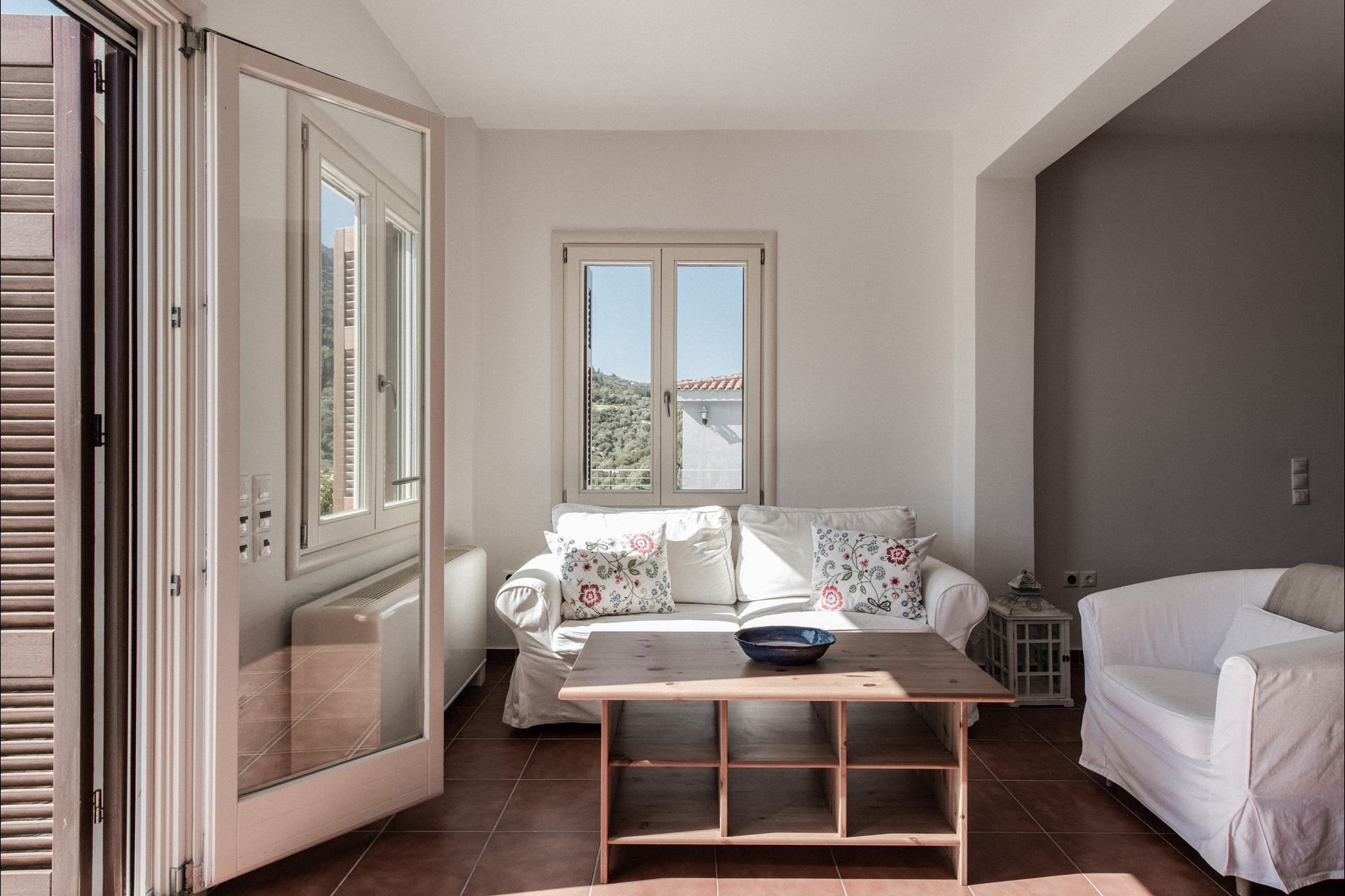 Perched on Ithaki’s northern side near Stavros, Villa Raspberry offers a secluded stay with the sea close by and the island’s greenery all around. It sleeps up to nine guests across four bedrooms and is laid out over two levels that feel comfortably independent. Two living and dining areas, along with two fully equipped kitchens, make the villa especially easy for families, couples traveling together, or groups who appreciate a little separation. The style is calm and local, with the view remaining the main feature throughout.