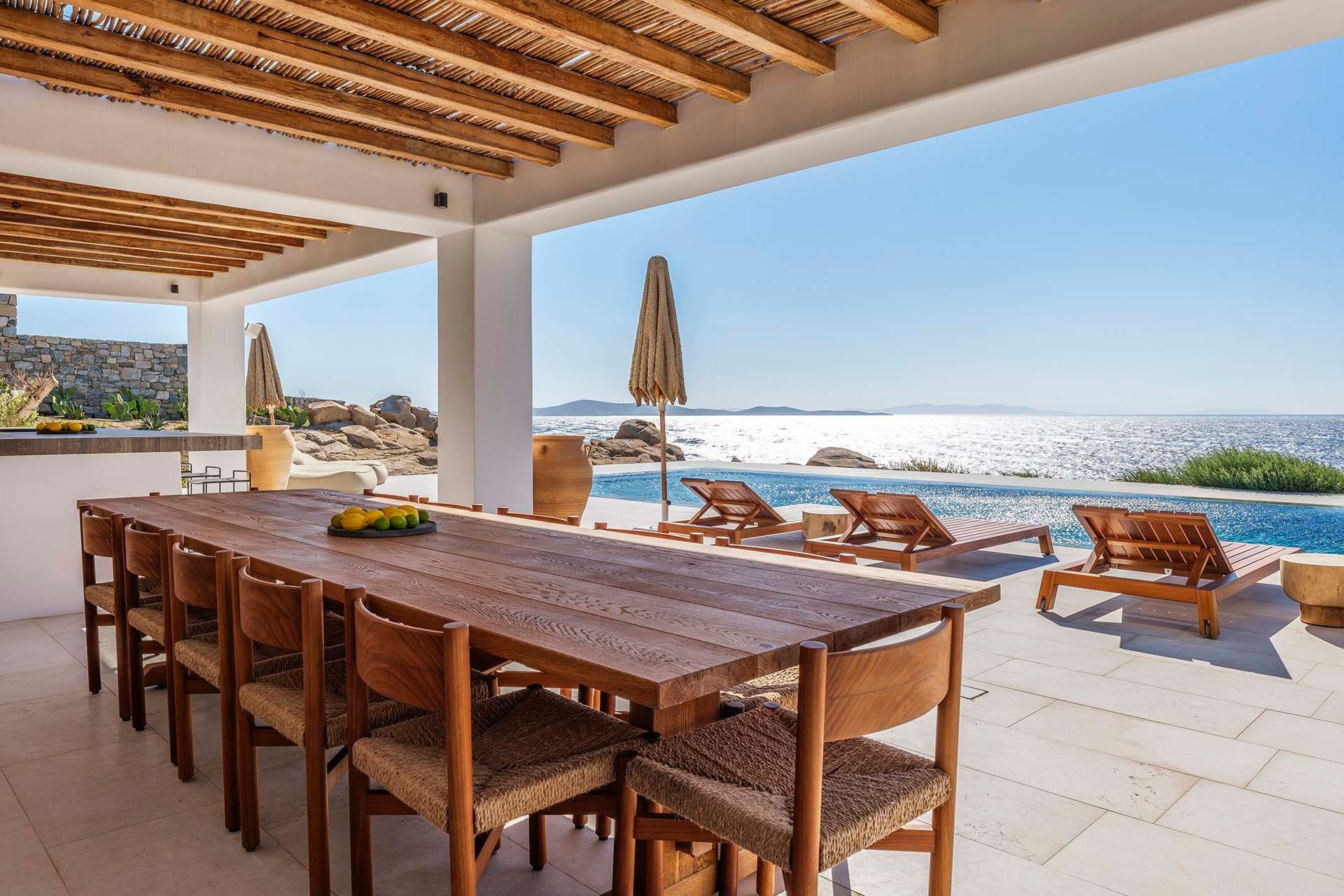 A large pool, heated on request, sits along the edge of the terrace and looks straight out to the sea, while the heated jacuzzi and surrounding loungers extend that feeling of openness. The covered outdoor living area is especially comfortable, with the timber pergola, oversized seating, and long dining table giving the villa a softer, more beach house vibe. Add the pool bar, pizza oven, charcoal barbecue, and direct access to the private beach below, and the whole outdoor setup begins to feel complete.