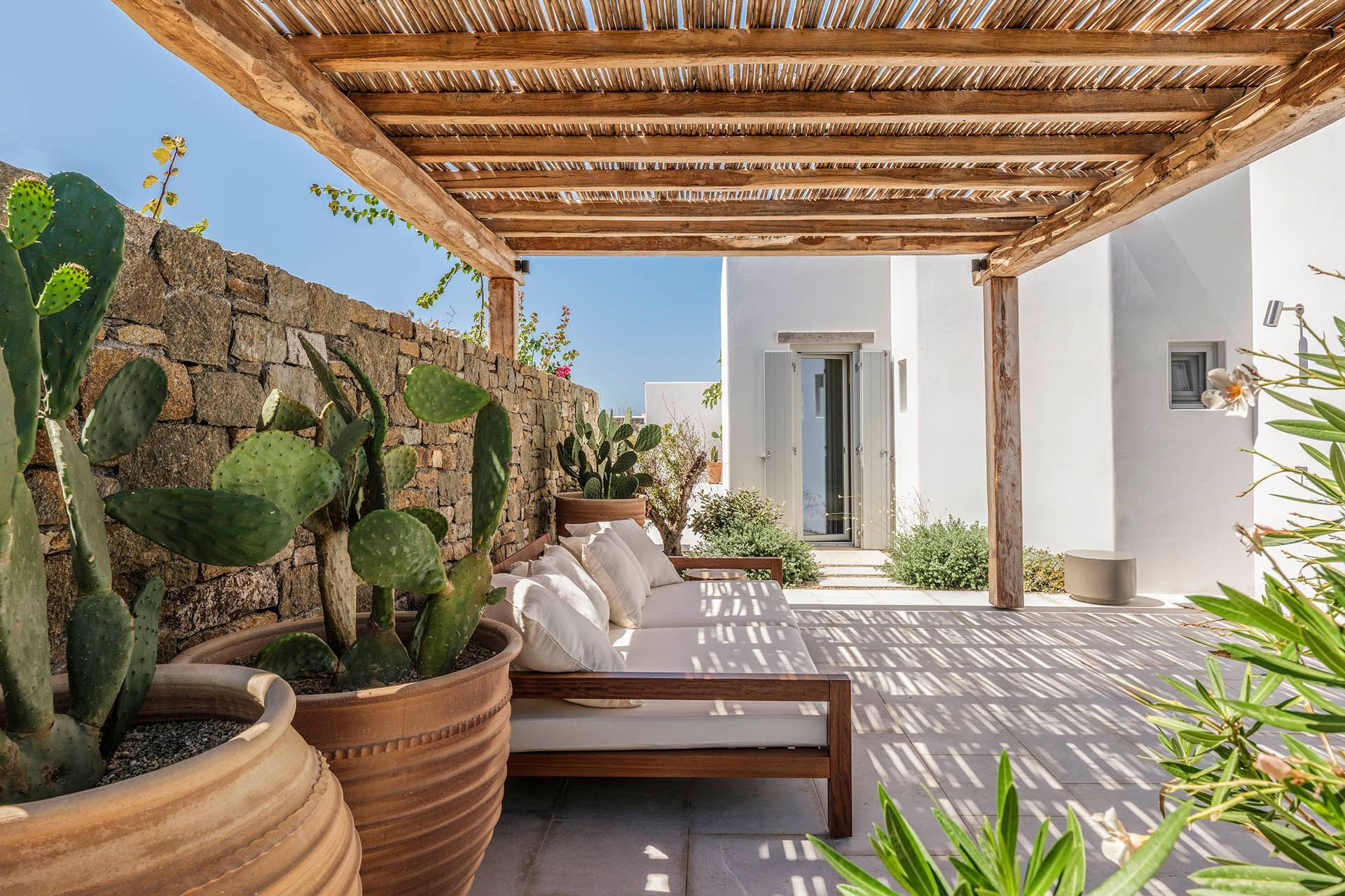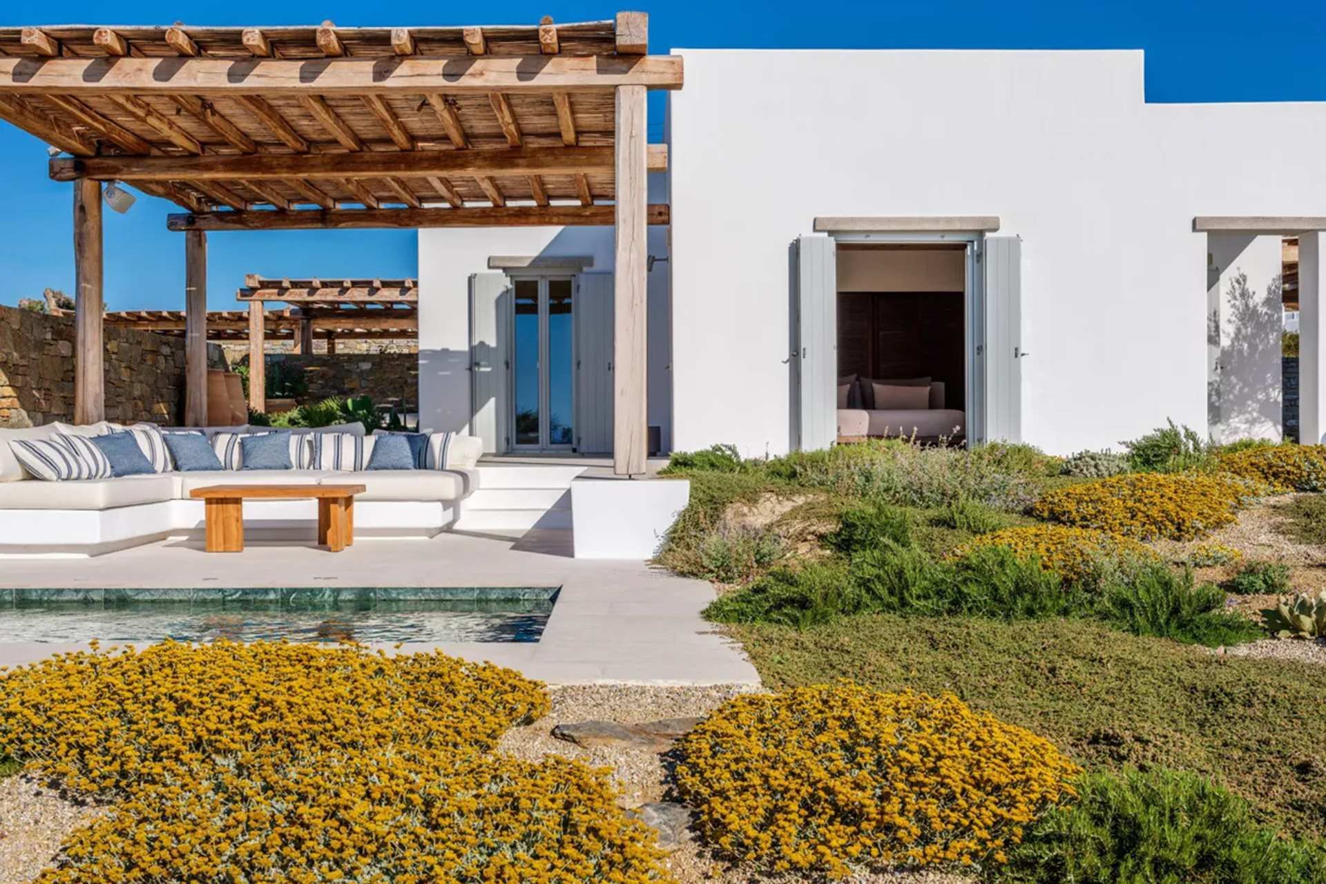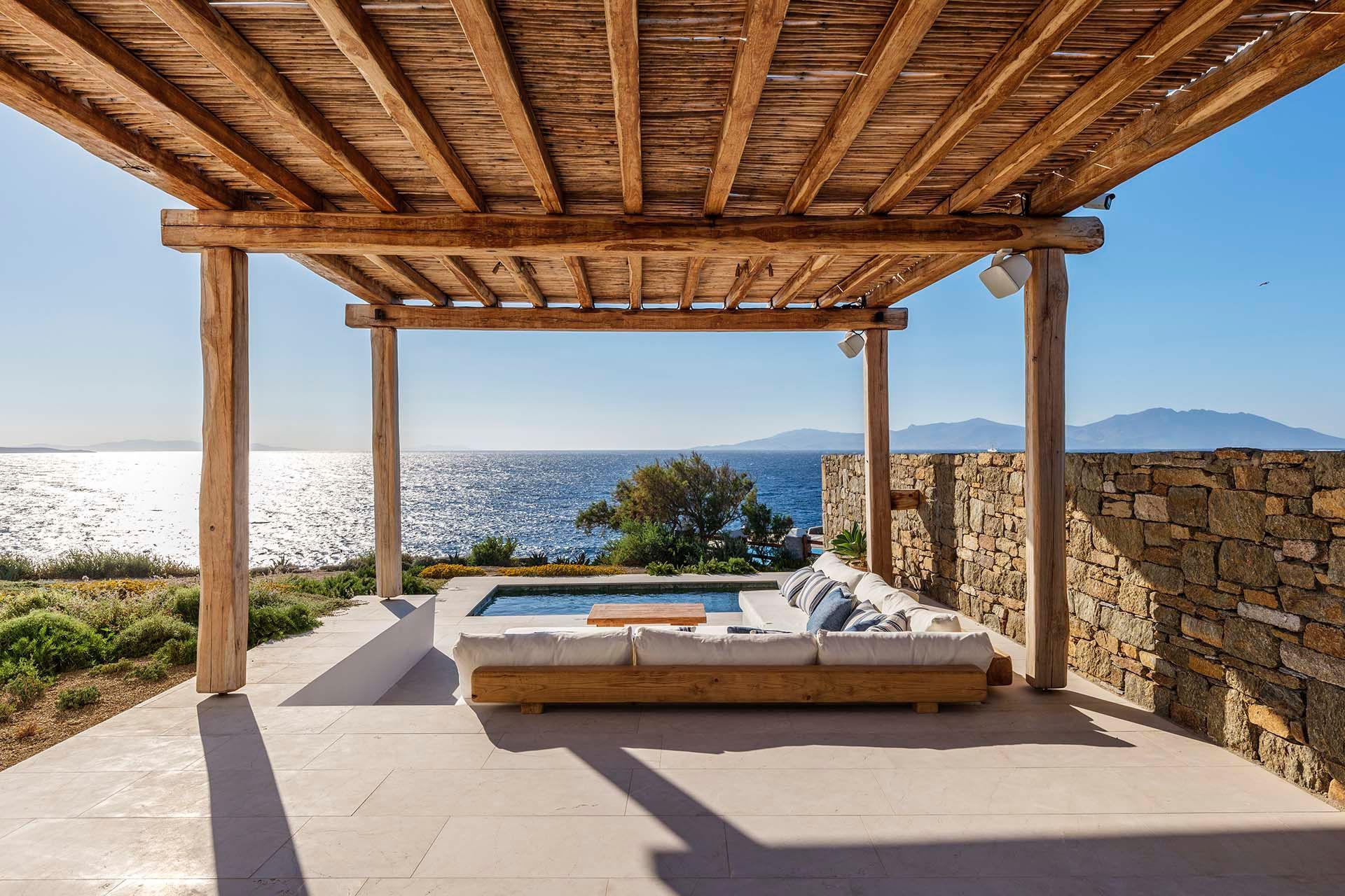 Open to the southwest and looking across the Aegean, villa Bellatrix hosts up to eight guests in four ensuite bedrooms and brings together one of Mykonos’ most compelling combinations: privacy, sunset views, and direct access to the sea below. The design is contemporary, but softened by timber pergolas, stone accents, and warm natural finishes, which give the house a more grounded and enduring character than many newly built Mykonos luxury villas.
