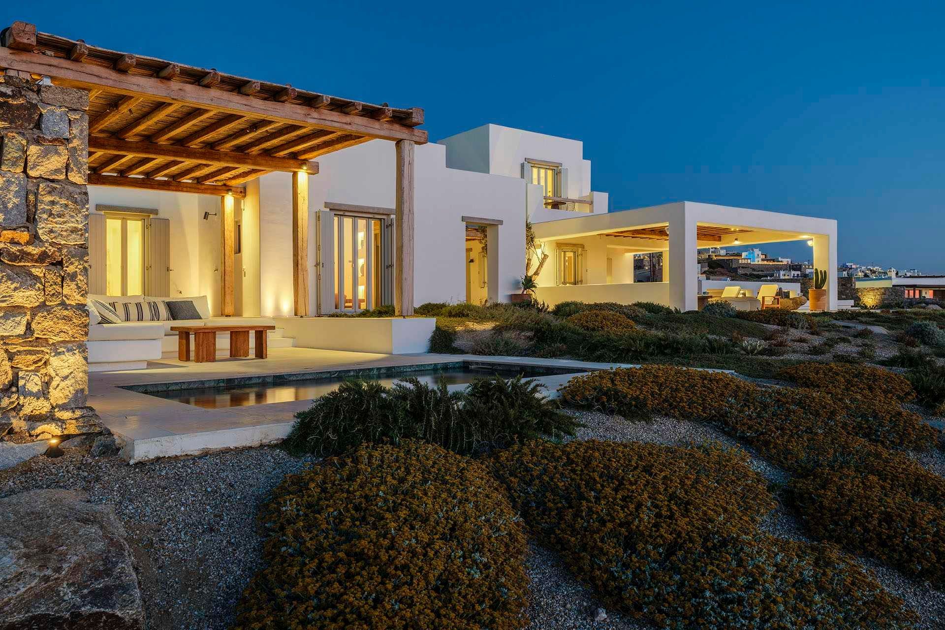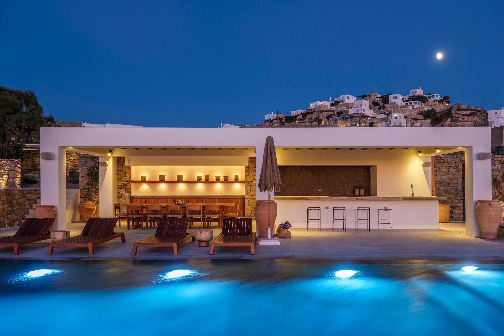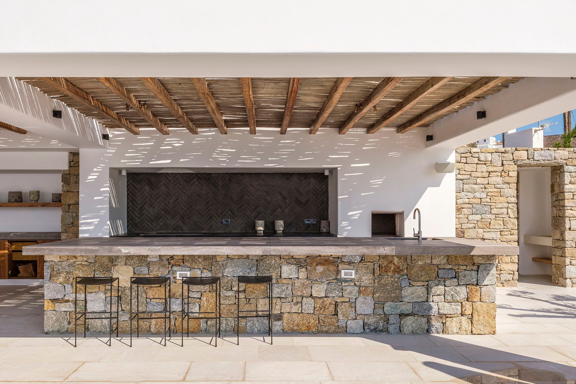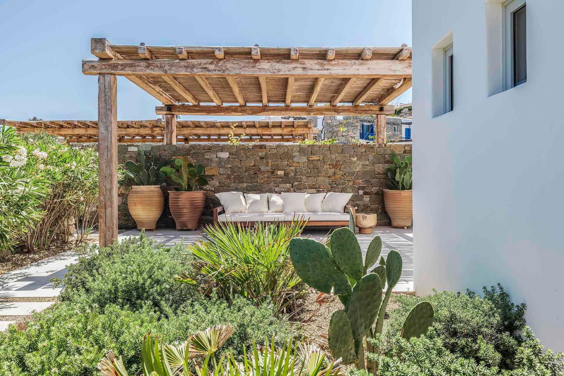 Open to the southwest and looking across the Aegean, villa Bellatrix hosts up to eight guests in four ensuite bedrooms and brings together one of Mykonos’ most compelling combinations: privacy, sunset views, and direct access to the sea below. The design is contemporary, but softened by timber pergolas, stone accents, and warm natural finishes, which give the house a more grounded and enduring character than many newly built Mykonos luxury villas.