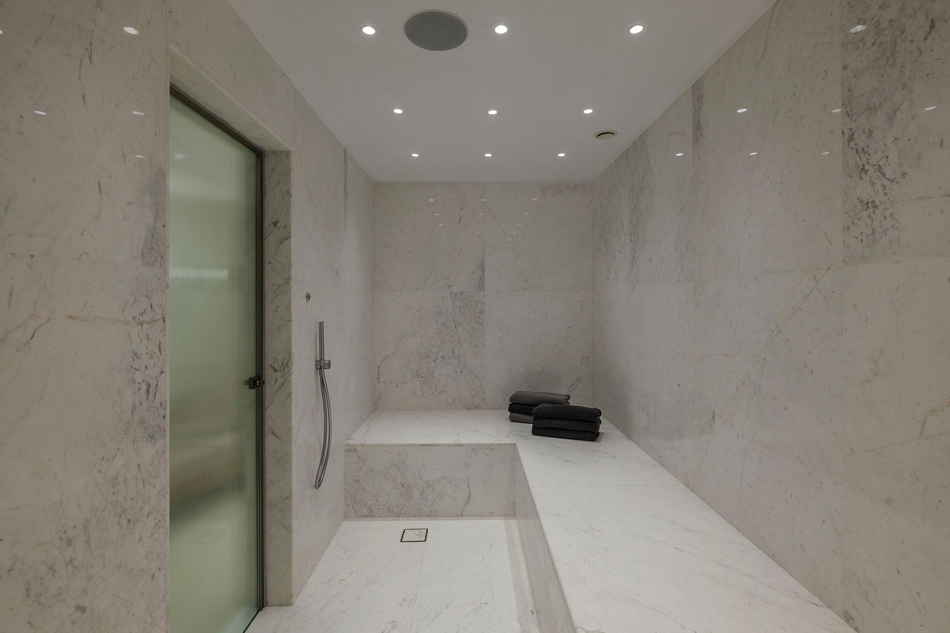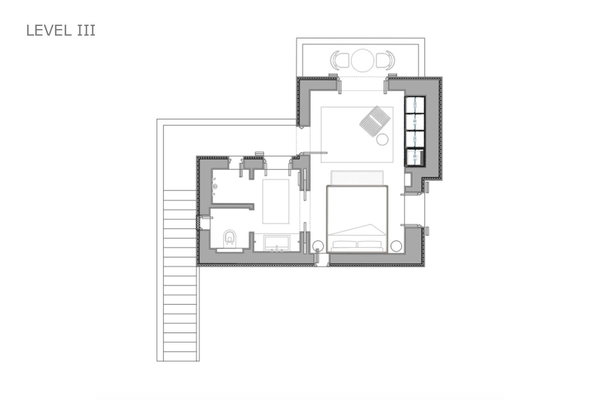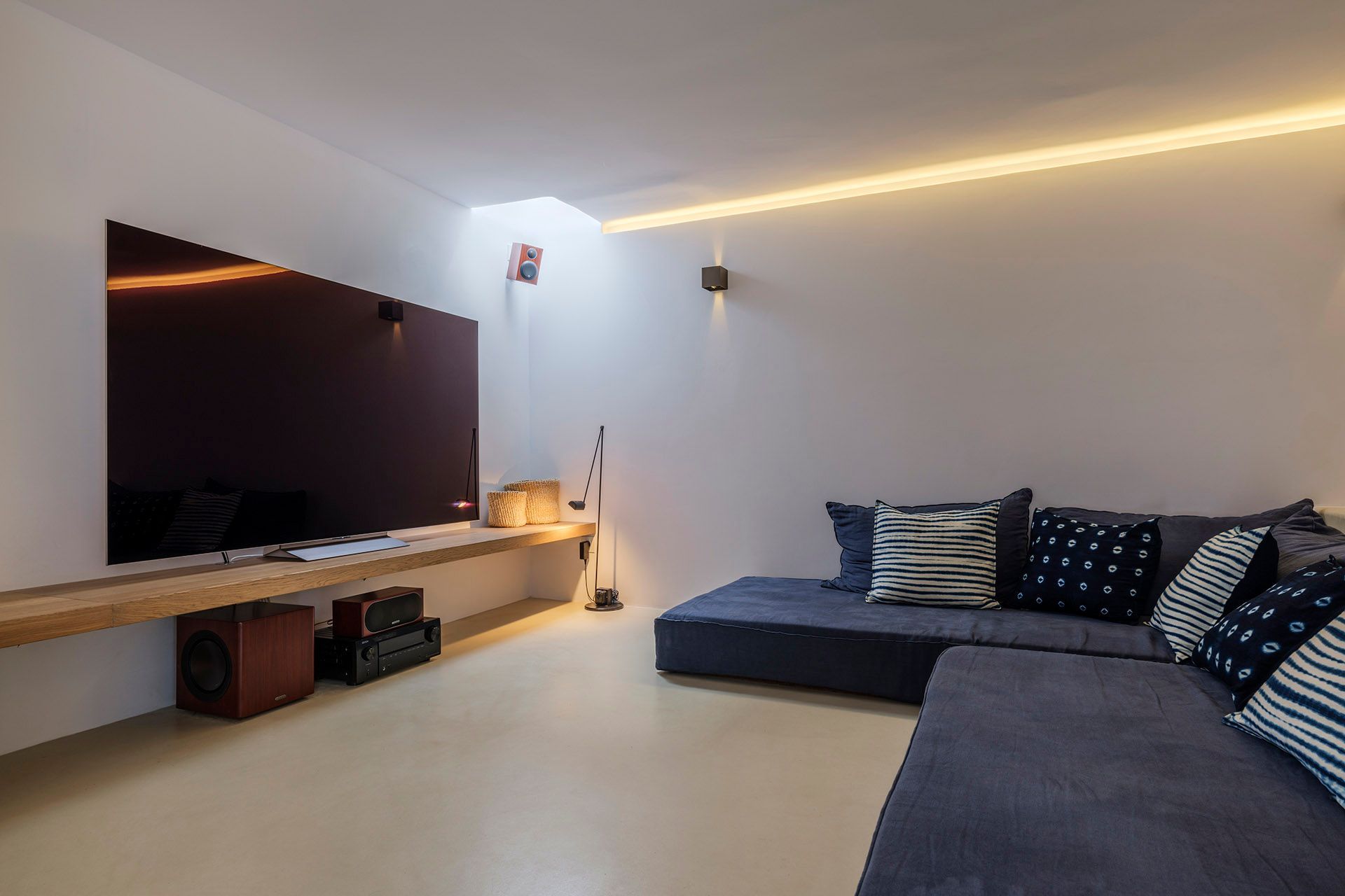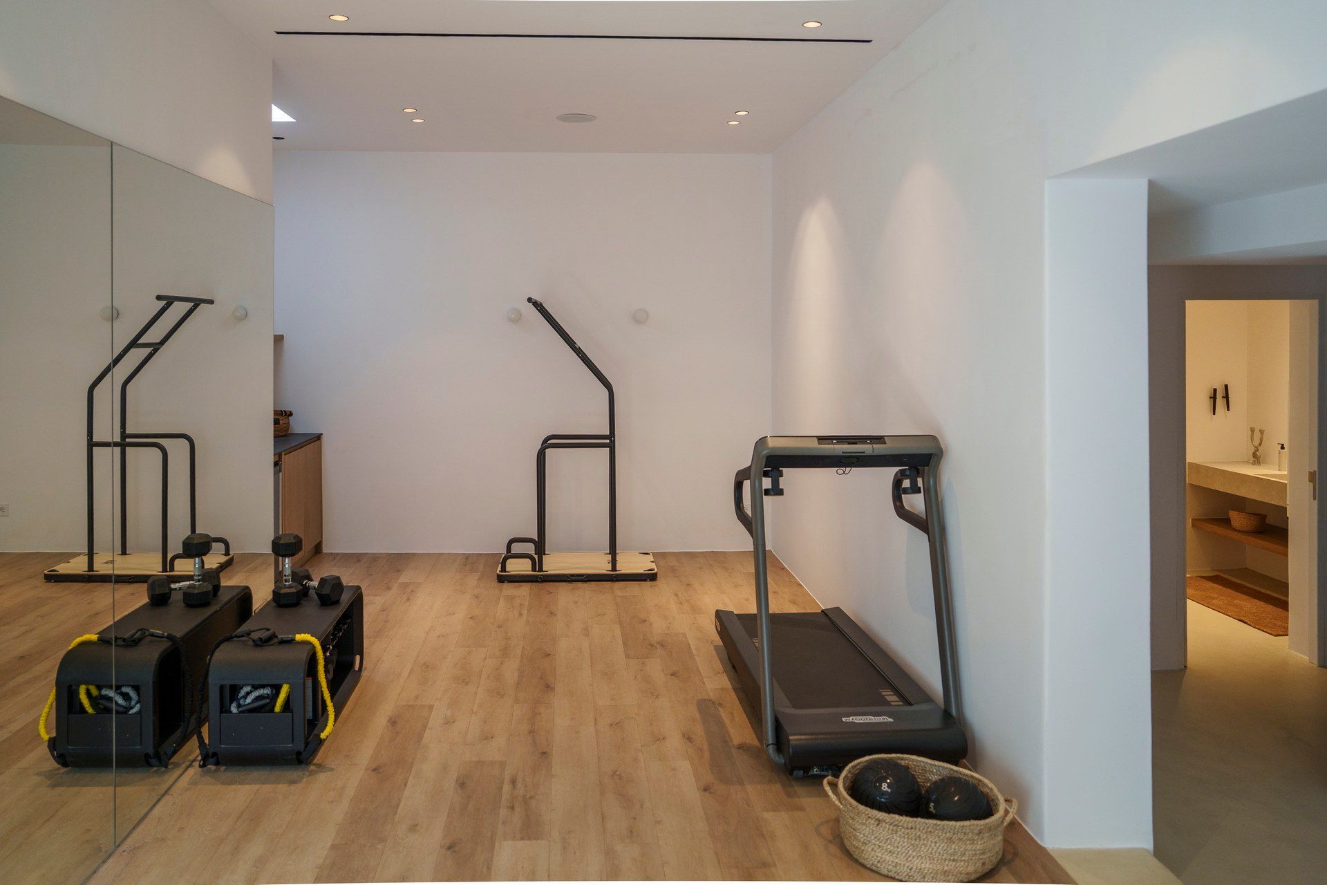 The interiors are pared back, but warm in all the right places. The kitchen is sleek and fully equipped, opening naturally toward the terrace and the shaded dining area, while the bedrooms feel restful and private, especially the upper-level room with its balcony and sea view. On the lower level, the villa becomes more retreat-like, with a hammam, gym, and TV room offering alternatives to sun-led afternoons. Bellatrix feels luxurious, but in a way that remains calm and livable.