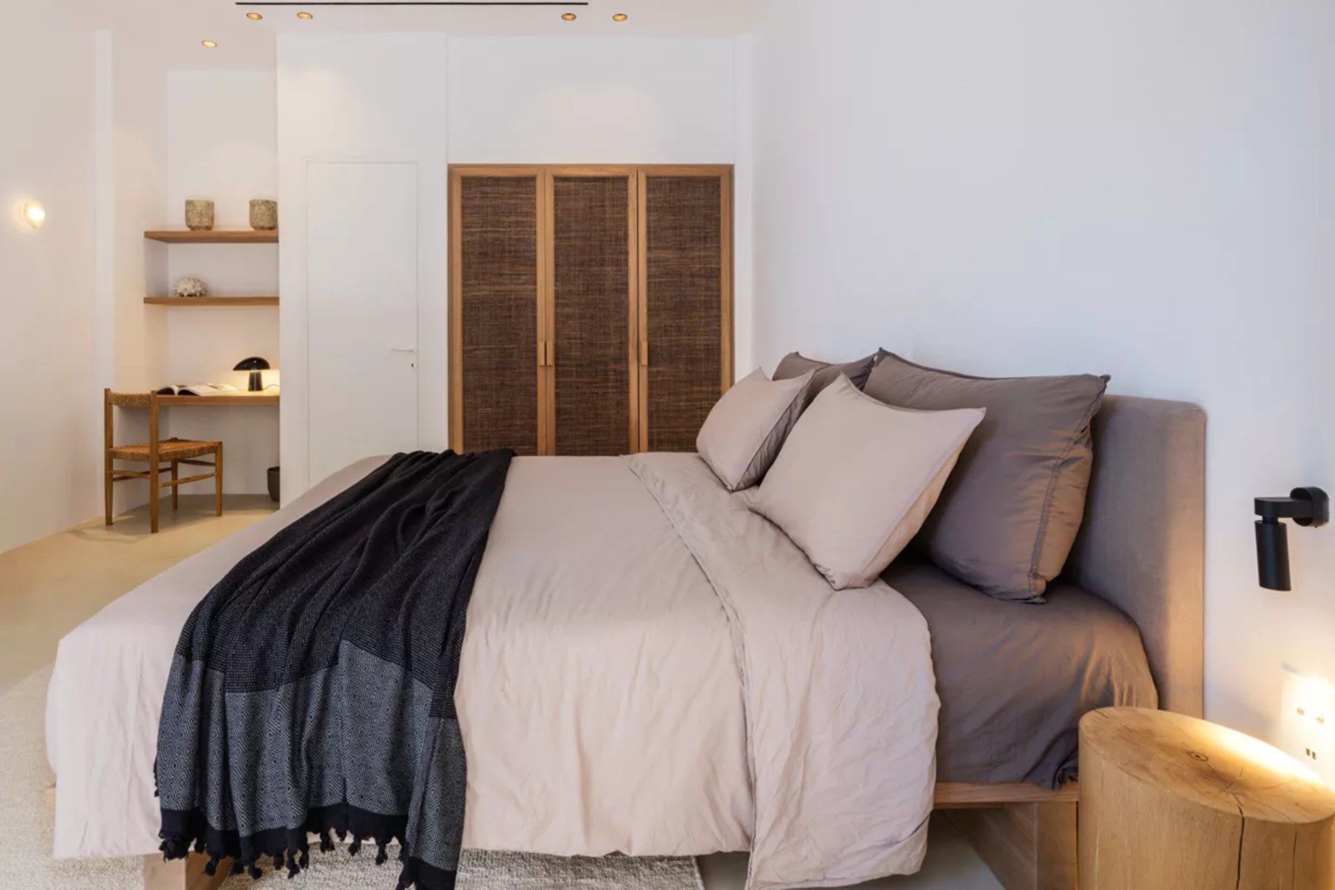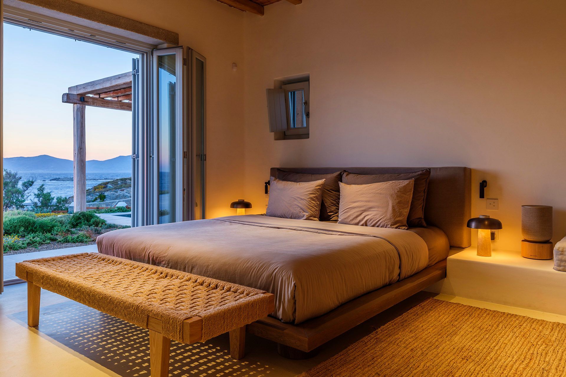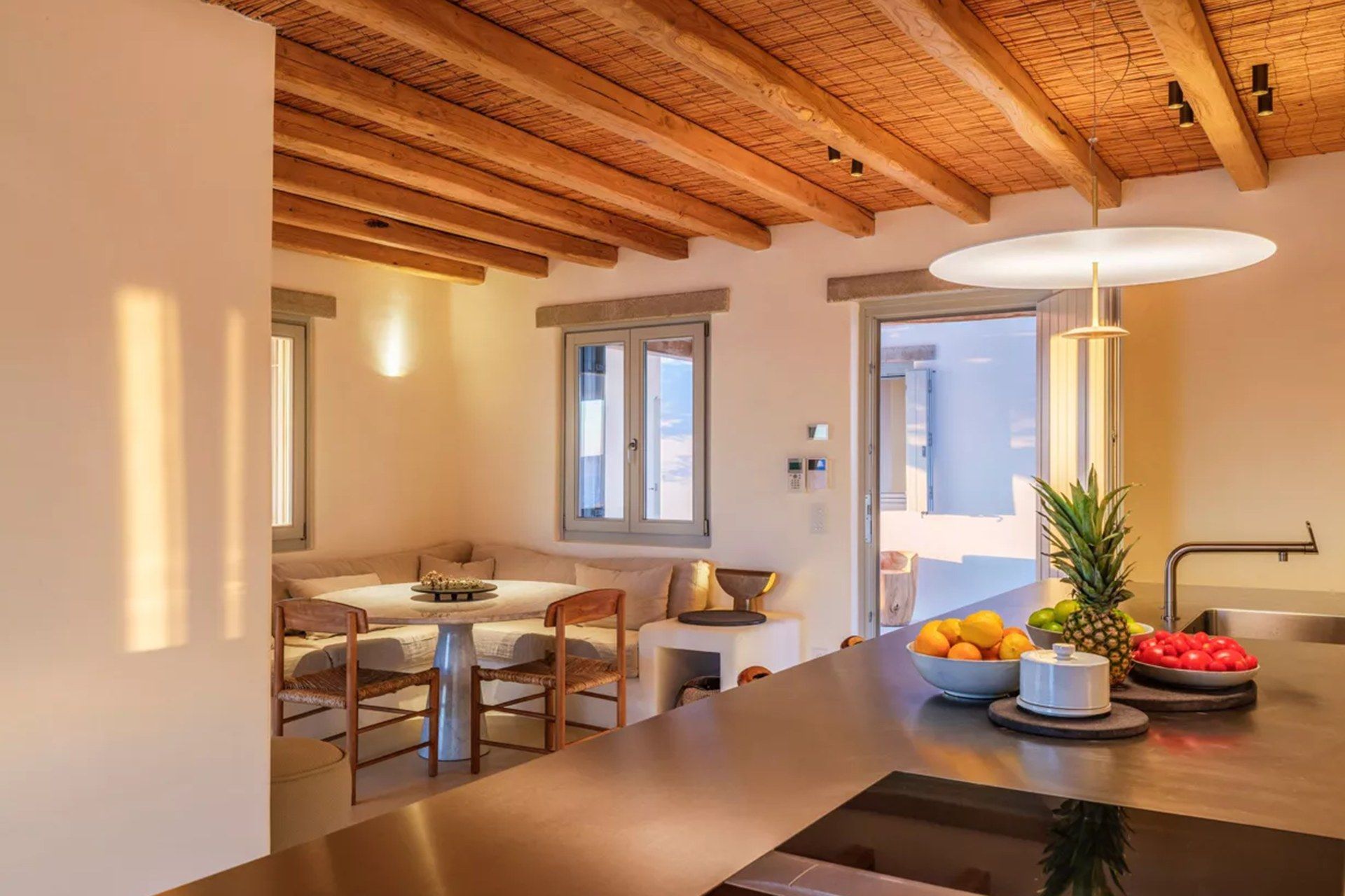 Bellatrix’s location in Kanalia offers an easy balance between seclusion and access, which is part of its appeal. Ornos, Mykonos Town, and Psarou are all a short drive away for beach clubs, shopping, and dining, but the villa itself keeps a much quieter rhythm once you come back. The pool can be heated on request, and the private beach access gives the house a sense of independence that stands out even in this part of the island. It is especially appealing to guests who want a more private, sea-led side of Mykonos.