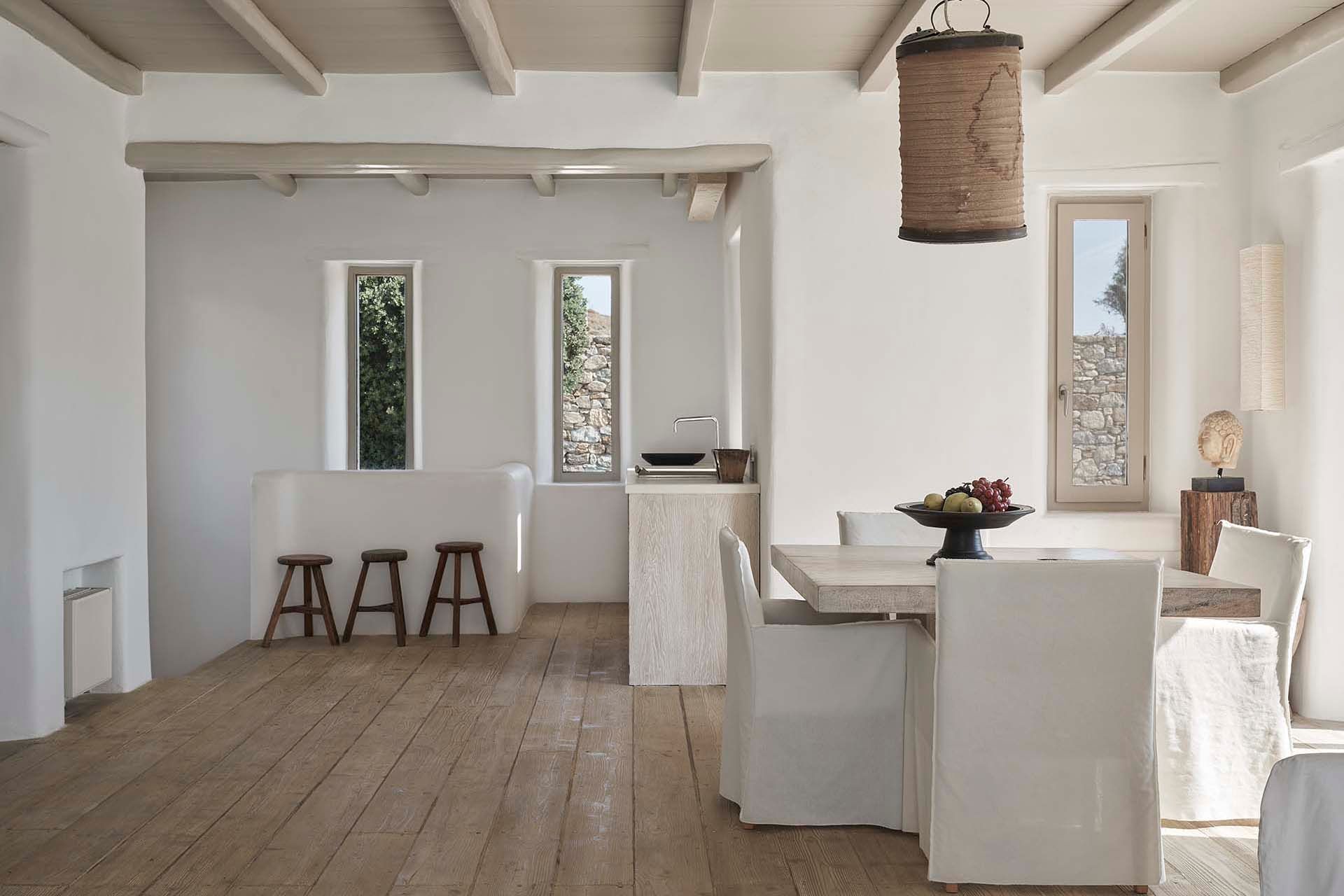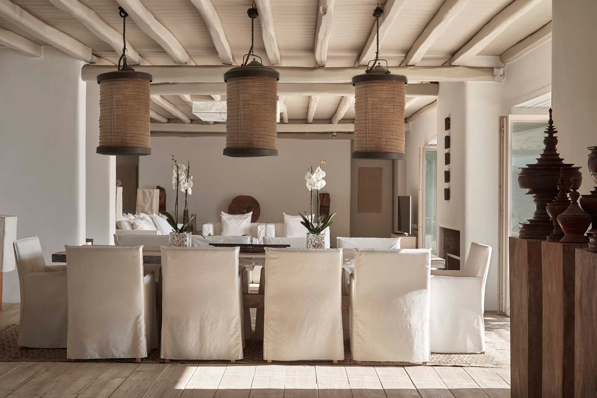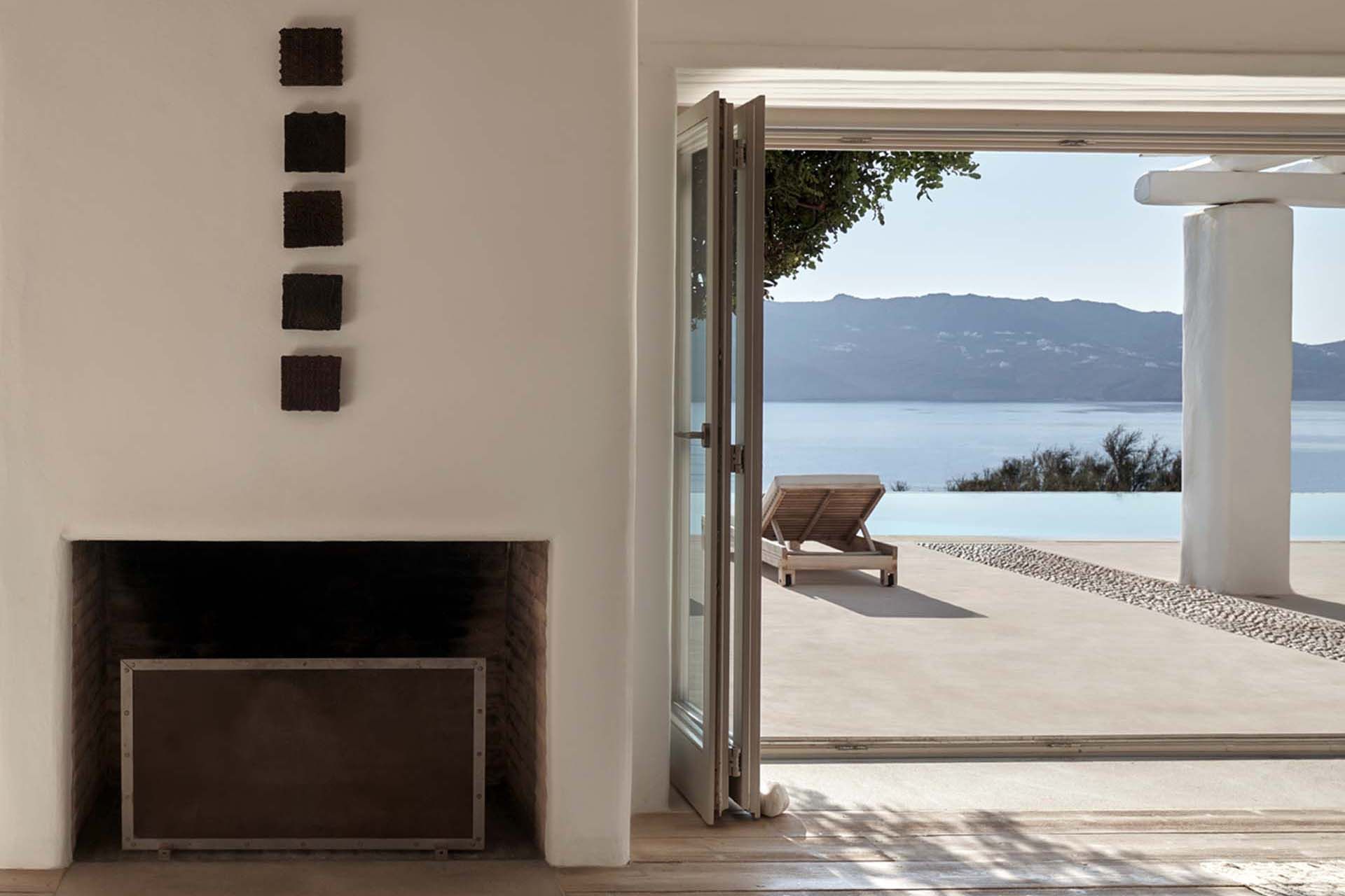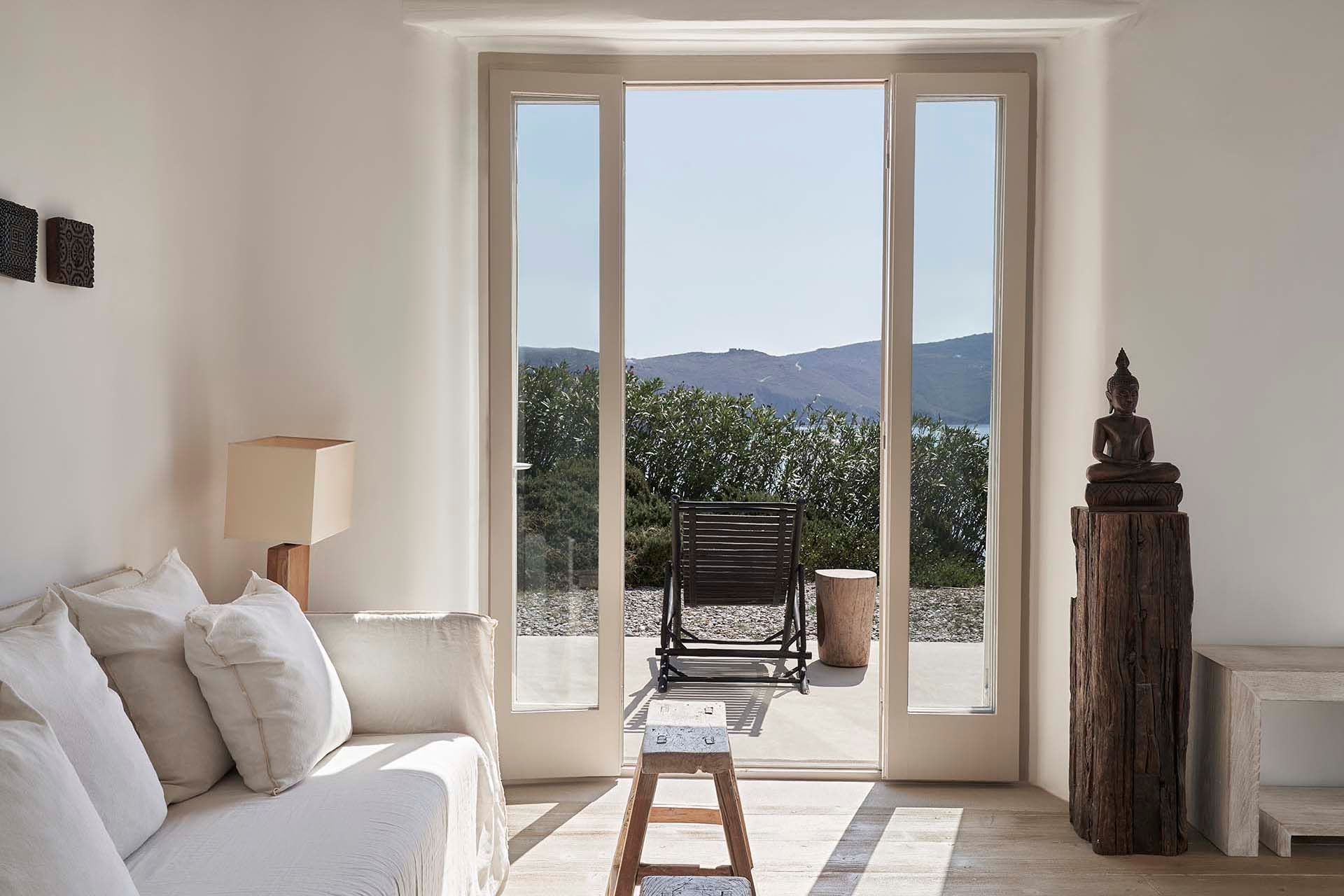 Inside this deluxe two-level villa, modern Mykonian style continues with smooth lines, picture-frame windows, and designer furnishings. A neutral palette and pale woods are paired with boho-chic textiles, creating a calm, lived-in ambience. On the pool level, a spacious open-plan living area includes comfortable sofas, a dining space, and a fully equipped kitchen for everyday ease. All five bedrooms feature en-suite bathrooms and sea views, with large window-doors opening onto terraces—ideal for stepping straight outside at any time of day.
