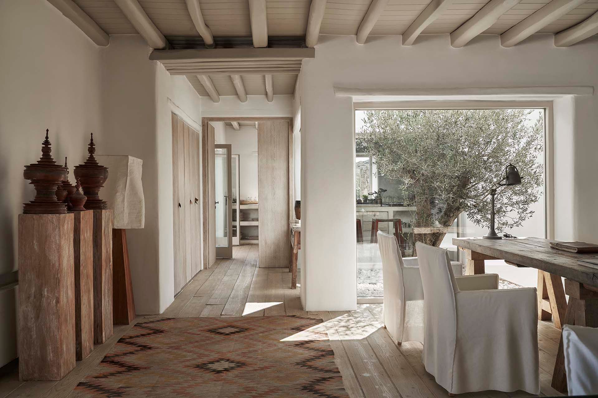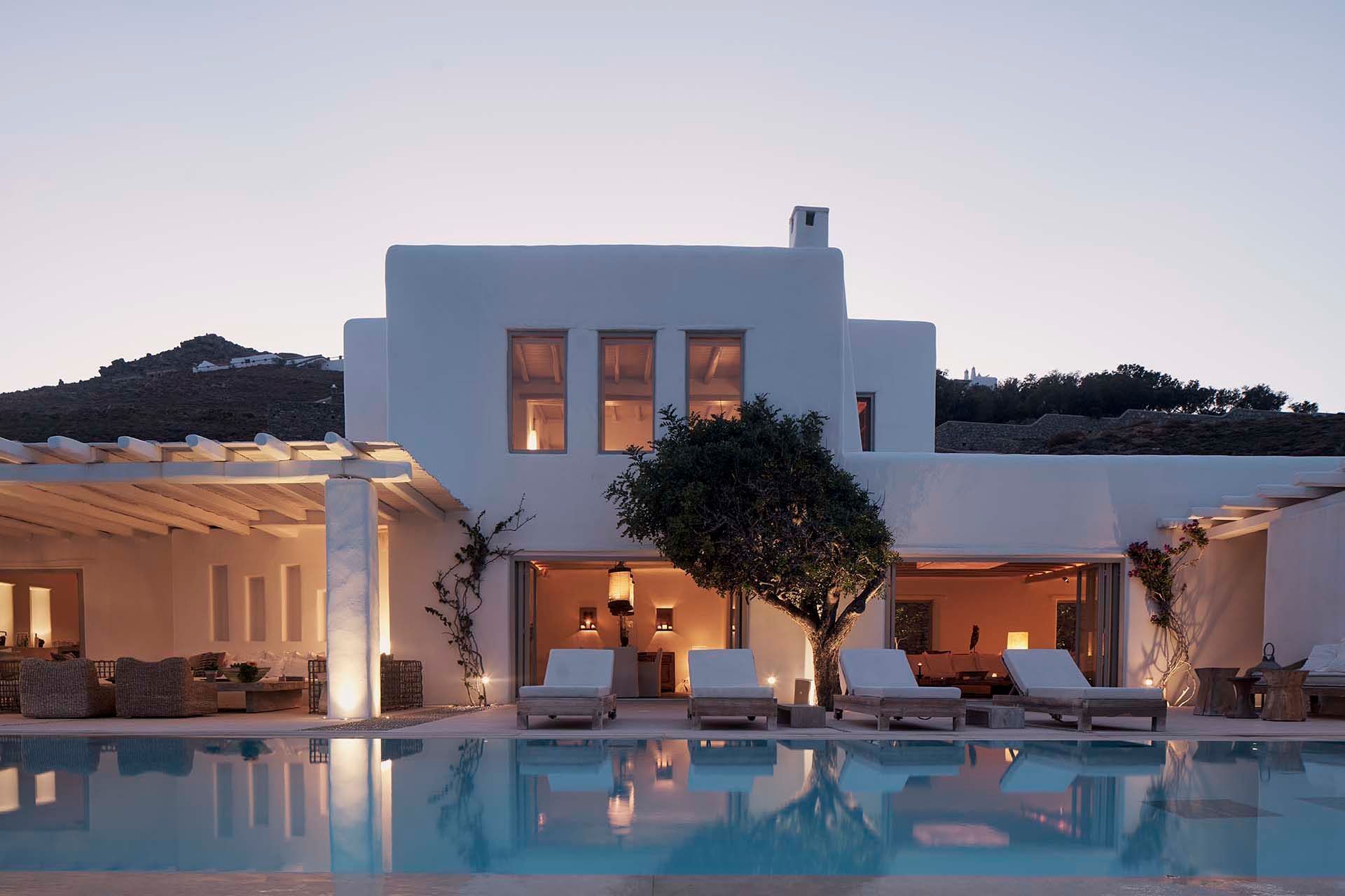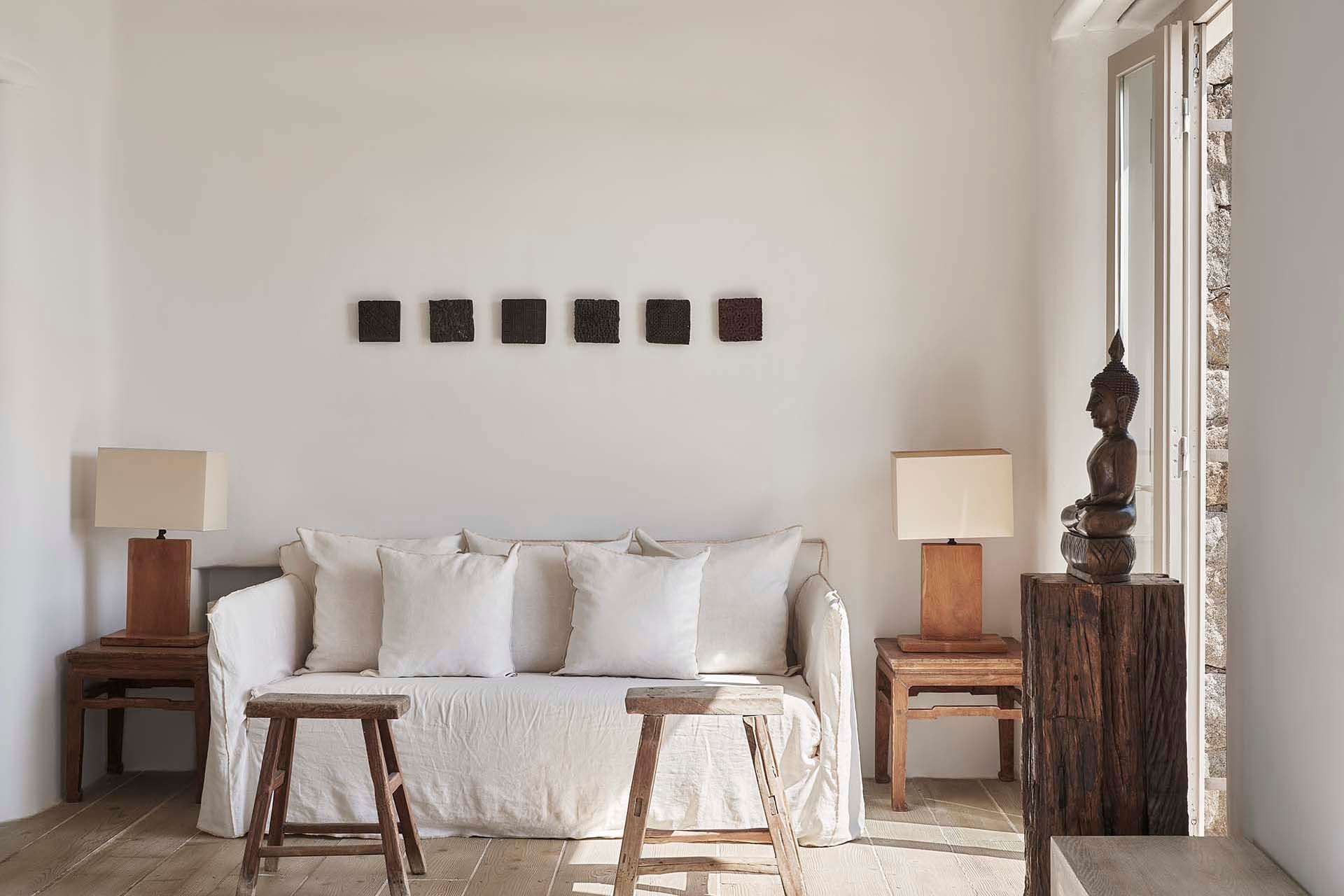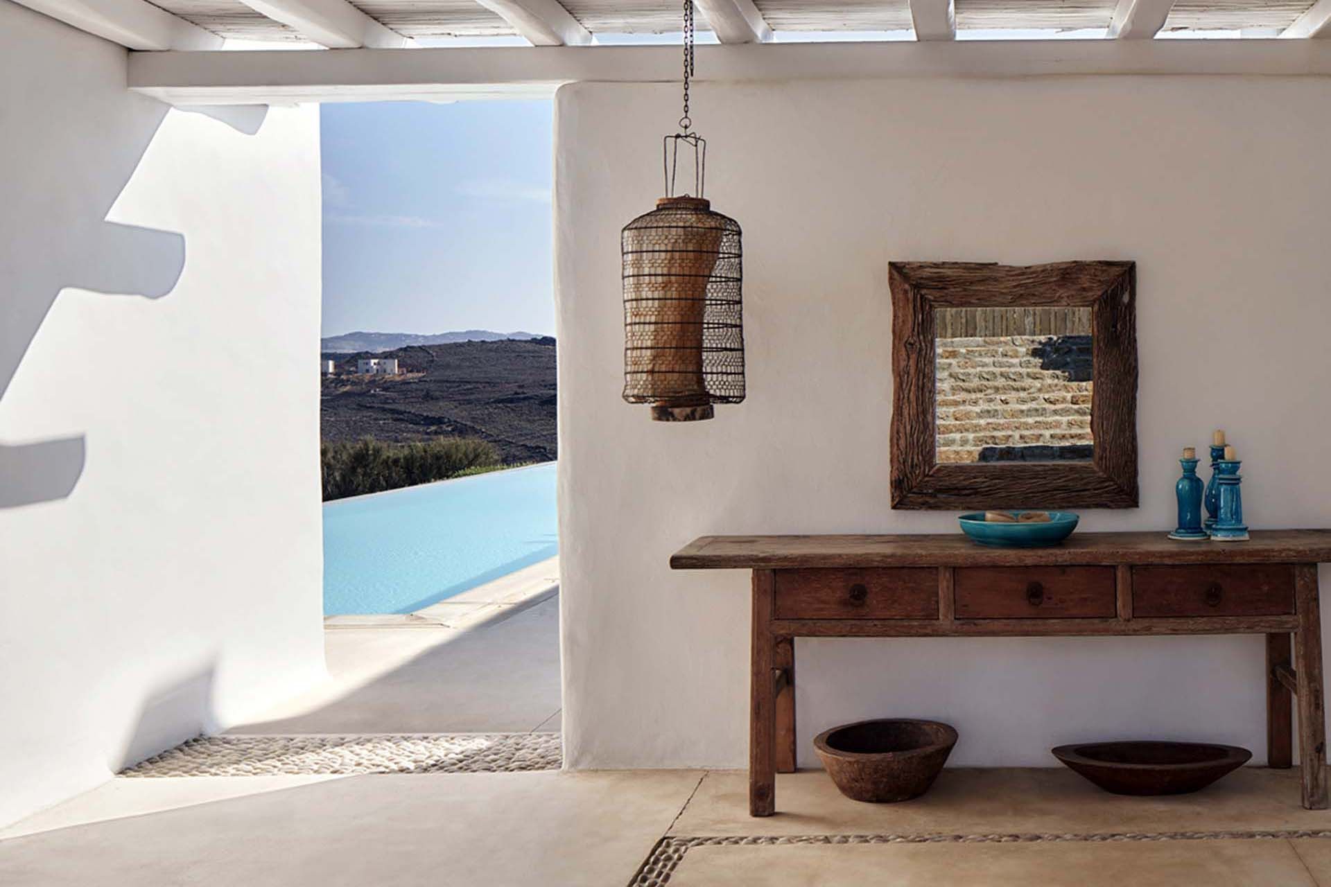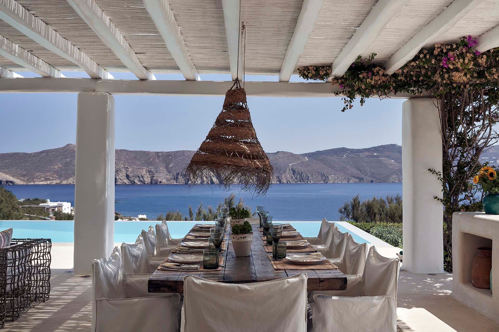 Inside this deluxe two-level villa, modern Mykonian style continues with smooth lines, picture-frame windows, and designer furnishings. A neutral palette and pale woods are paired with boho-chic textiles, creating a calm, lived-in ambience. On the pool level, a spacious open-plan living area includes comfortable sofas, a dining space, and a fully equipped kitchen for everyday ease. All five bedrooms feature en-suite bathrooms and sea views, with large window-doors opening onto terraces—ideal for stepping straight outside at any time of day.