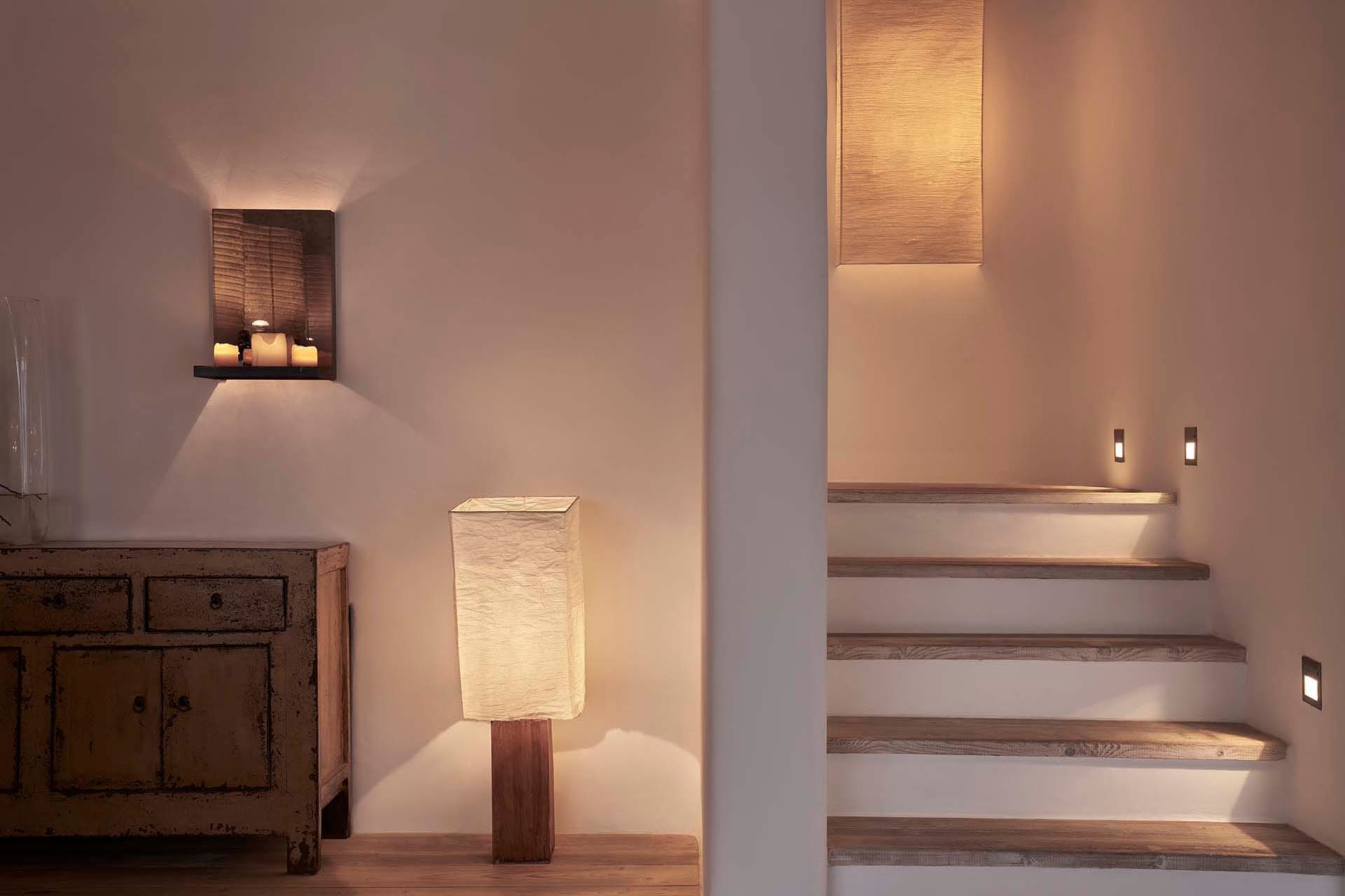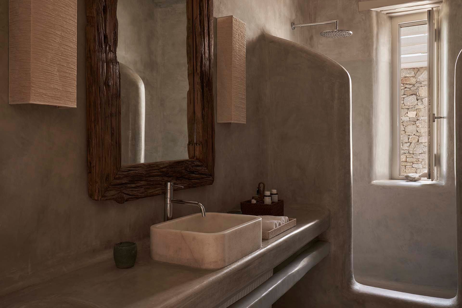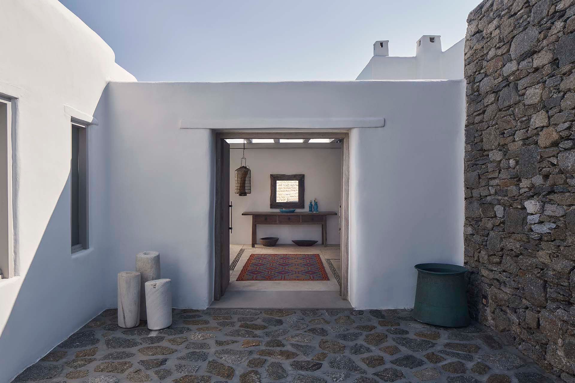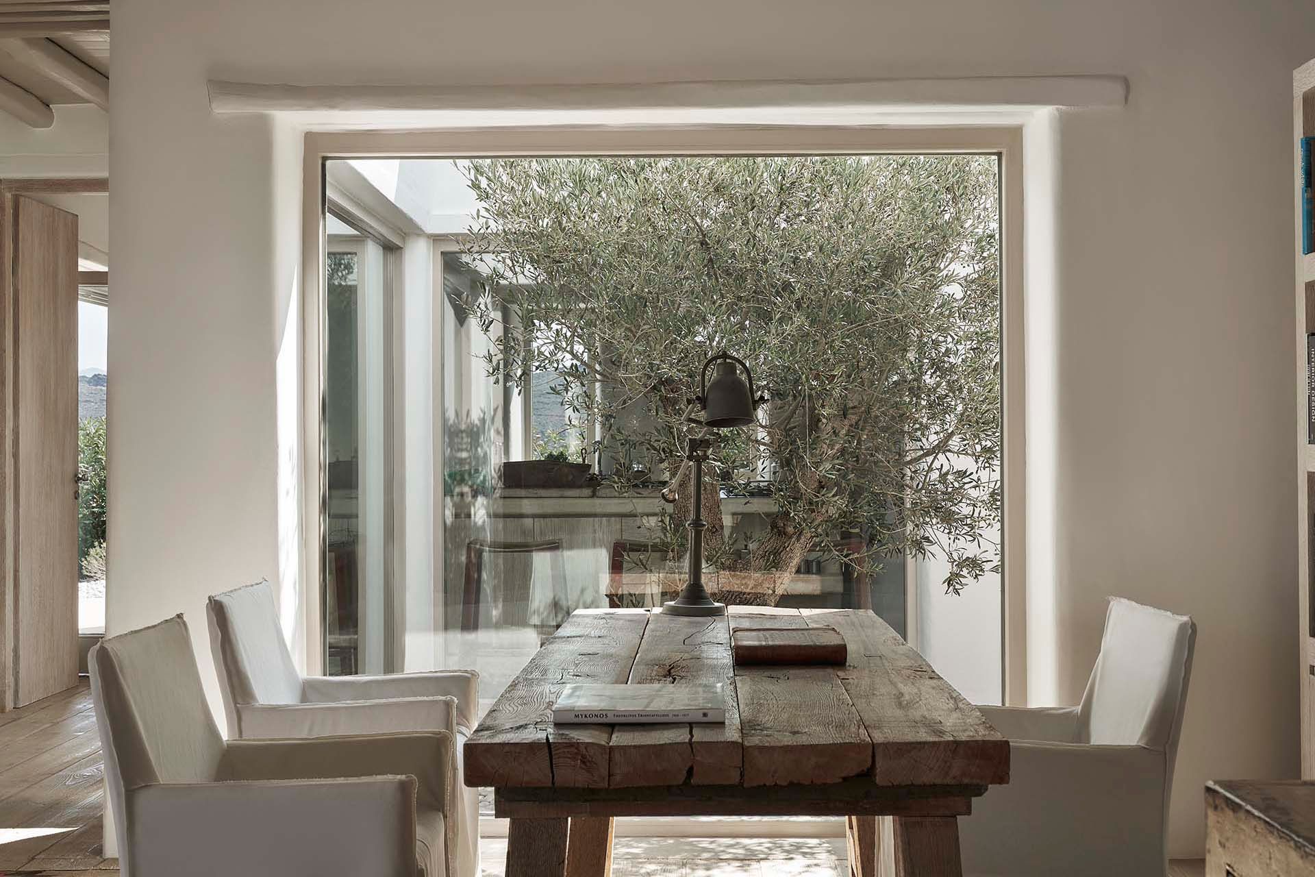 Inside this deluxe two-level villa, modern Mykonian style continues with smooth lines, picture-frame windows, and designer furnishings. A neutral palette and pale woods are paired with boho-chic textiles, creating a calm, lived-in ambience. On the pool level, a spacious open-plan living area includes comfortable sofas, a dining space, and a fully equipped kitchen for everyday ease. All five bedrooms feature en-suite bathrooms and sea views, with large window-doors opening onto terraces—ideal for stepping straight outside at any time of day.
