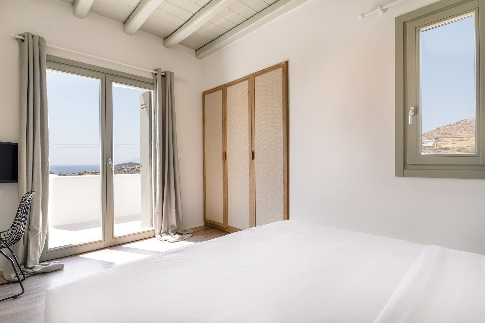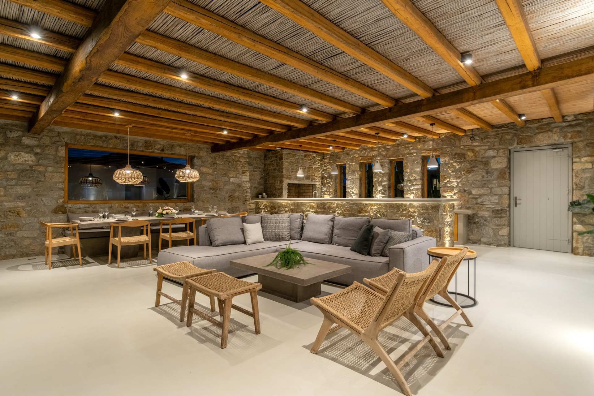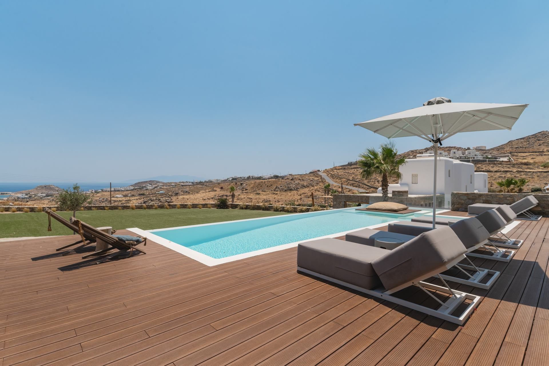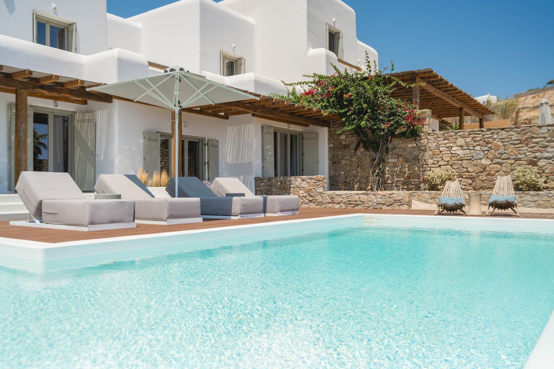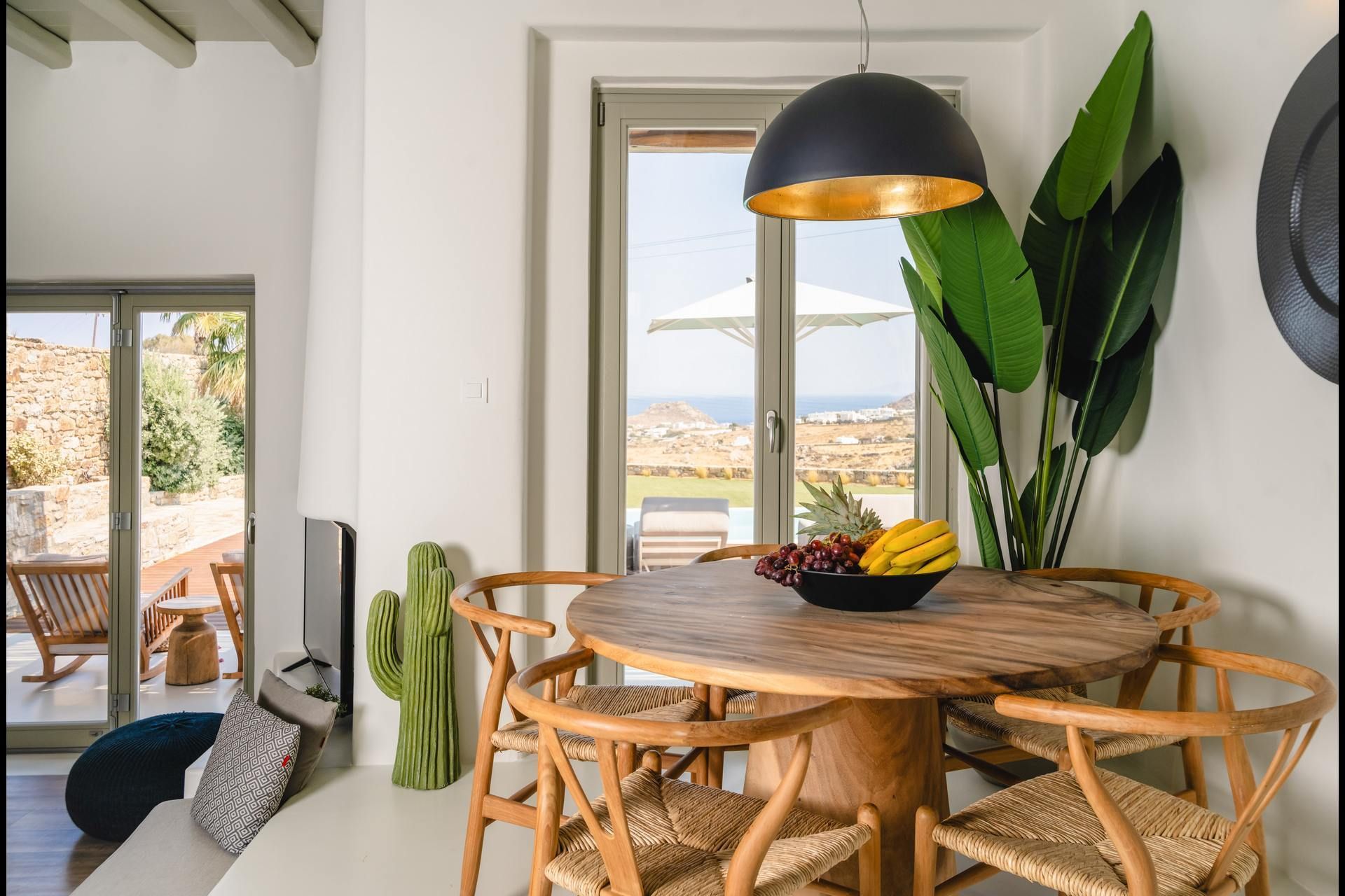 The outdoor areas are arranged like an open-air living room, shaped by sea breeze and sun. The infinity pool looks toward the Aegean, edged by sun loungers and shaded seating that follows the day’s light. A pool bar and barbecue create casual spots for meals, while the dining and lounge areas feel comfortable without fuss. Everything is in place for long, easy days—shade, music, a rinse at the outdoor shower, and one more swim before heading out.