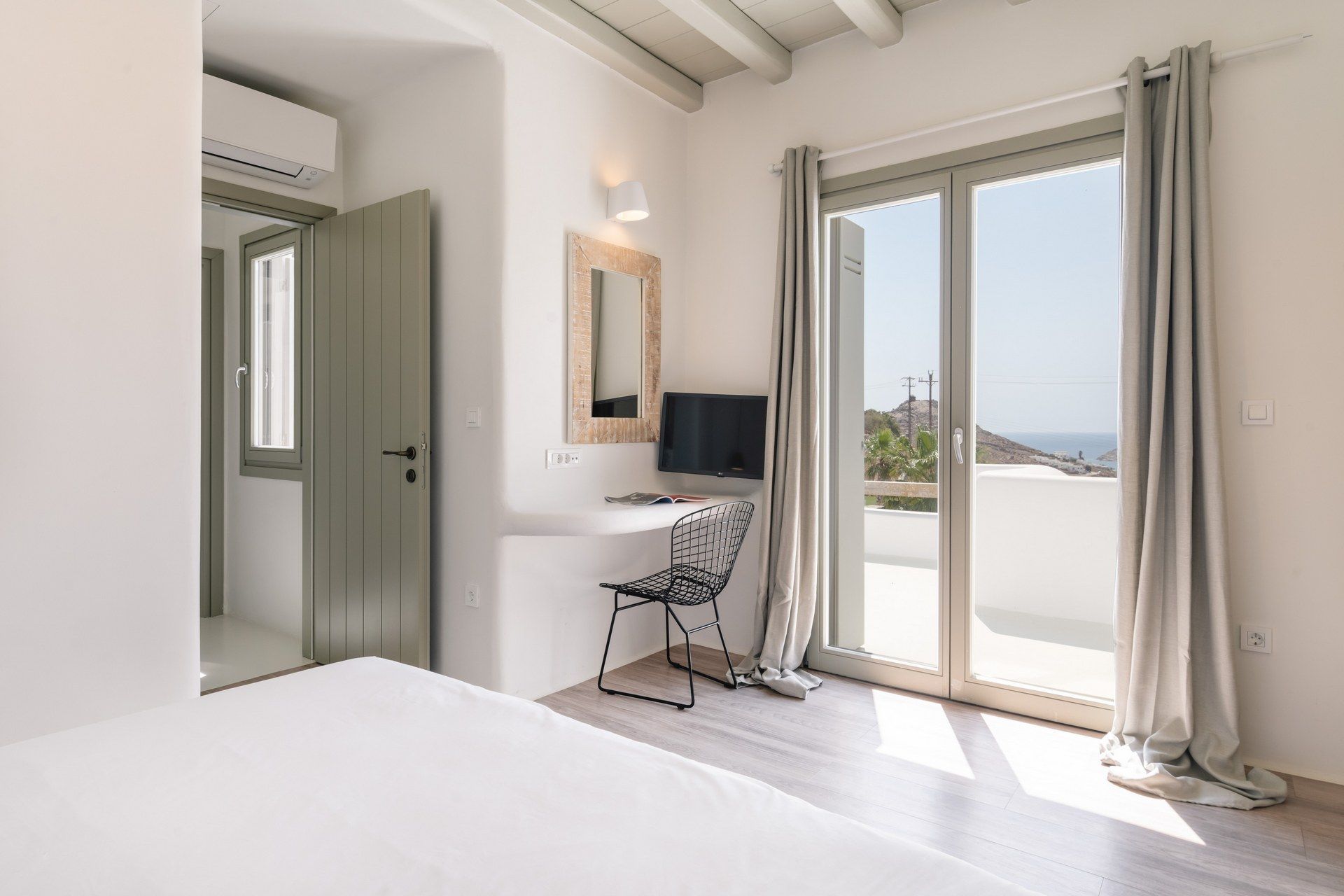 1 bedroom with queen-size bed, A/C, TV, ensuite bathroom with shower, sea view