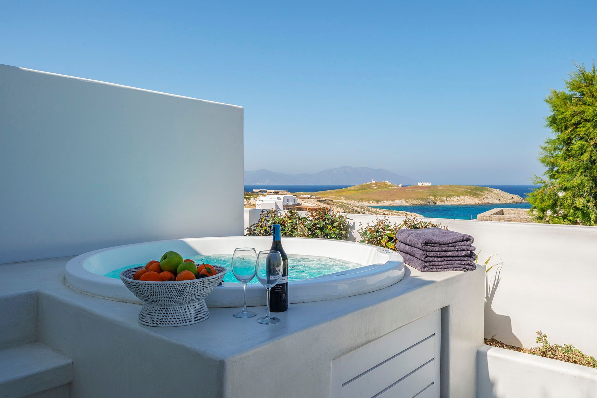 1 suite each with built-in queen-size bed, ensuite bathroom with shower, living room with sofa bed, kitchenette, A/C, TV, safe box, access to private balcony with a heated jacuzzi, sea view