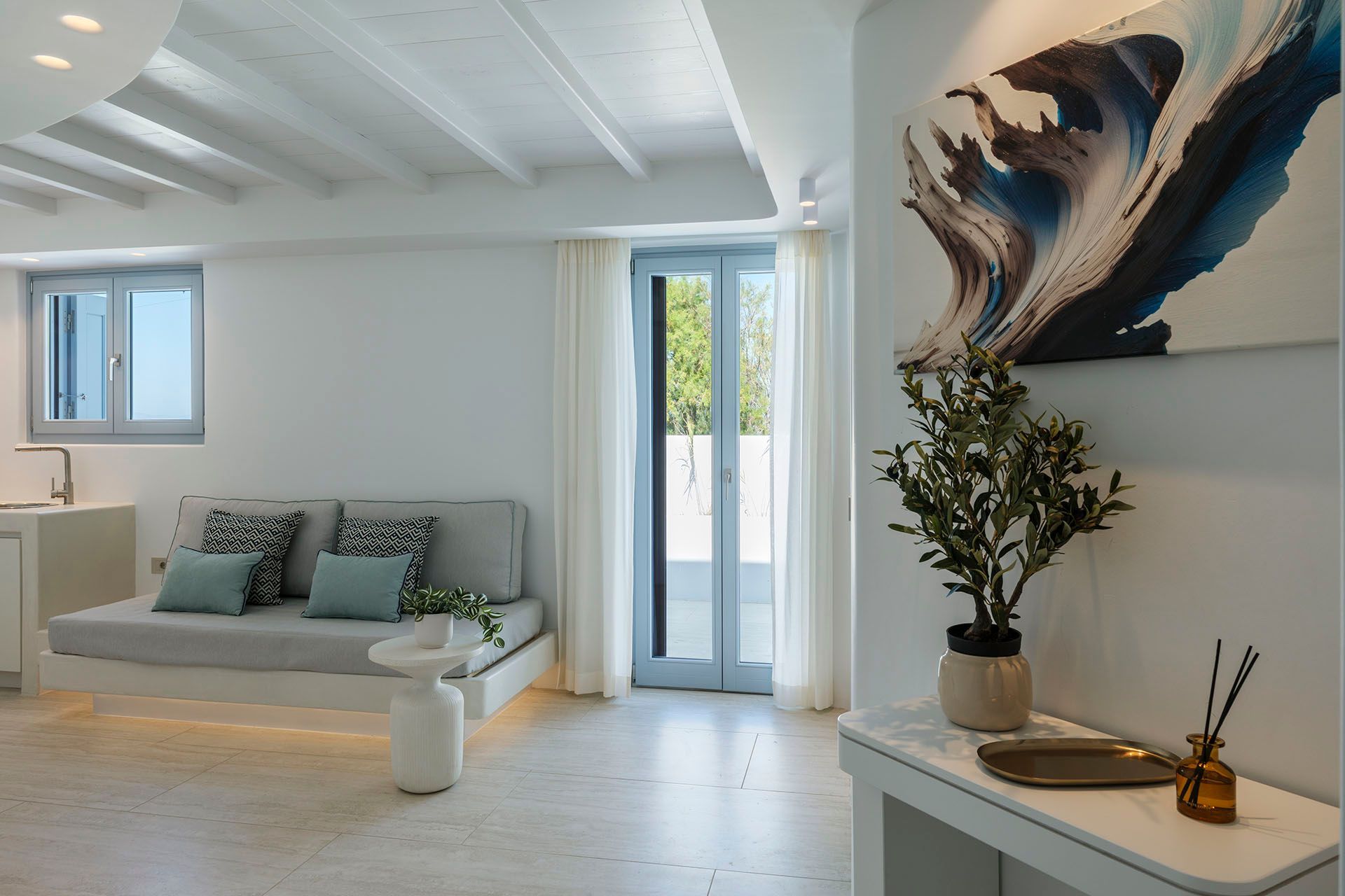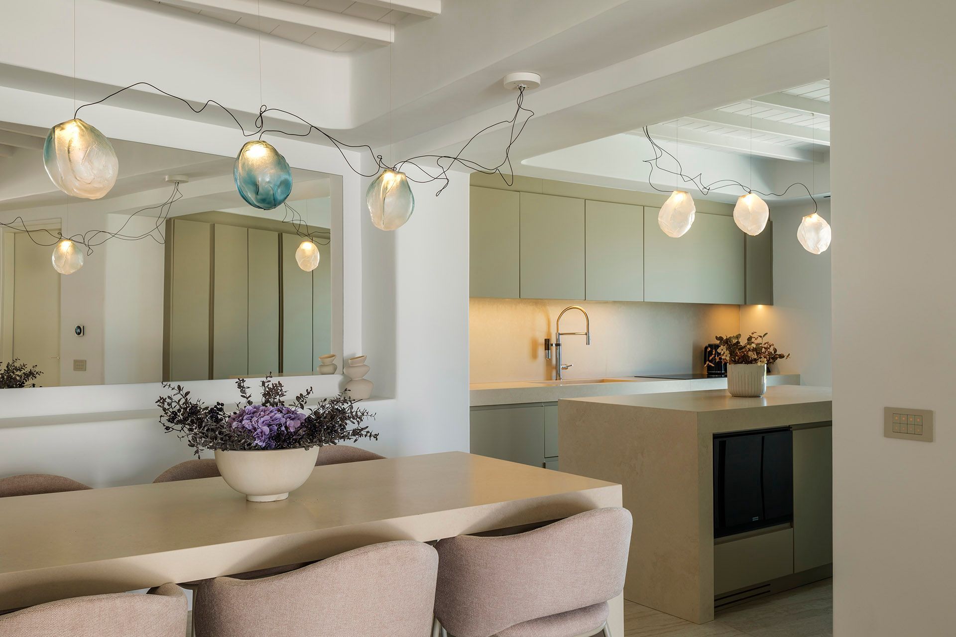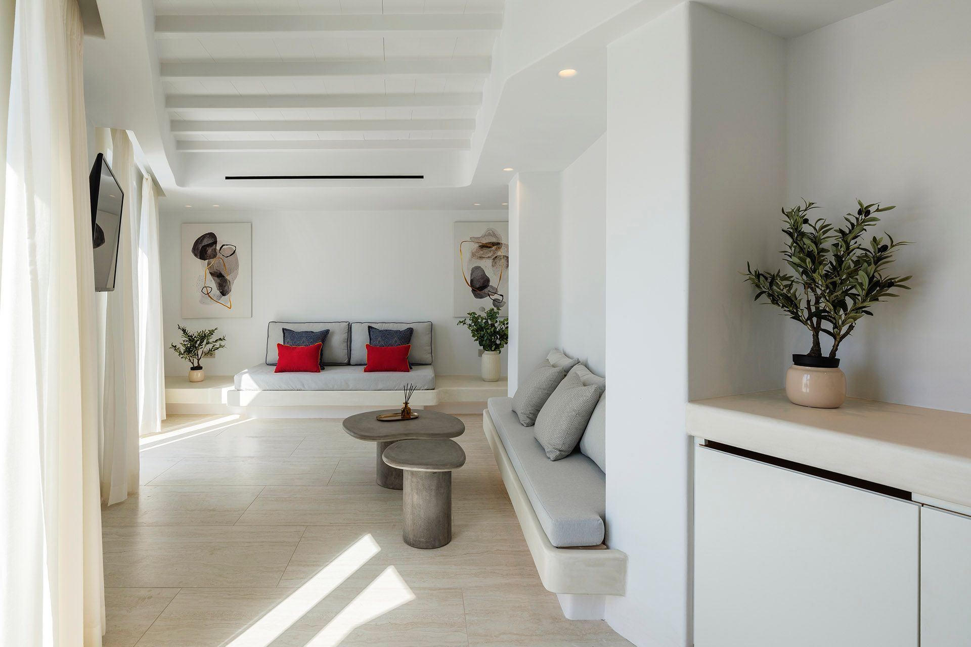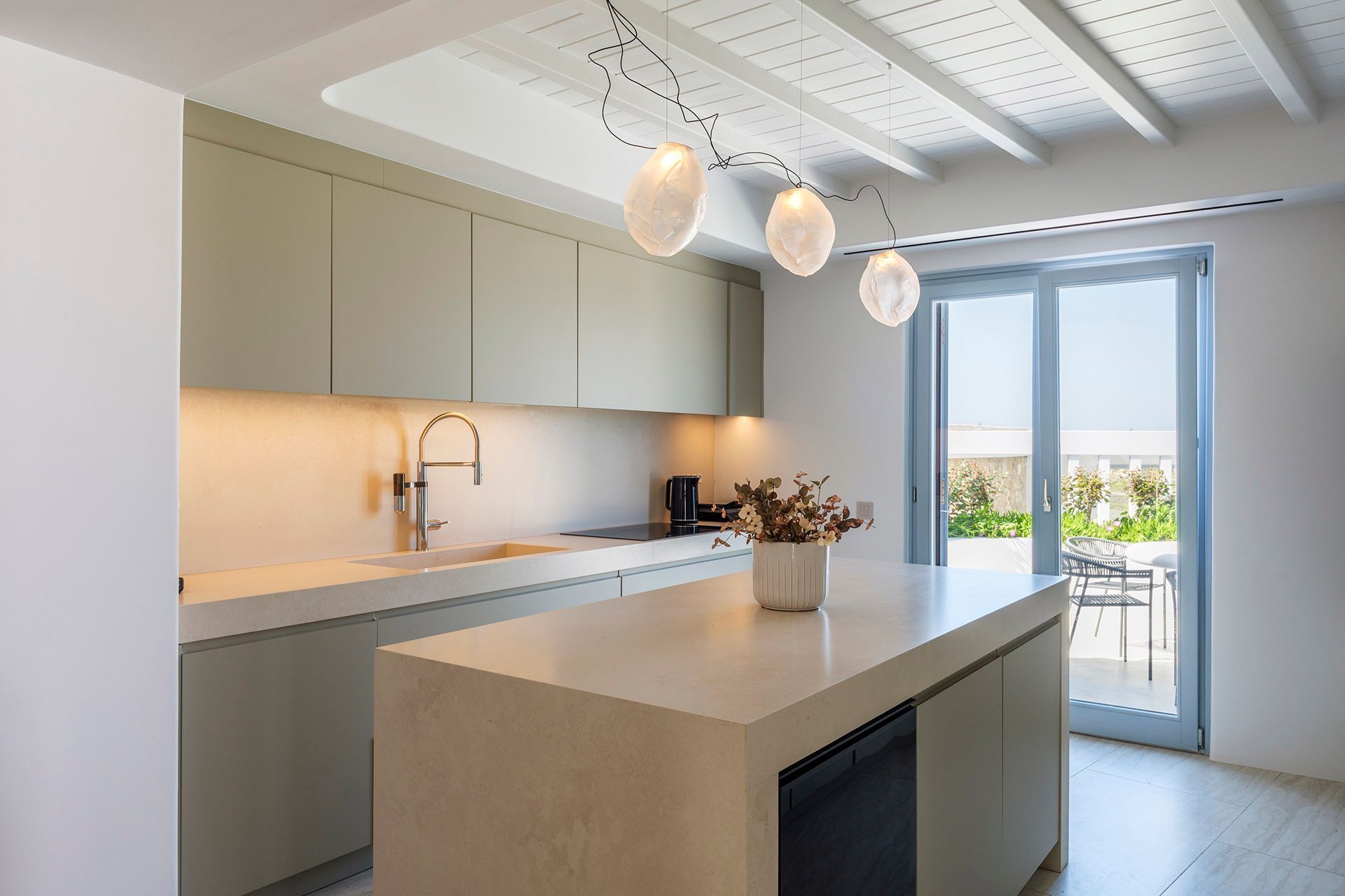 Villa Nostos in Kanalia is built around a simple idea: keep the view, keep the calm, and keep the beach within walking distance. The villa sleeps twelve guests in six ensuite bedrooms, with the option to accommodate three more on sofa beds when needed, and its real strength is how it handles privacy. Three independent suites sit apart with their own living areas and kitchenettes, each stepping out to a private balcony with a heated jacuzzi and open sea view. The house leans into Cycladic restraint, built-in forms, soft light, and clean surfaces that let the horizon do most of the decoration.