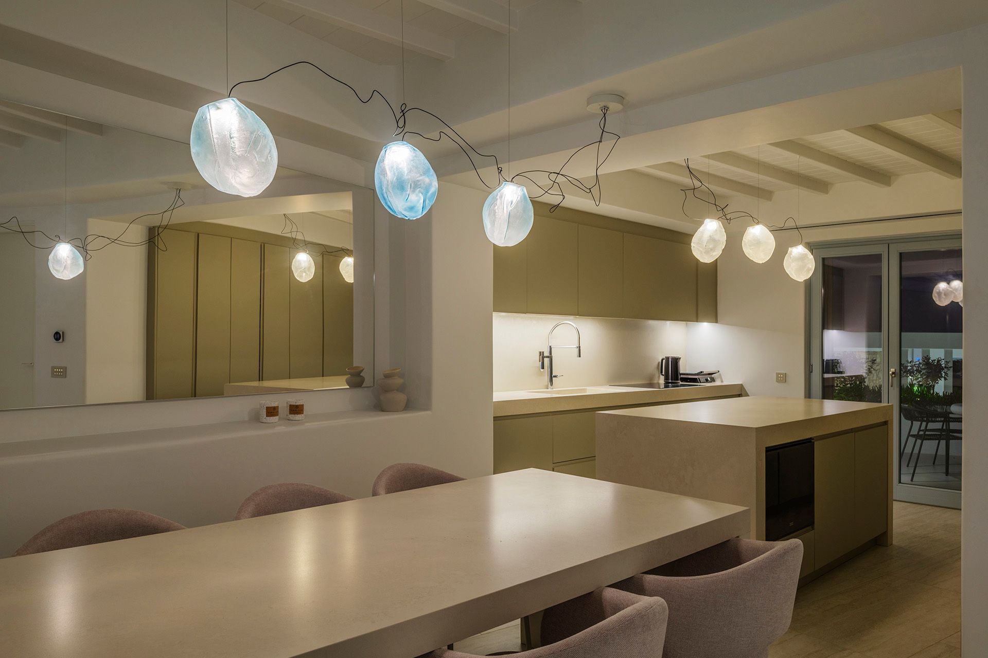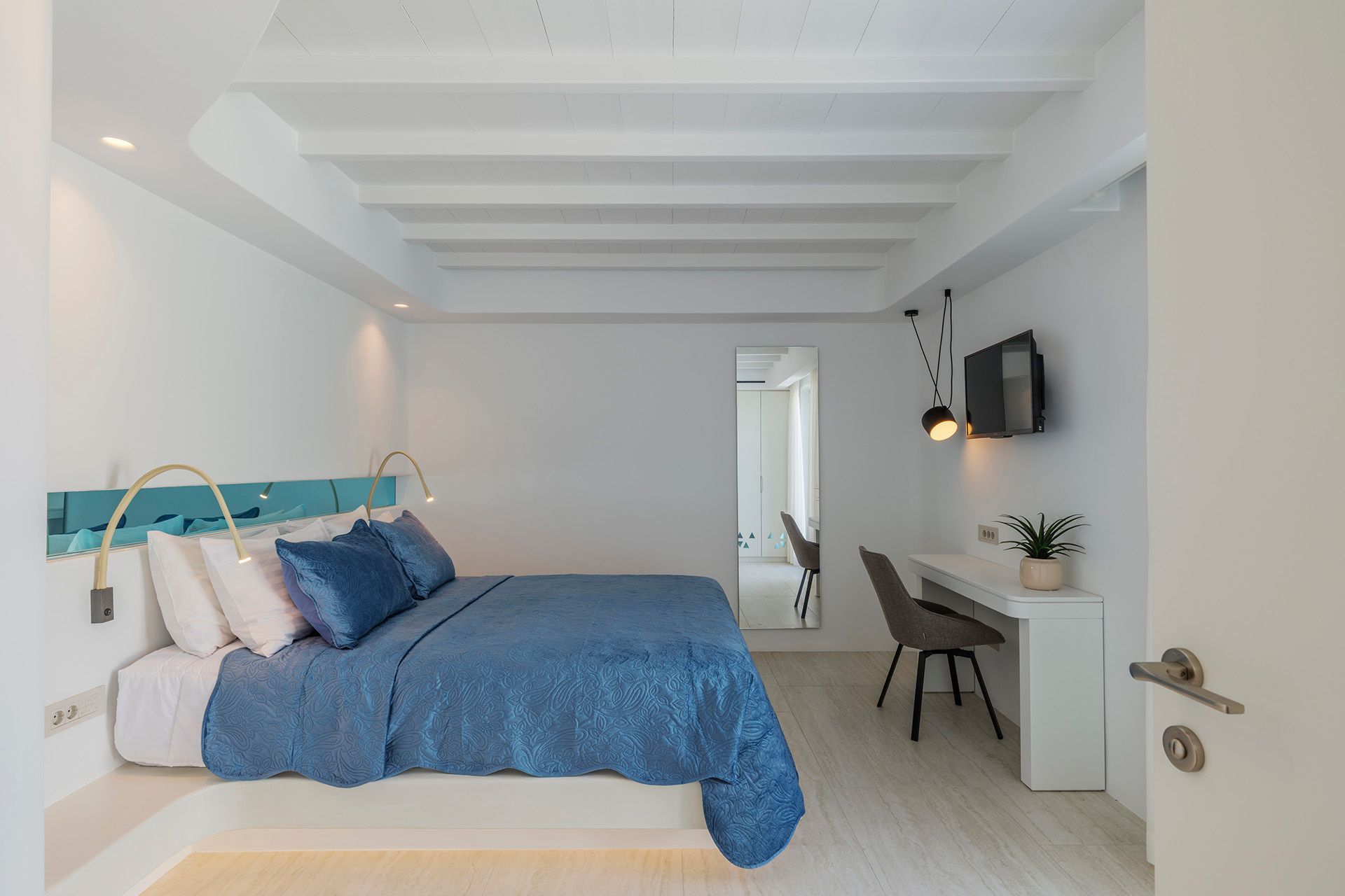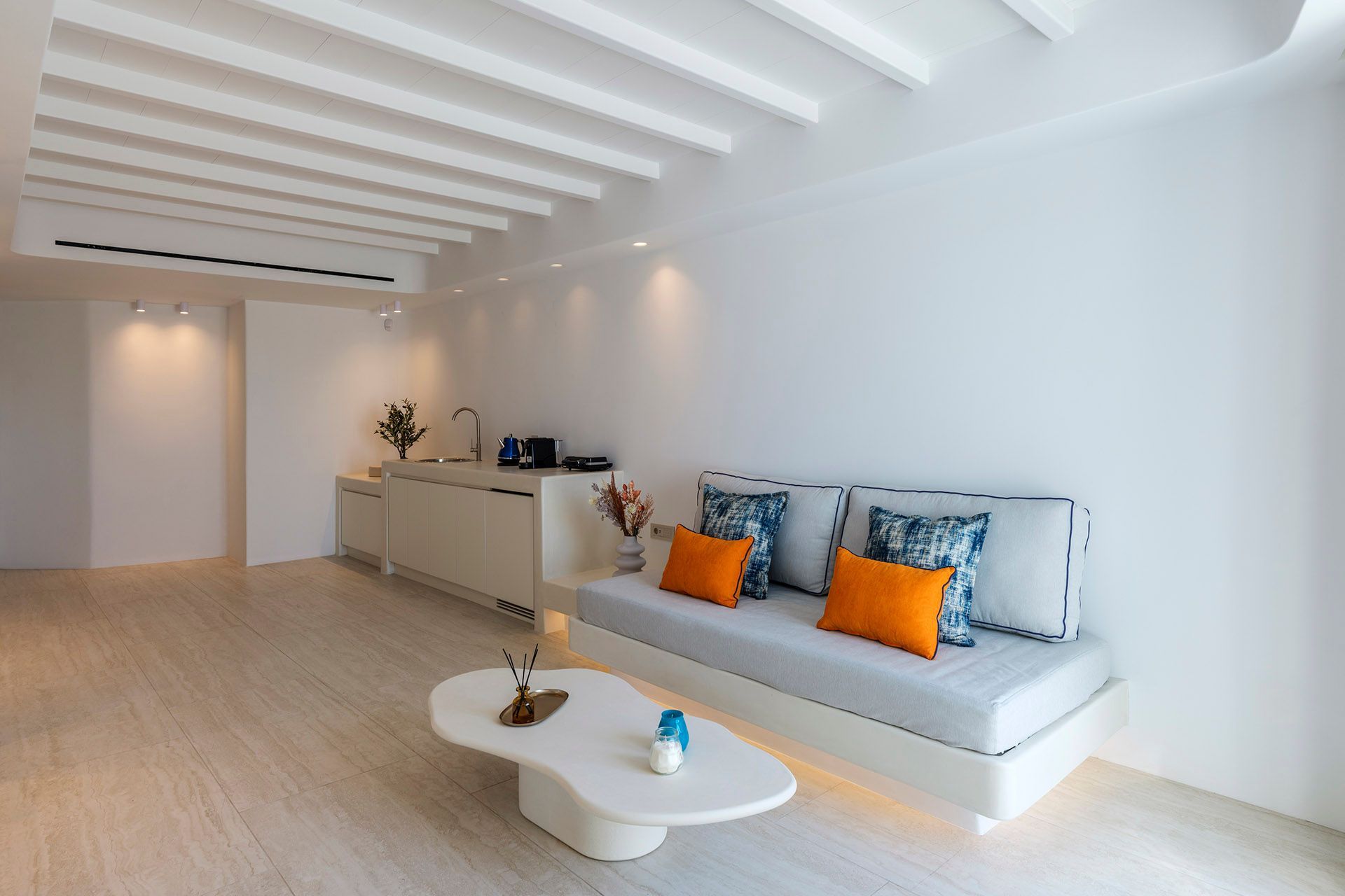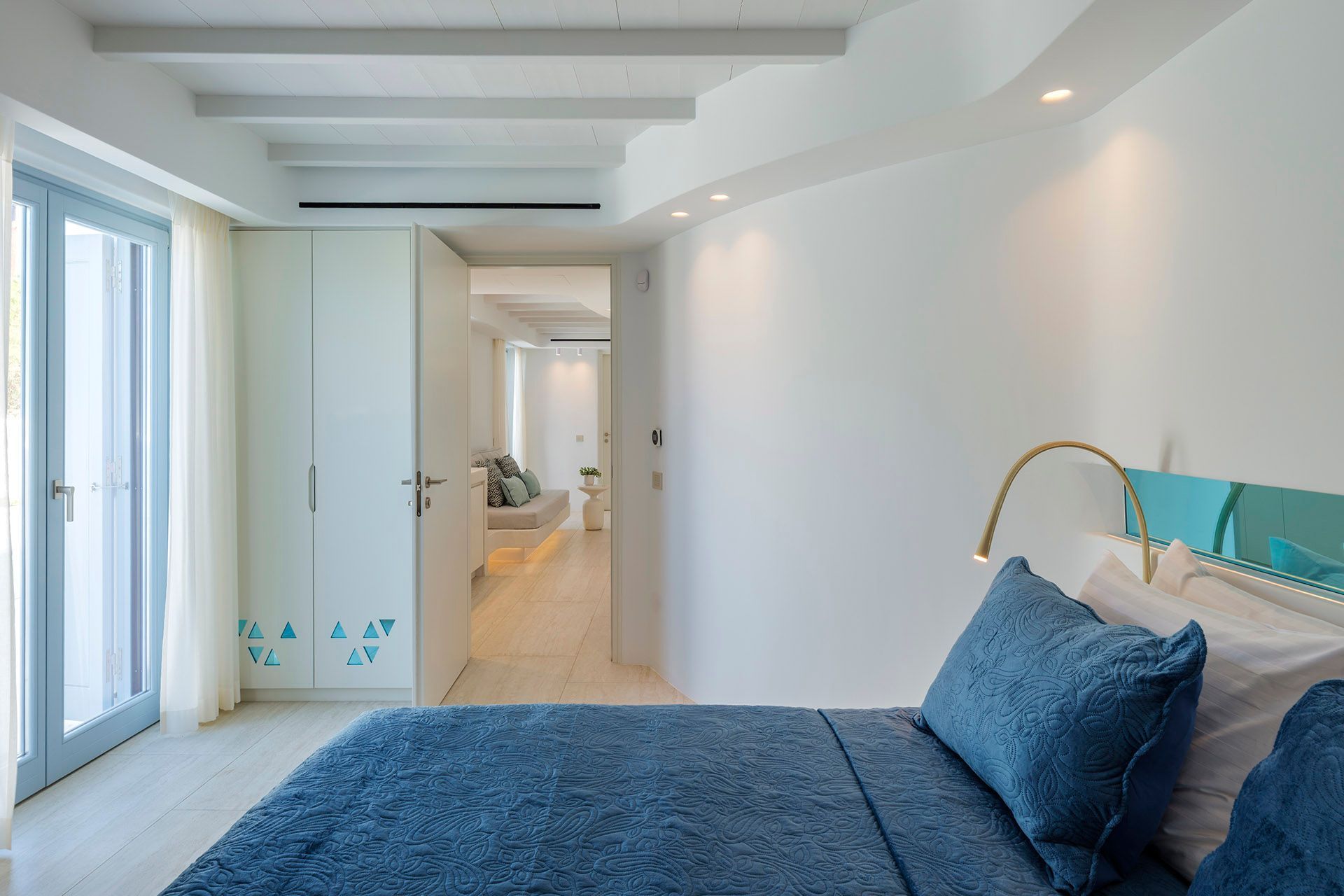Villa Nostos in Kanalia is built around a simple idea: keep the view, keep the calm, and keep the beach within walking distance. The villa sleeps twelve guests in six ensuite bedrooms, with the option to accommodate three more on sofa beds when needed, and its real strength is how it handles privacy. Three independent suites sit apart with their own living areas and kitchenettes, each stepping out to a private balcony with a heated jacuzzi and open sea view. The house leans into Cycladic restraint, built-in forms, soft light, and clean surfaces that let the horizon do most of the decoration.