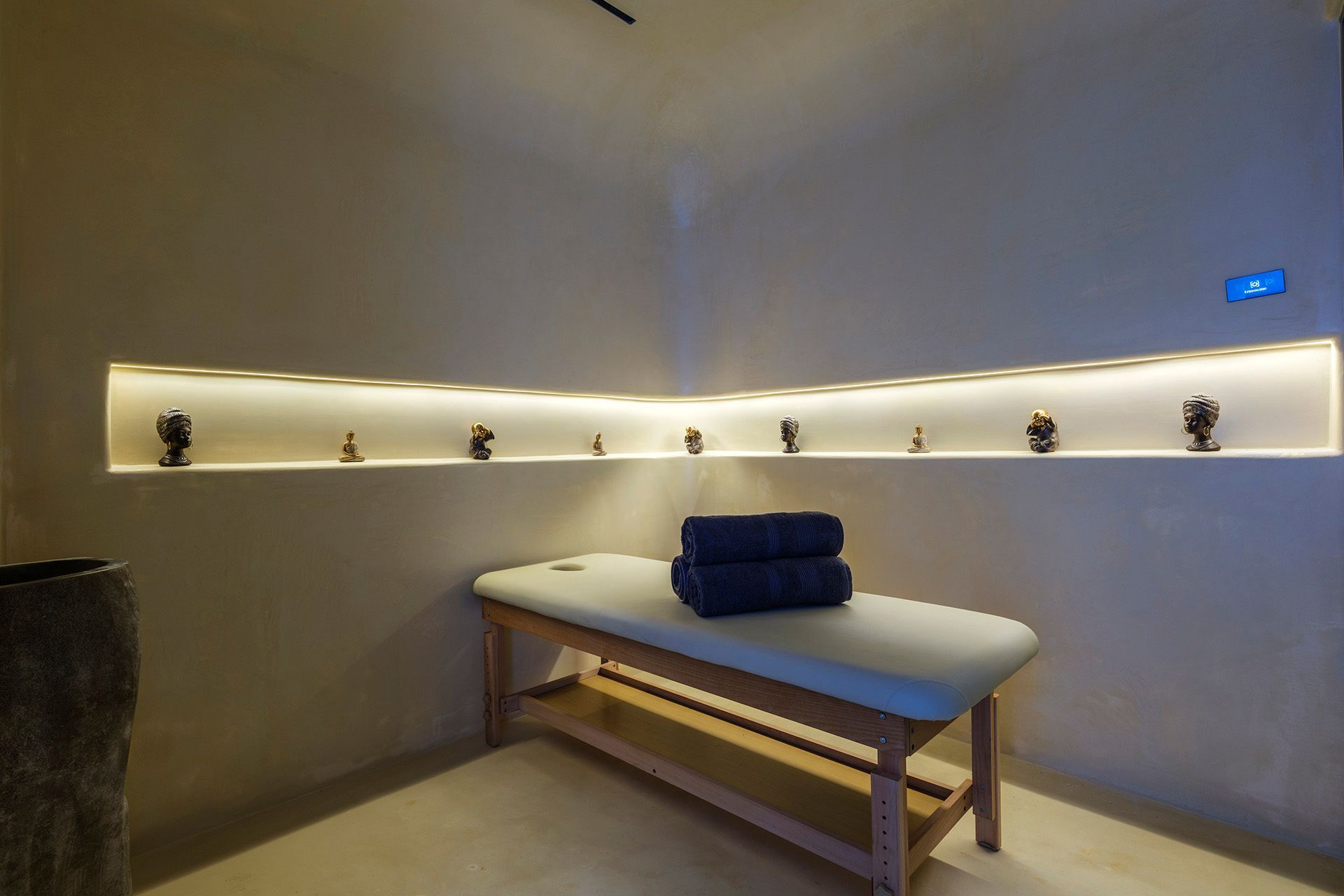 Outside, the architecture relaxes into curves. The infinity pool is shaped to soften the terrace, with loungers positioned along the open edge and shaded seating set back for the hotter hours. A pool bar keeps the pace informal, while the dining area under the pergola and the barbecue allow meals to stay outdoors without fuss. With a heated jacuzzi by the pool and a sound system humming in the background, the terrace behaves like the villa’s main living space, especially as the sun drops and Kanalia turns golden.