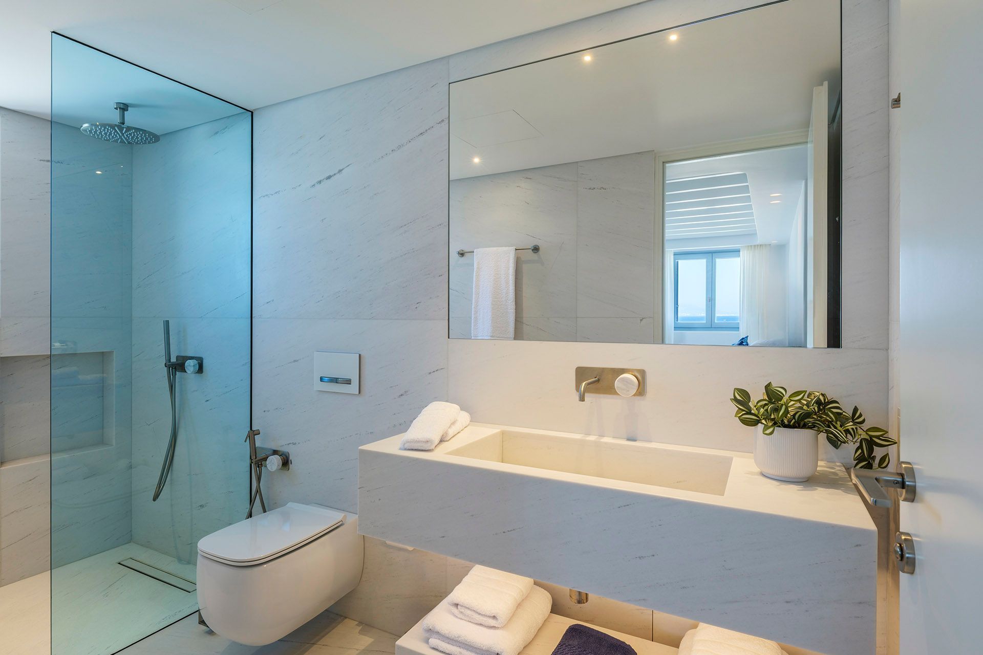 2 suites each with built-in double bed, ensuite bathroom with shower, living room with sofa bed, kitchenette, A/C, TV, safe box, access to private balcony with a heated jacuzzi, sea view