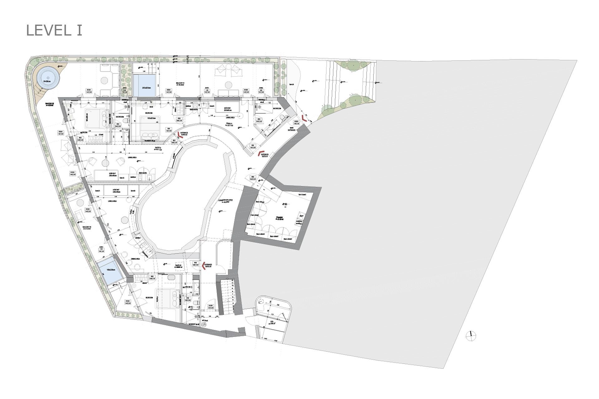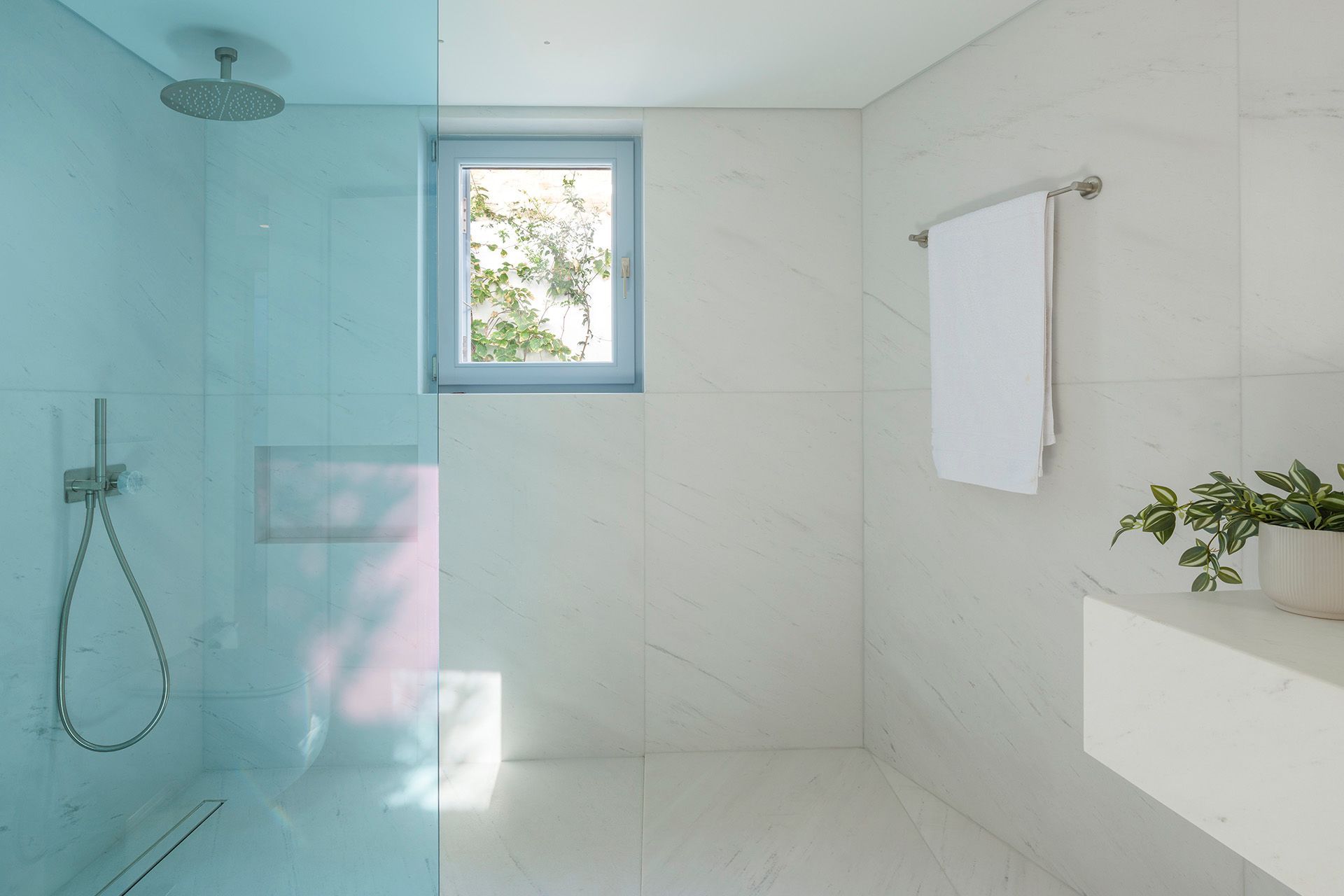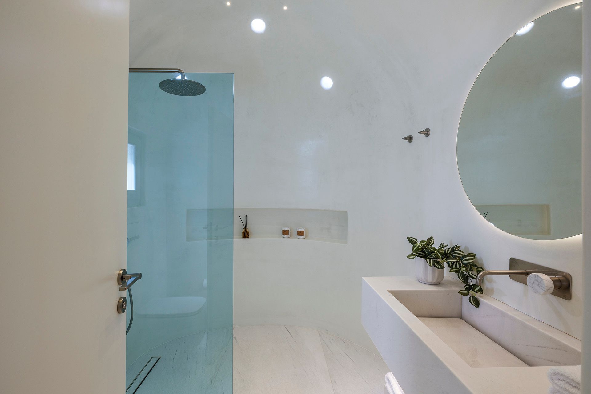 Inside, Nostos reads as quiet and functional in the best way. The living area features built-in sofas and a fireplace, opening to the terrace so the sea stays present even when you step away from the pool. The kitchen is fully equipped and paired with a smaller dining area that suits everyday meals, while bedrooms are spread across 3 levels to keep the house calm when everyone is in. The independent suites downstairs, each opening to a private balcony with a heated jacuzzi, give the stay its flexibility and an even more luxurious feel.