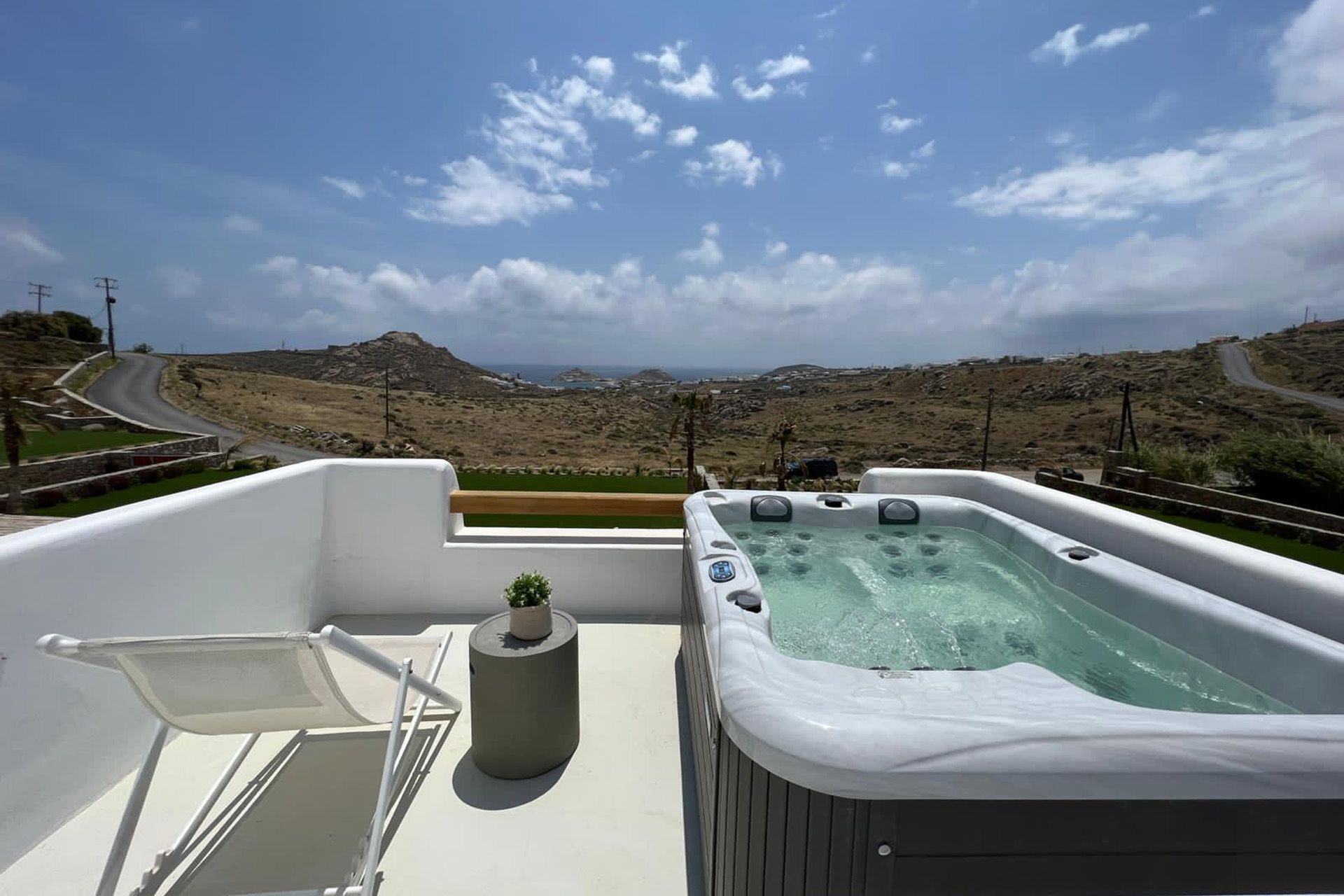 1 bedroom with queen-size bed, A/C, TV, ensuite bathroom with shower, access to balcony with heated jacuzzi, sea view