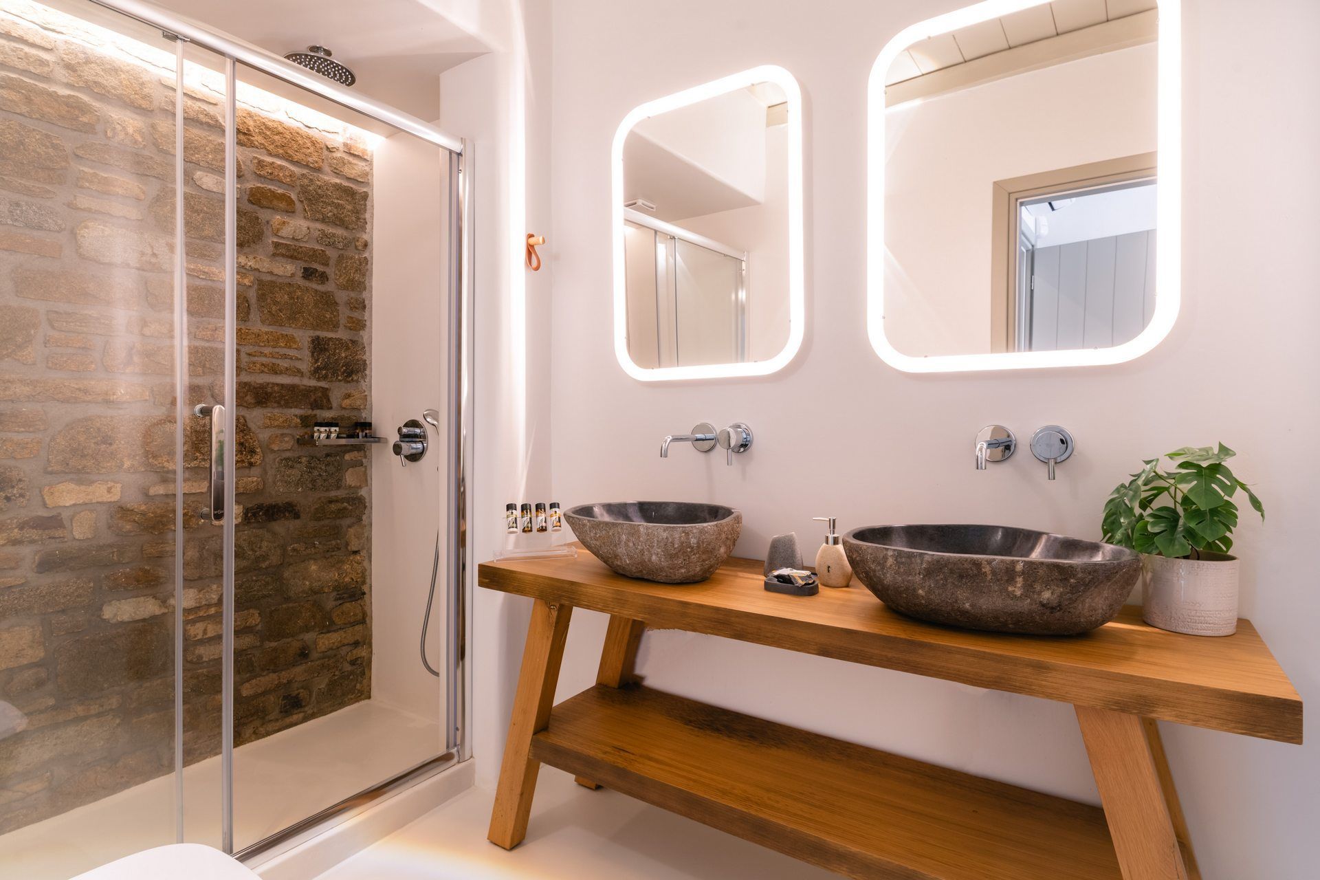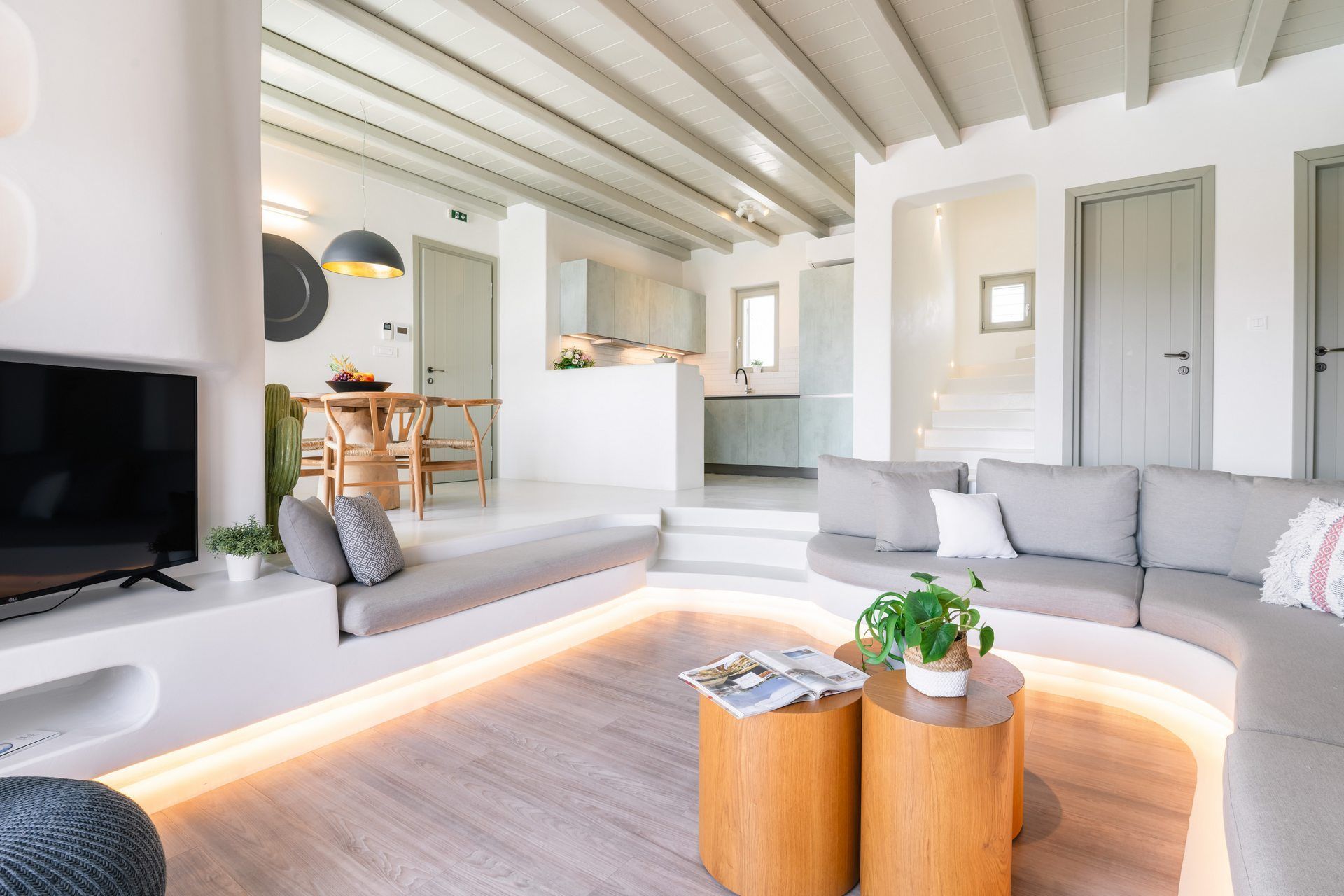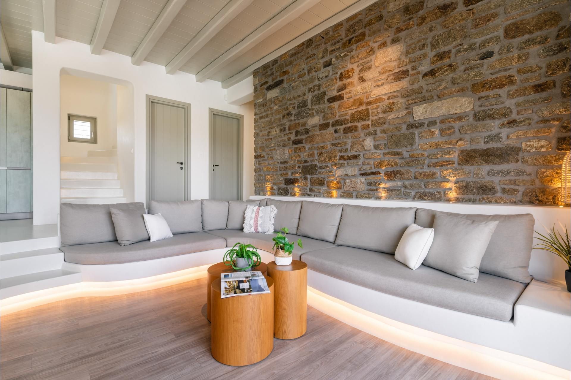 Built in line with the local architecture, Villa Silk brings together everything multigenerational groups often look for but rarely find in one place. Located in the Kalafatis area of Mykonos, and not far from the beach, the estate sleeps up to 22 guests in eleven ensuite bedrooms spread across two luxury villas. The design is contemporary and consistent without feeling over-styled, which appeals to guests who value clean lines, open views, and the ability to travel as a group while still keeping some personal space.