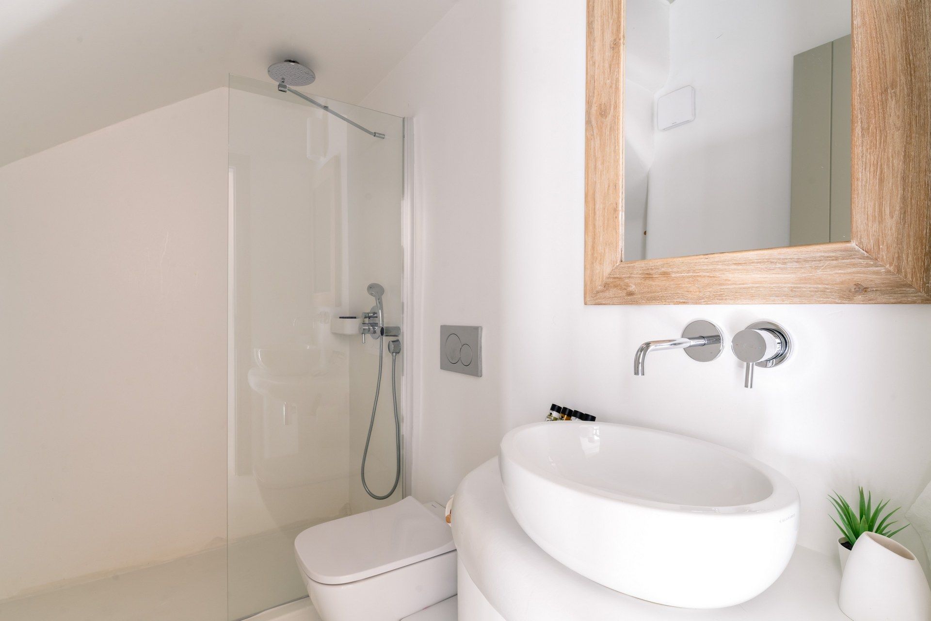 1 bedroom with double bed, ensuite bathroom with shower and double sink, A/C, TV, safe box, access to the pool terrace, pool and sea view