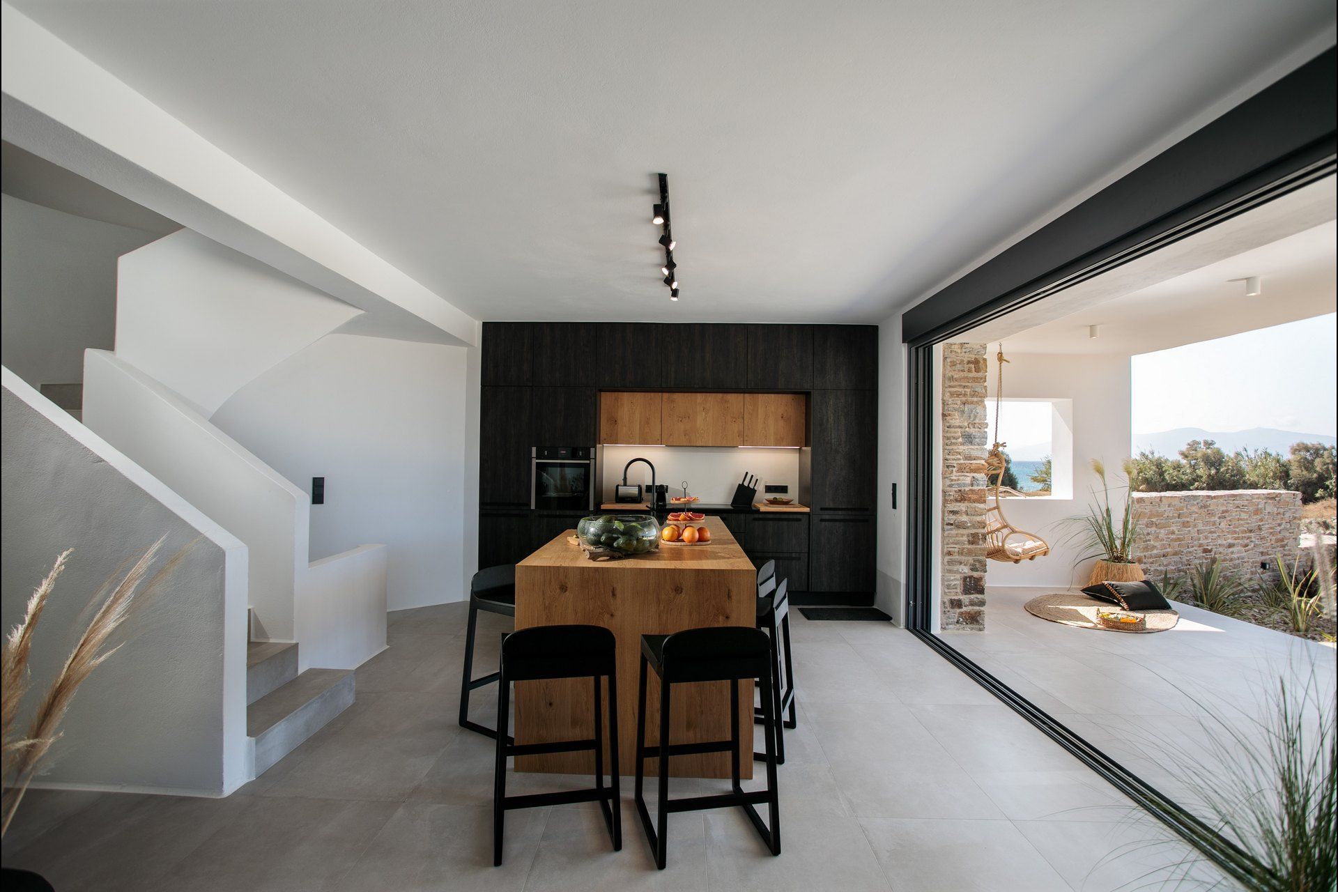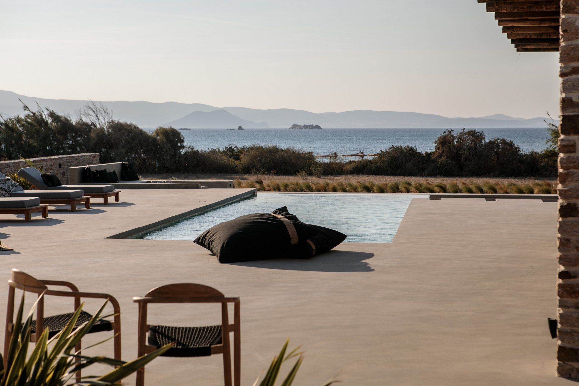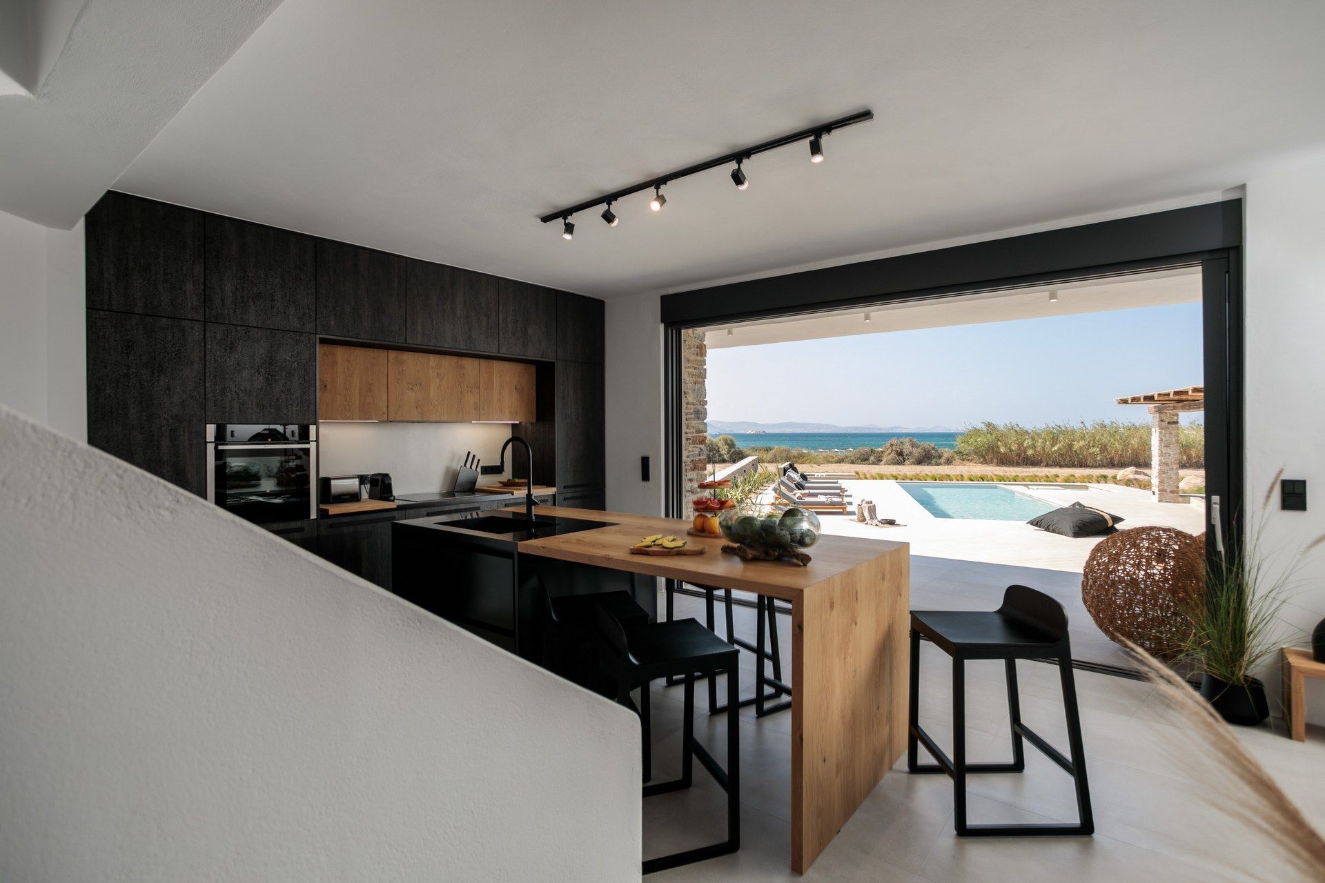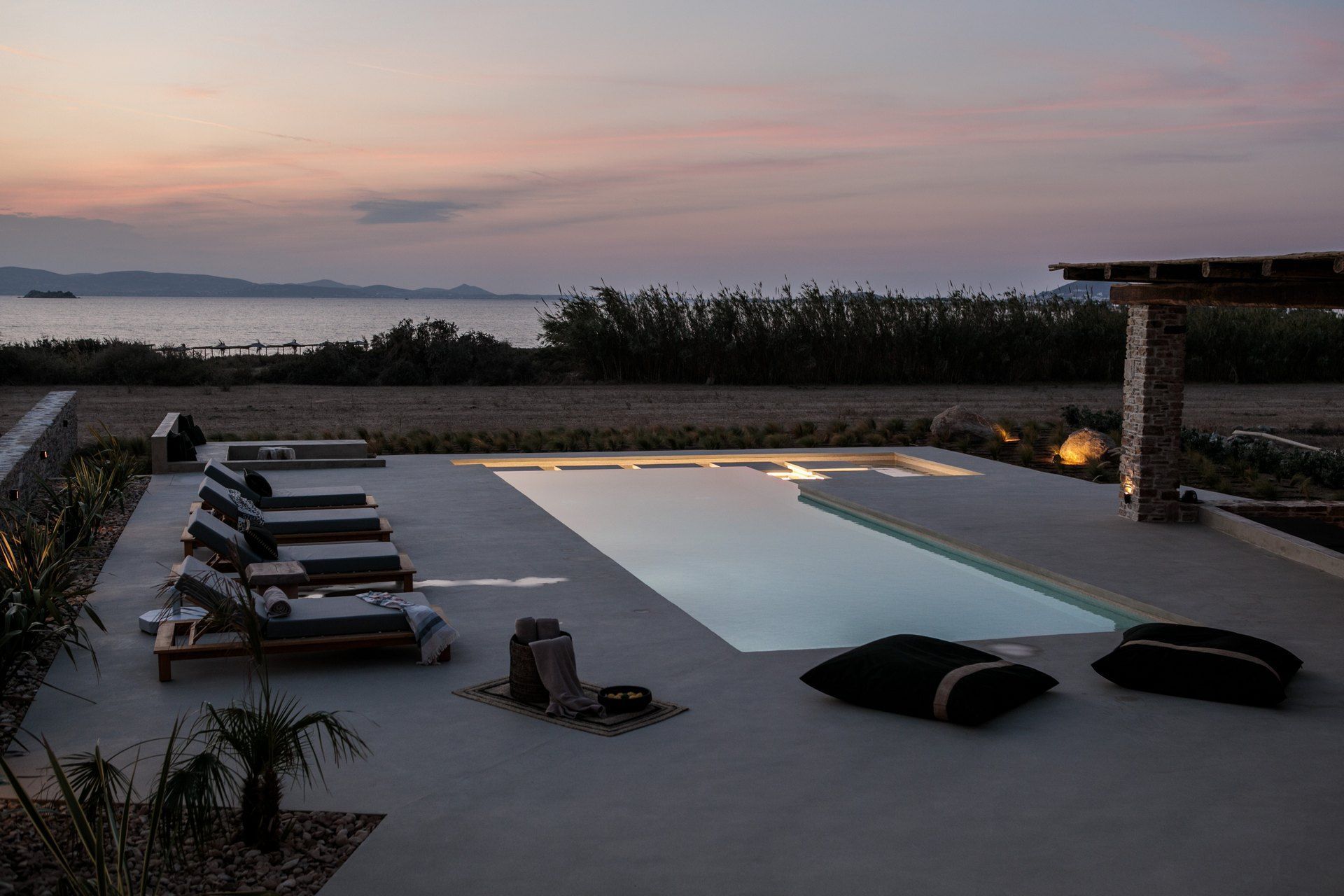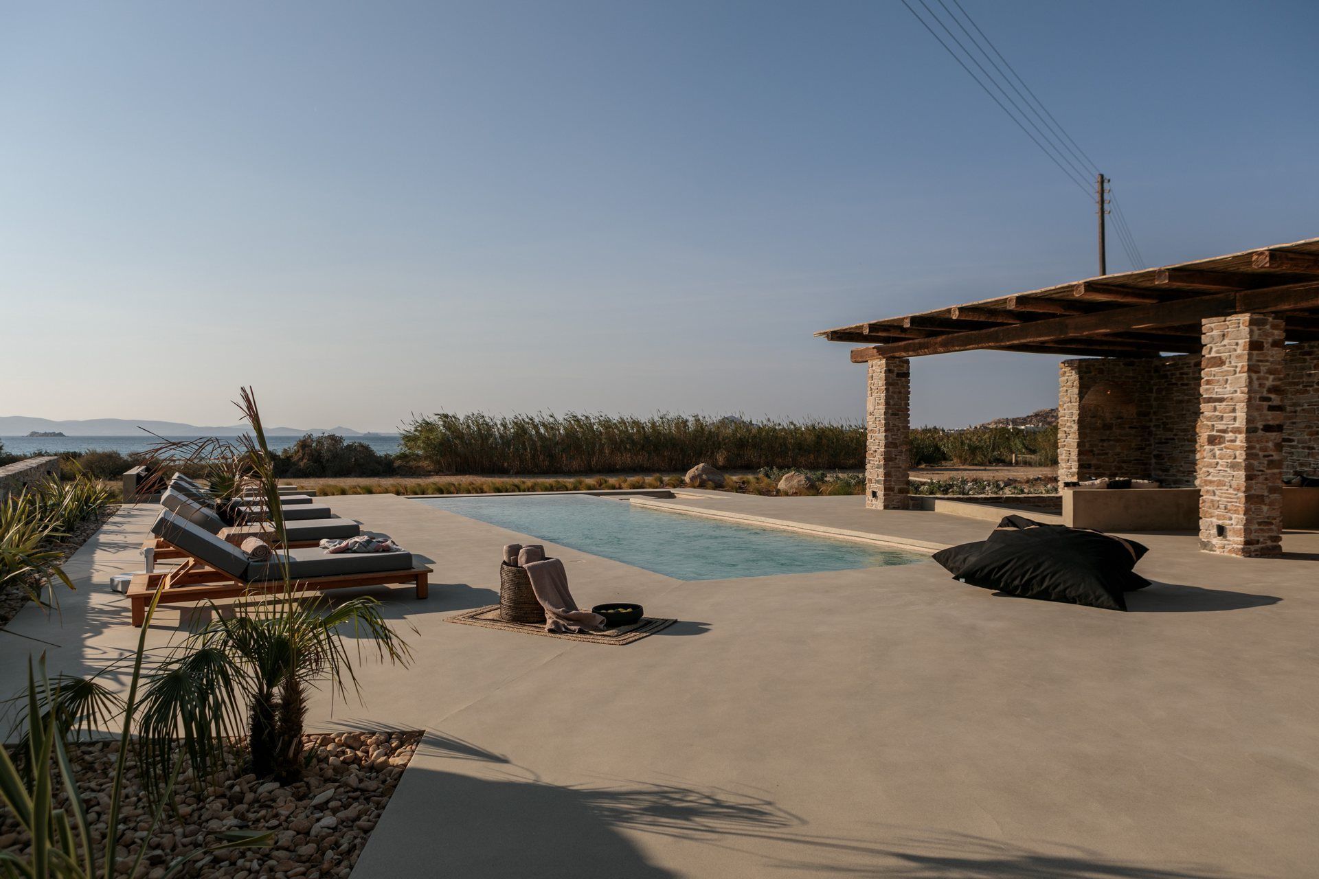 Villa Crumbelle is the kind of place where you can forget schedules, because the beach is literally at your doorstep. Set in Orkos, Naxos, it hosts up to eight guests plus four children across five bedrooms arranged over three levels. The design stays bright and minimal, with white surfaces, natural stone, and simple forms that feel contemporary yet deeply Cycladic. Panoramic sea views and sunset light shape the mood, while the pool and two jacuzzis anchor daily life outdoors.