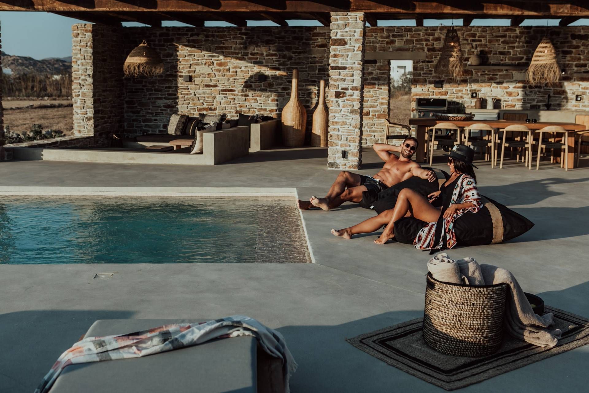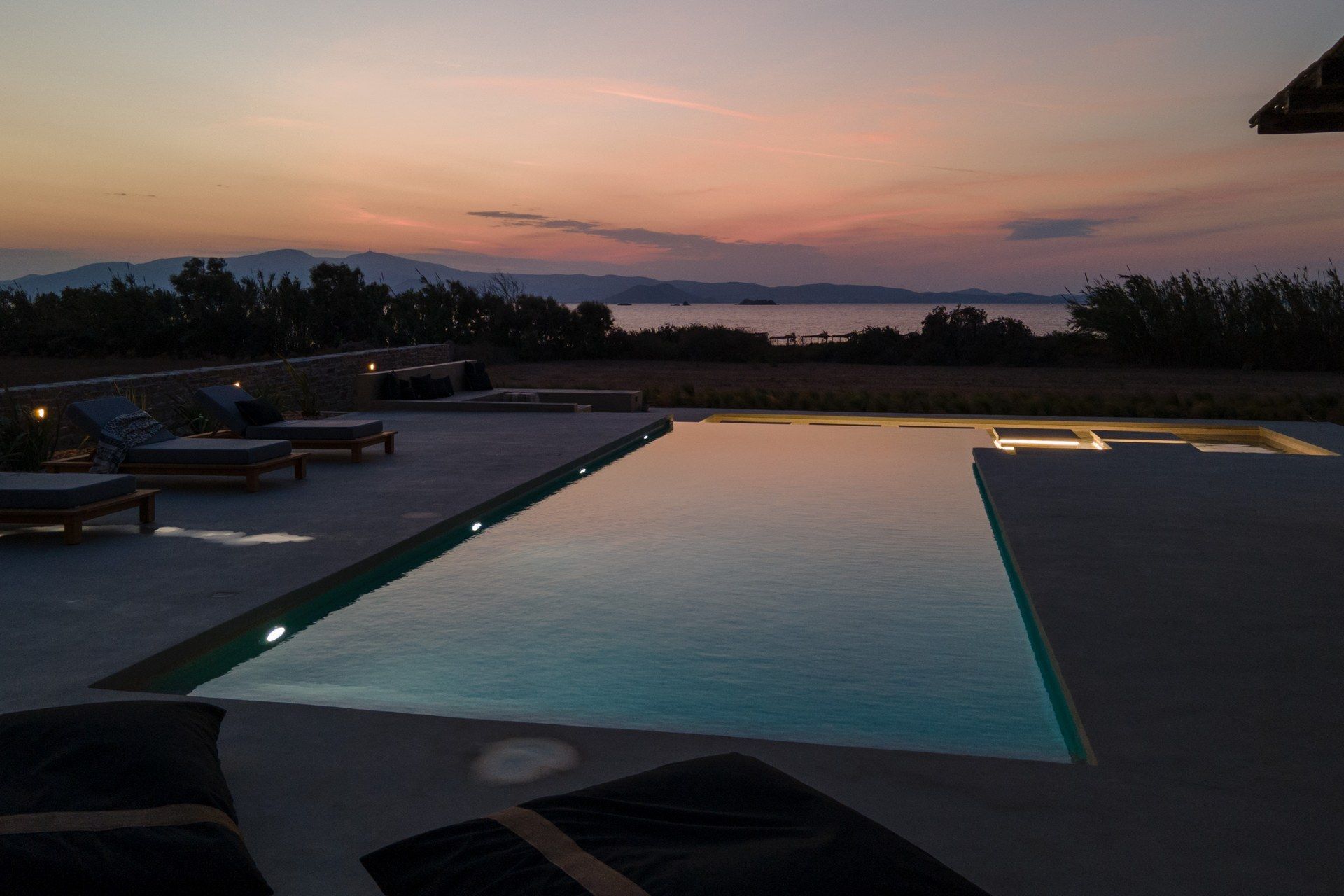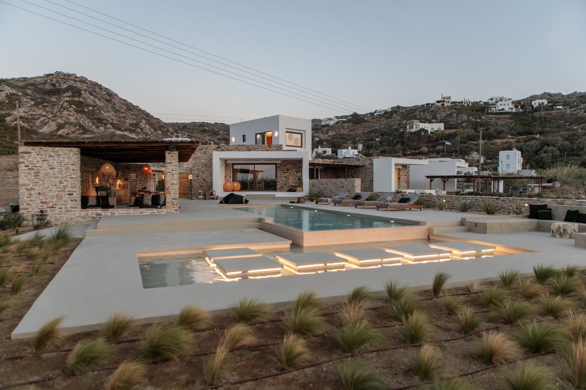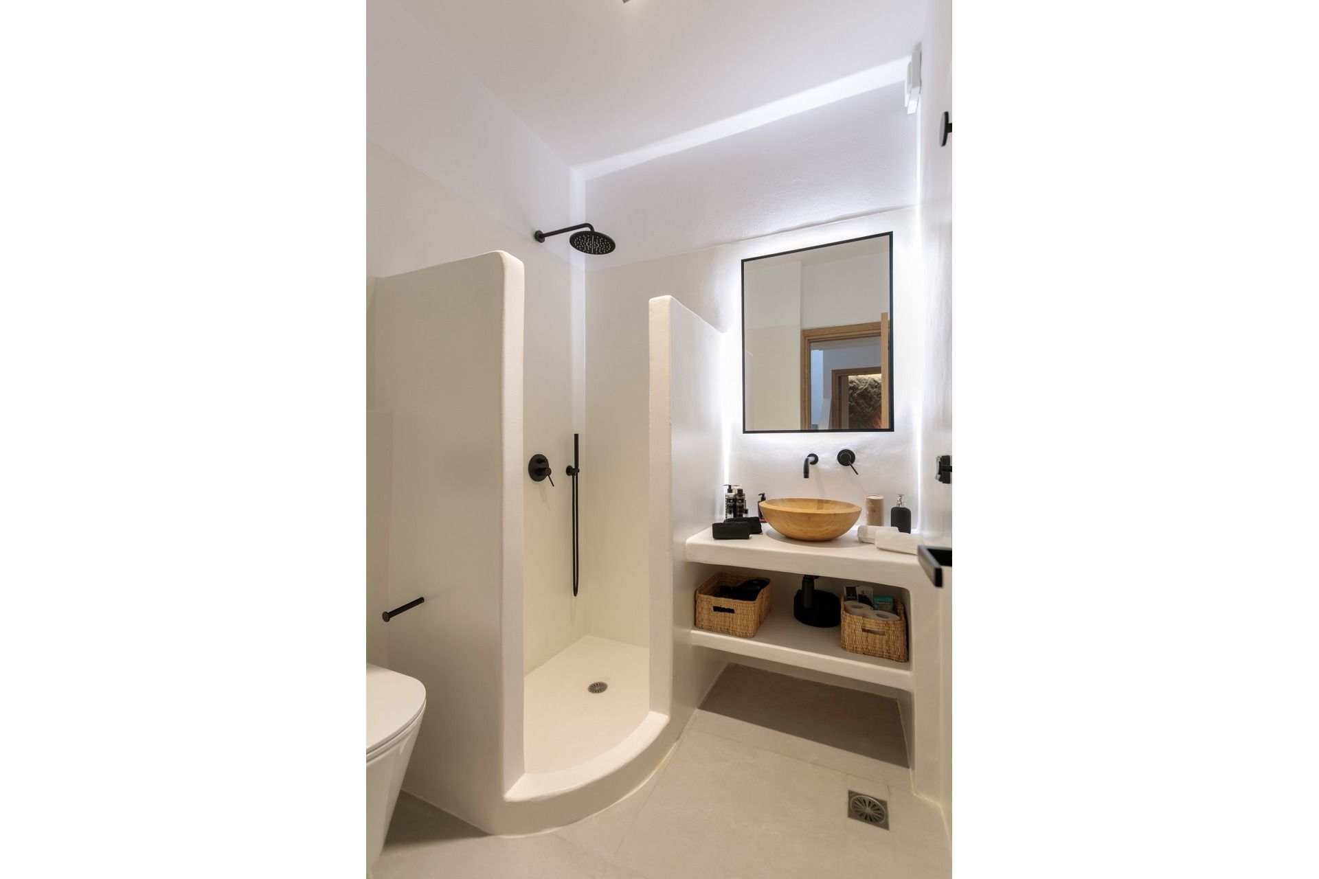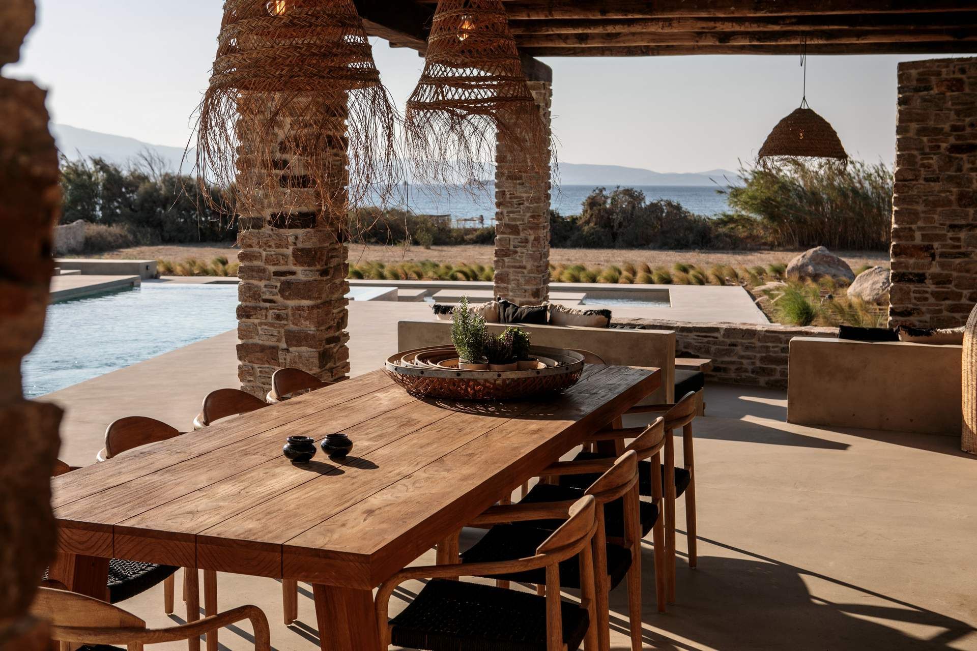 Villa Crumbelle is the kind of place where you can forget schedules, because the beach is literally at your doorstep. Set in Orkos, Naxos, it hosts up to eight guests plus four children across five bedrooms arranged over three levels. The design stays bright and minimal, with white surfaces, natural stone, and simple forms that feel contemporary yet deeply Cycladic. Panoramic sea views and sunset light shape the mood, while the pool and two jacuzzis anchor daily life outdoors.