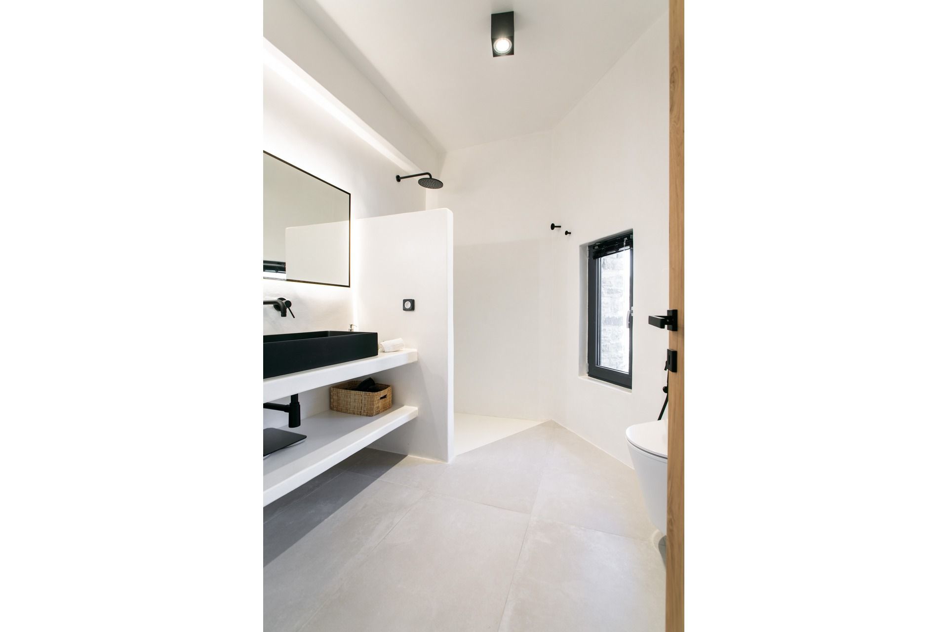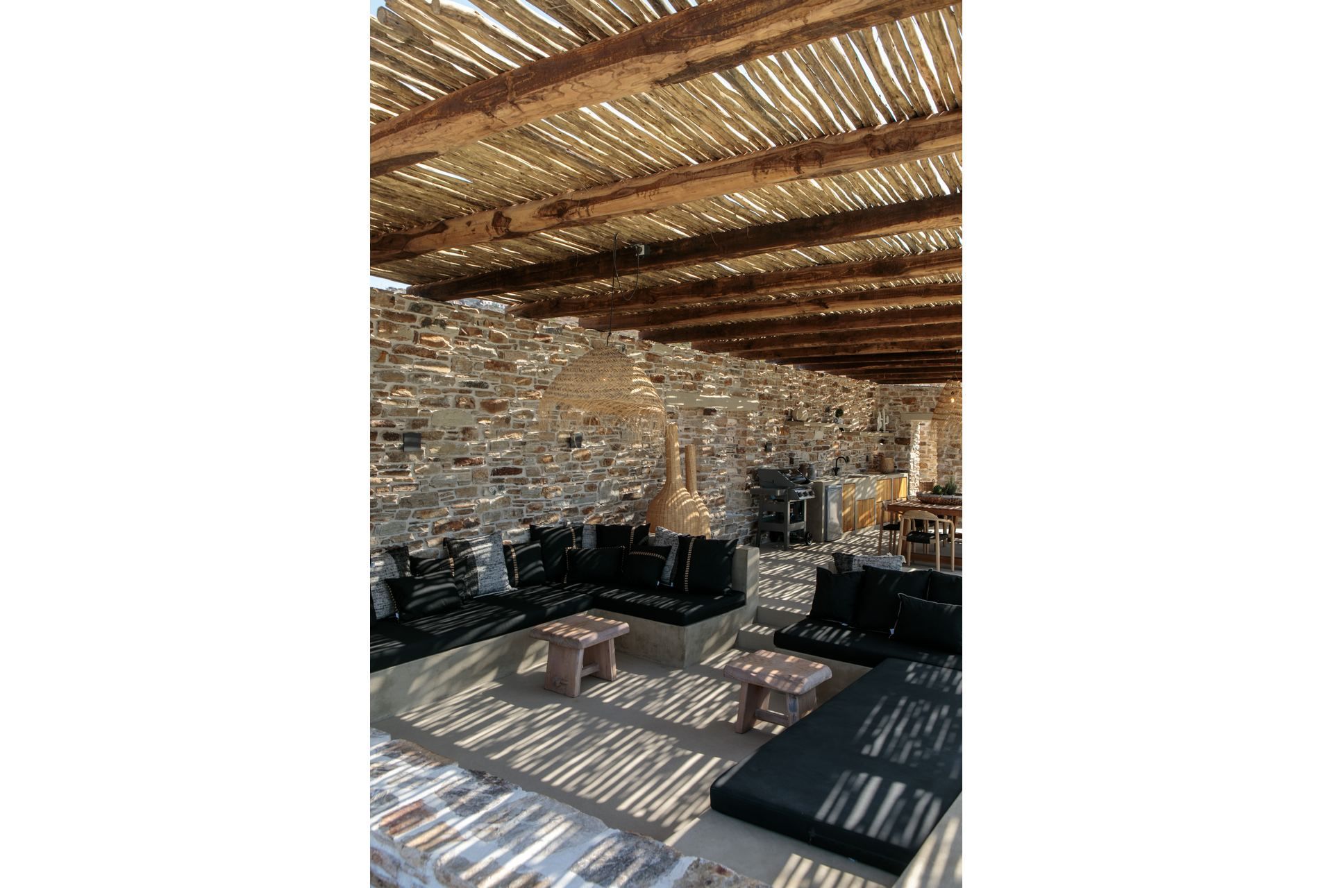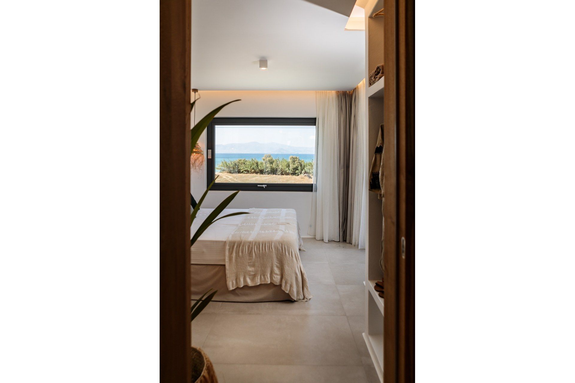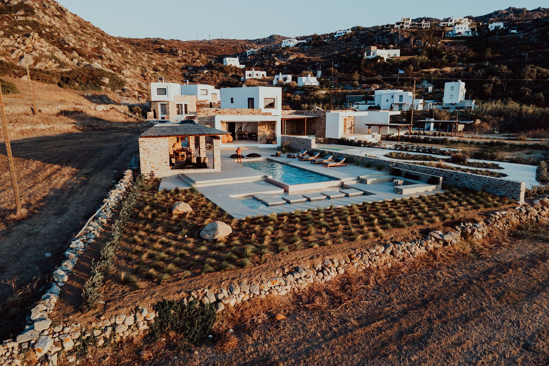 Villa Crumbelle is the kind of place where you can forget schedules, because the beach is literally at your doorstep. Set in Orkos, Naxos, it hosts up to eight guests plus four children across five bedrooms arranged over three levels. The design stays bright and minimal, with white surfaces, natural stone, and simple forms that feel contemporary yet deeply Cycladic. Panoramic sea views and sunset light shape the mood, while the pool and two jacuzzis anchor daily life outdoors.