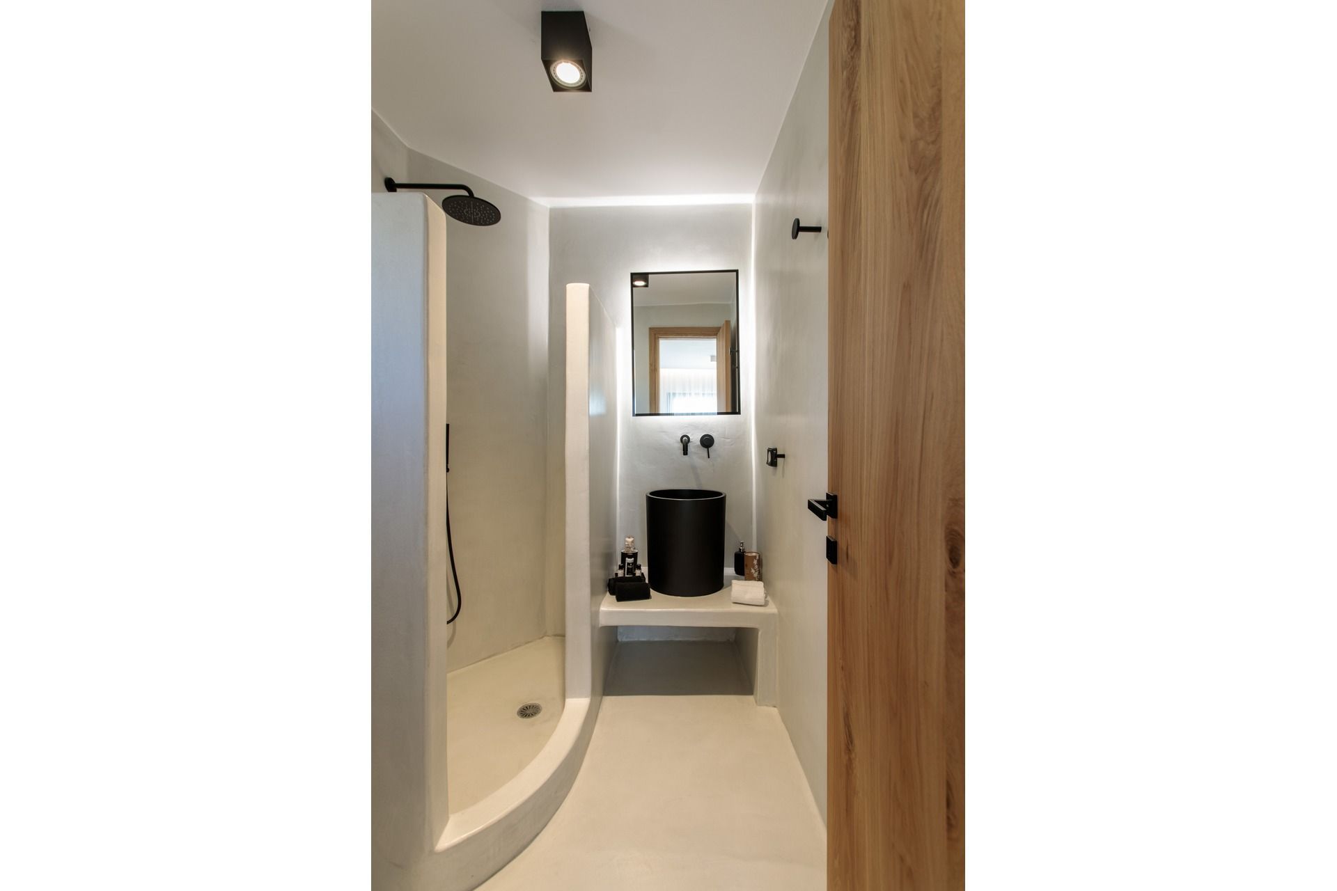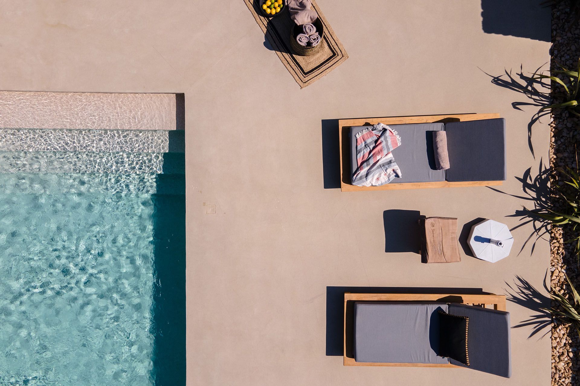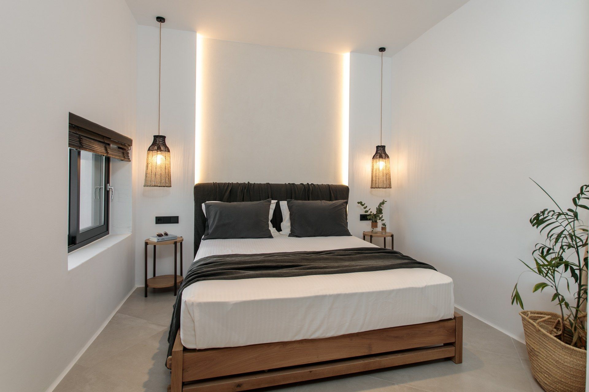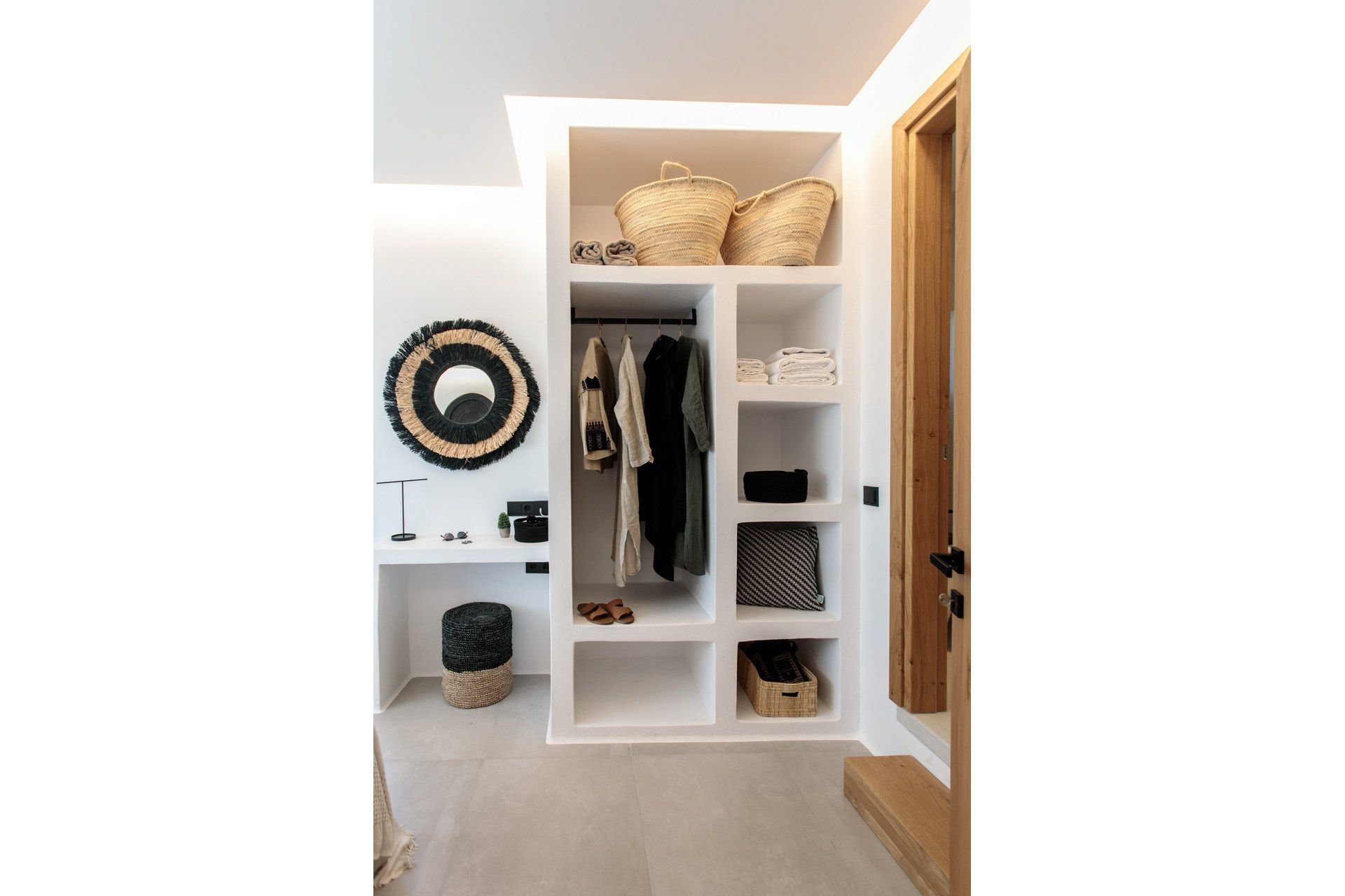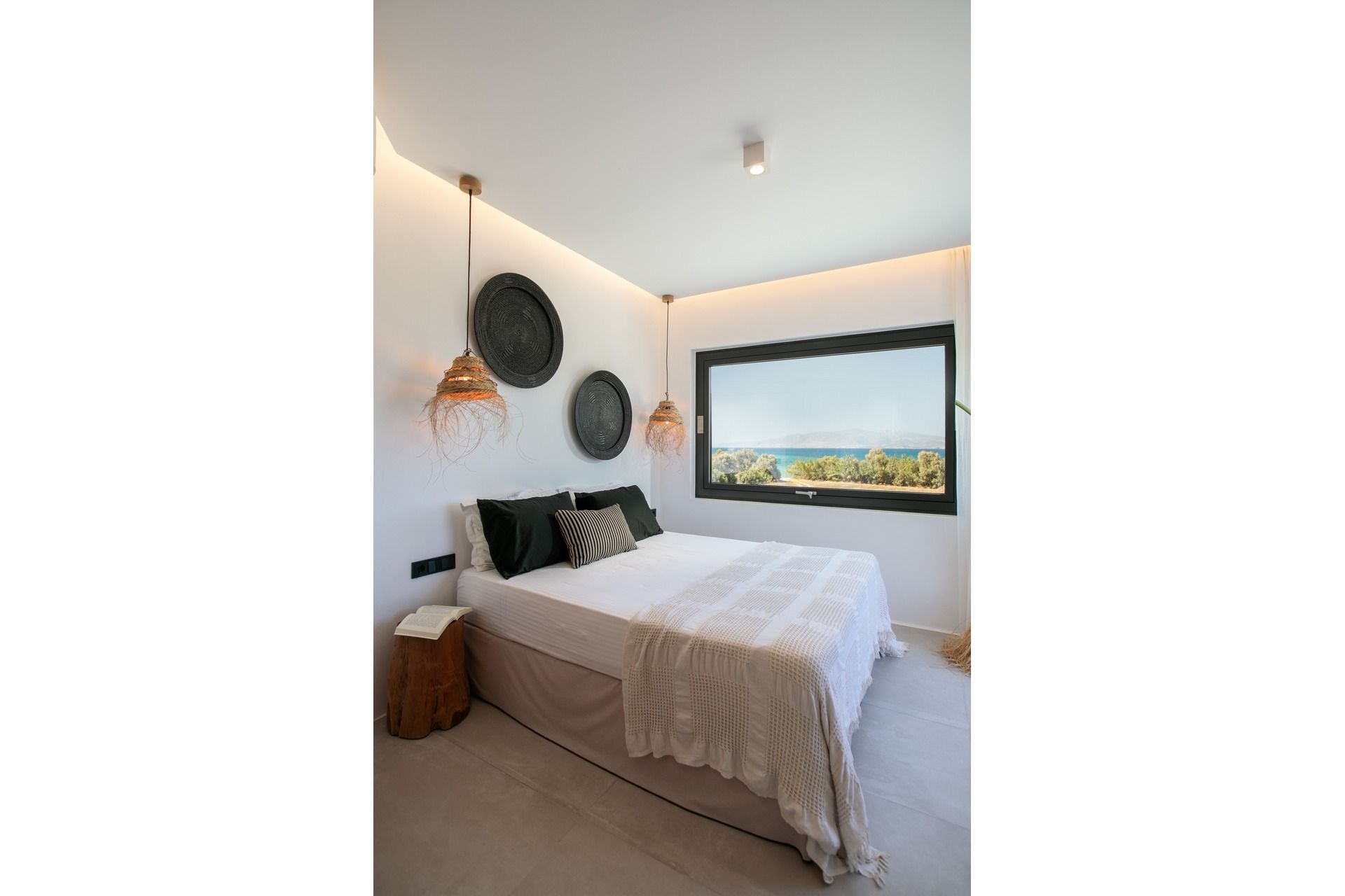 Villa Crumbelle is the kind of place where you can forget schedules, because the beach is literally at your doorstep. Set in Orkos, Naxos, it hosts up to eight guests plus four children across five bedrooms arranged over three levels. The design stays bright and minimal, with white surfaces, natural stone, and simple forms that feel contemporary yet deeply Cycladic. Panoramic sea views and sunset light shape the mood, while the pool and two jacuzzis anchor daily life outdoors.