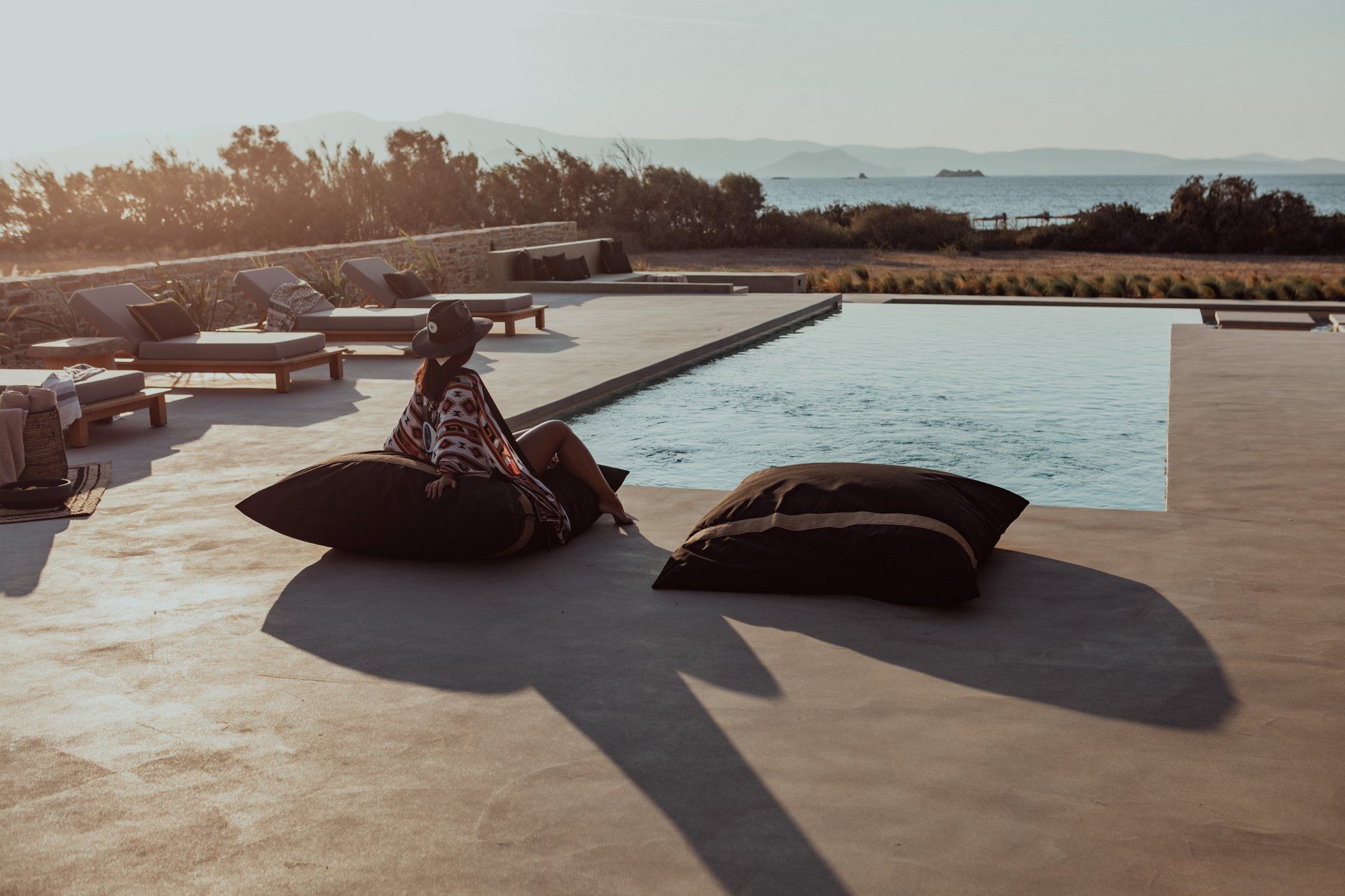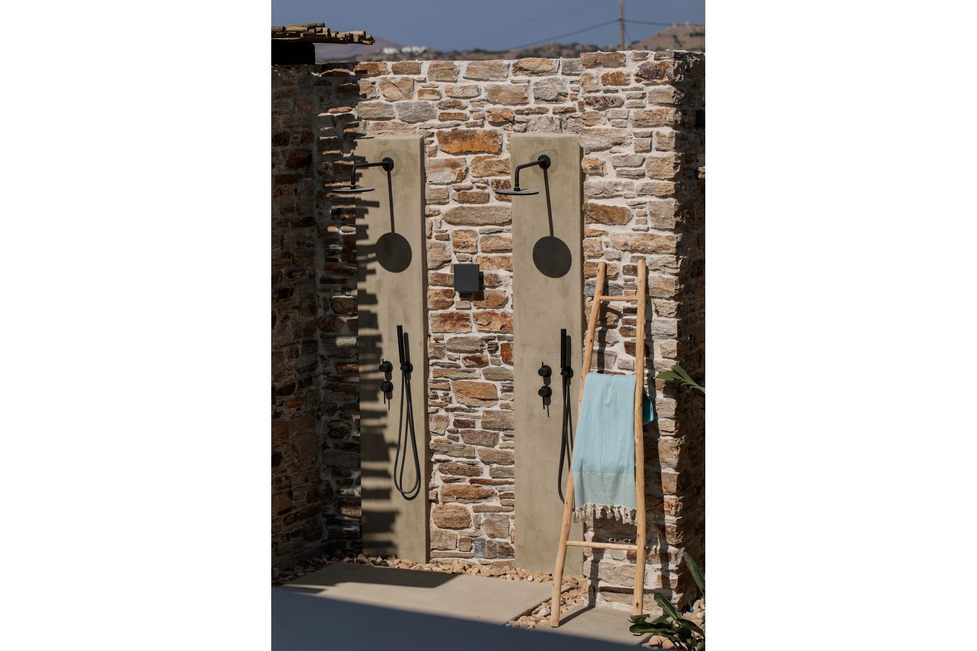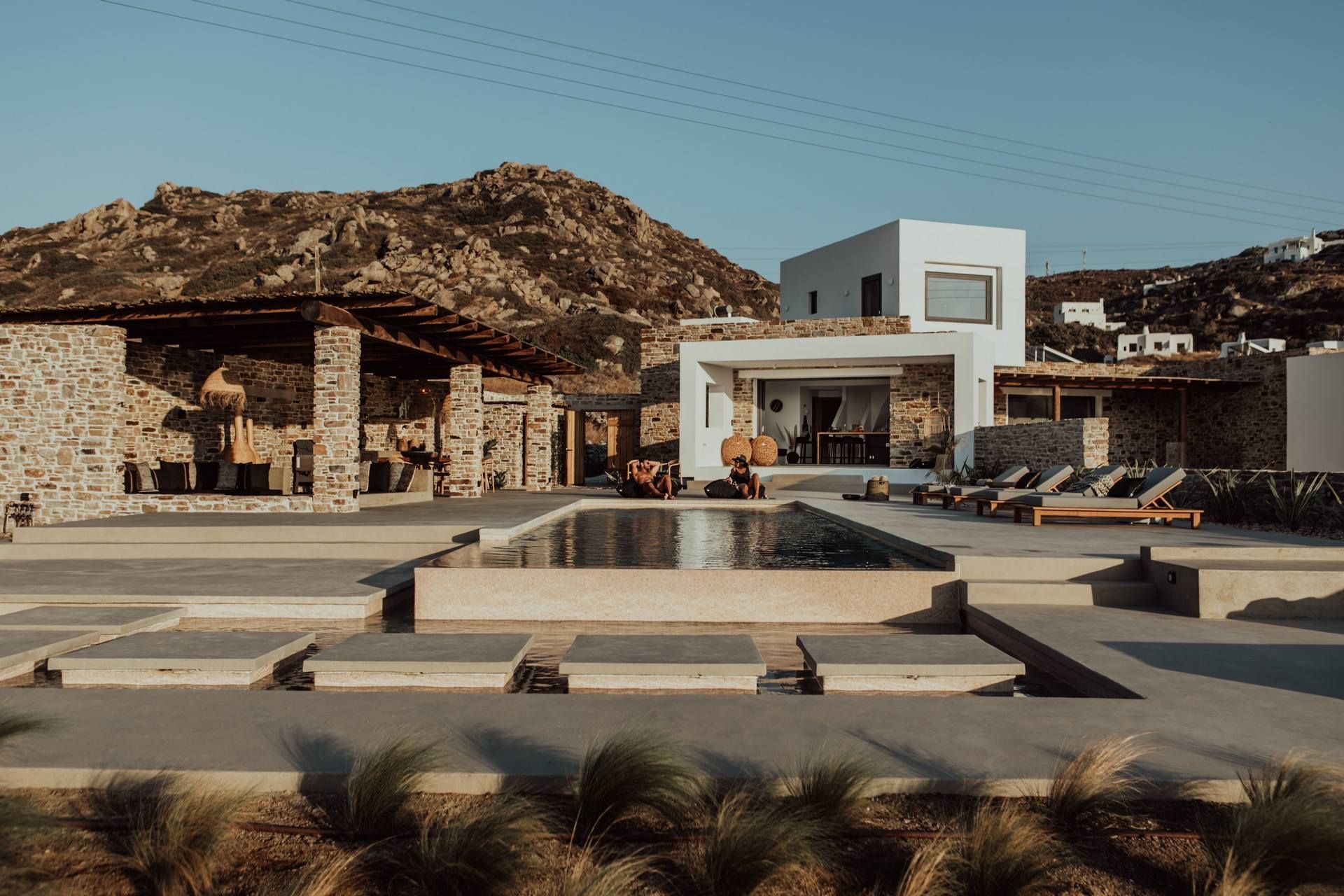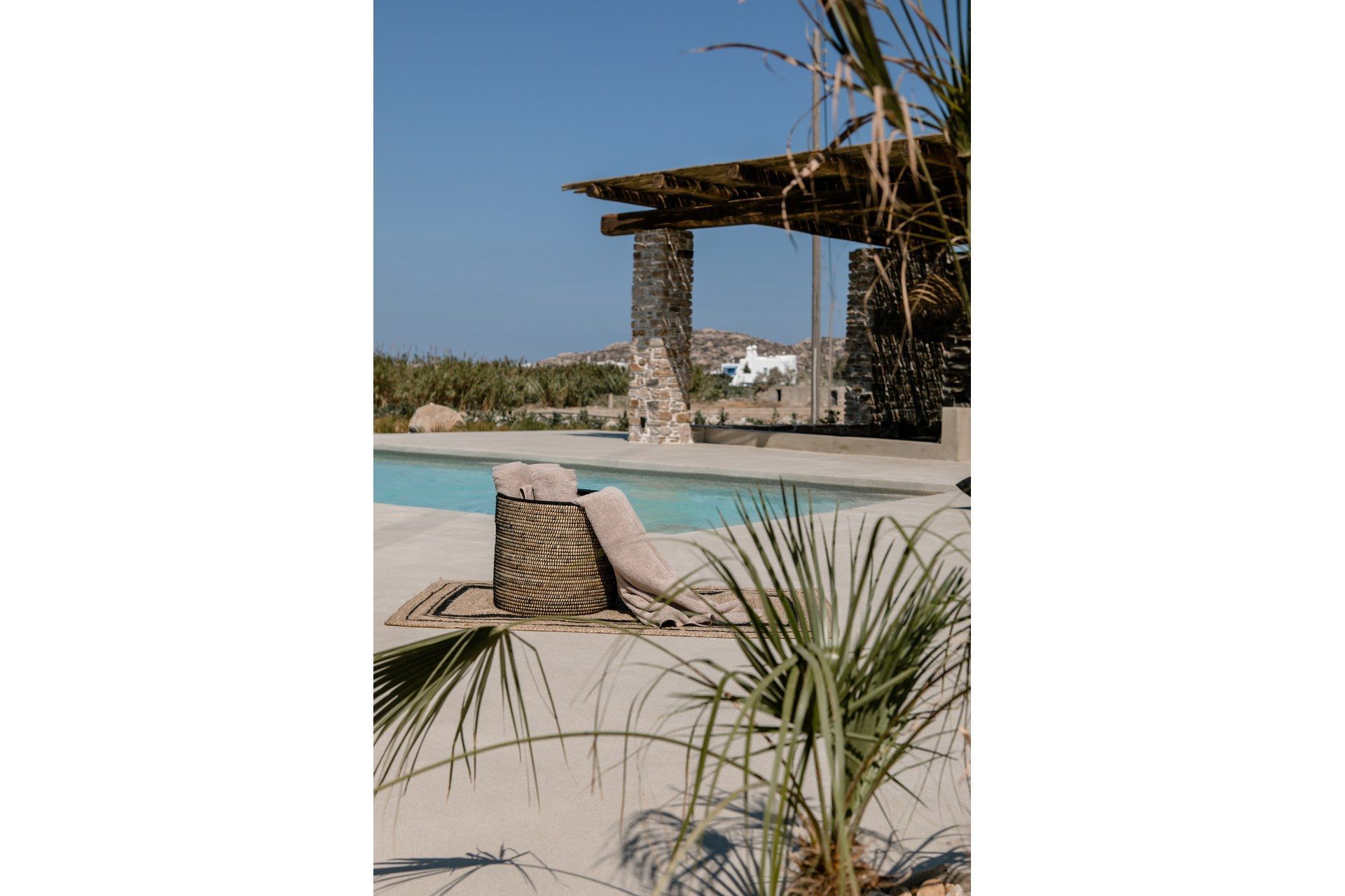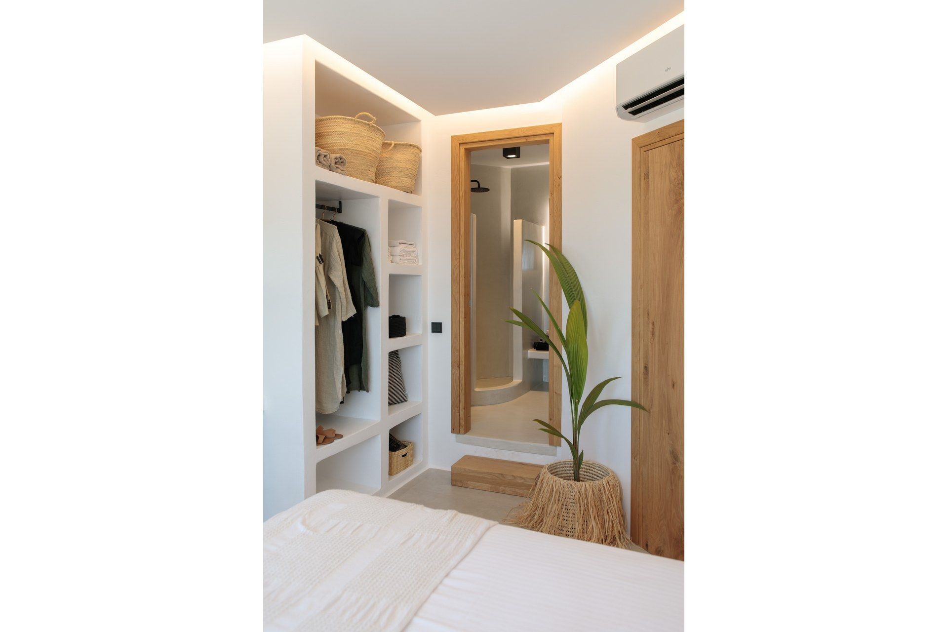 Villa Crumbelle is the kind of place where you can forget schedules, because the beach is literally at your doorstep. Set in Orkos, Naxos, it hosts up to eight guests plus four children across five bedrooms arranged over three levels. The design stays bright and minimal, with white surfaces, natural stone, and simple forms that feel contemporary yet deeply Cycladic. Panoramic sea views and sunset light shape the mood, while the pool and two jacuzzis anchor daily life outdoors.