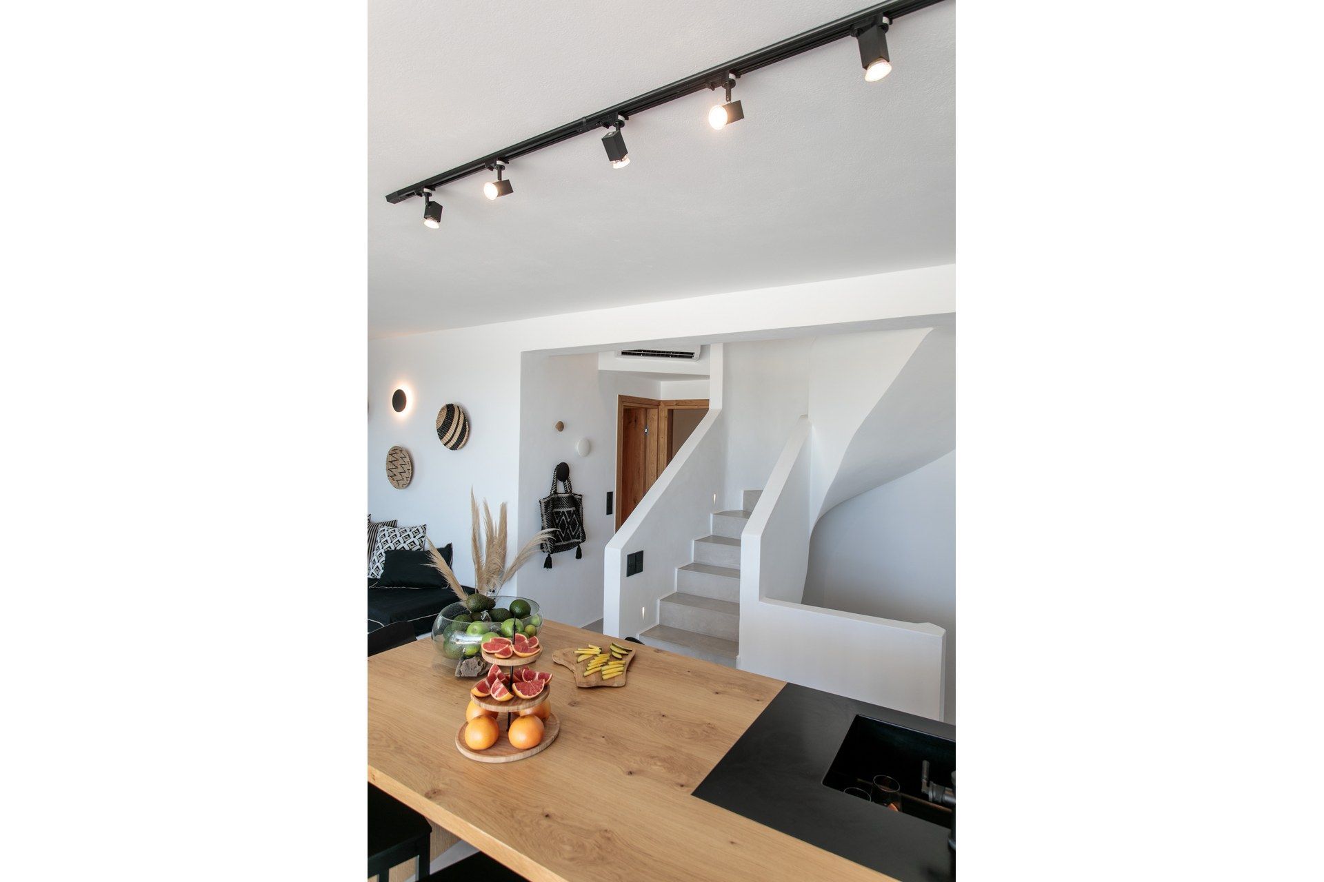 Outside, the villa is made for living in swimwear and sandals, with the sea always close enough to tempt you. The infinity pool overlooks the water and features jacuzzi jets, while the heated jacuzzi on the top veranda is made for slower evenings and long conversations. A shaded lounge and dining area create a natural gathering place, supported by an outdoor kitchen and gas barbecue. With sun loungers, a garden, and a sound system, the terrace quickly becomes the center of the day.