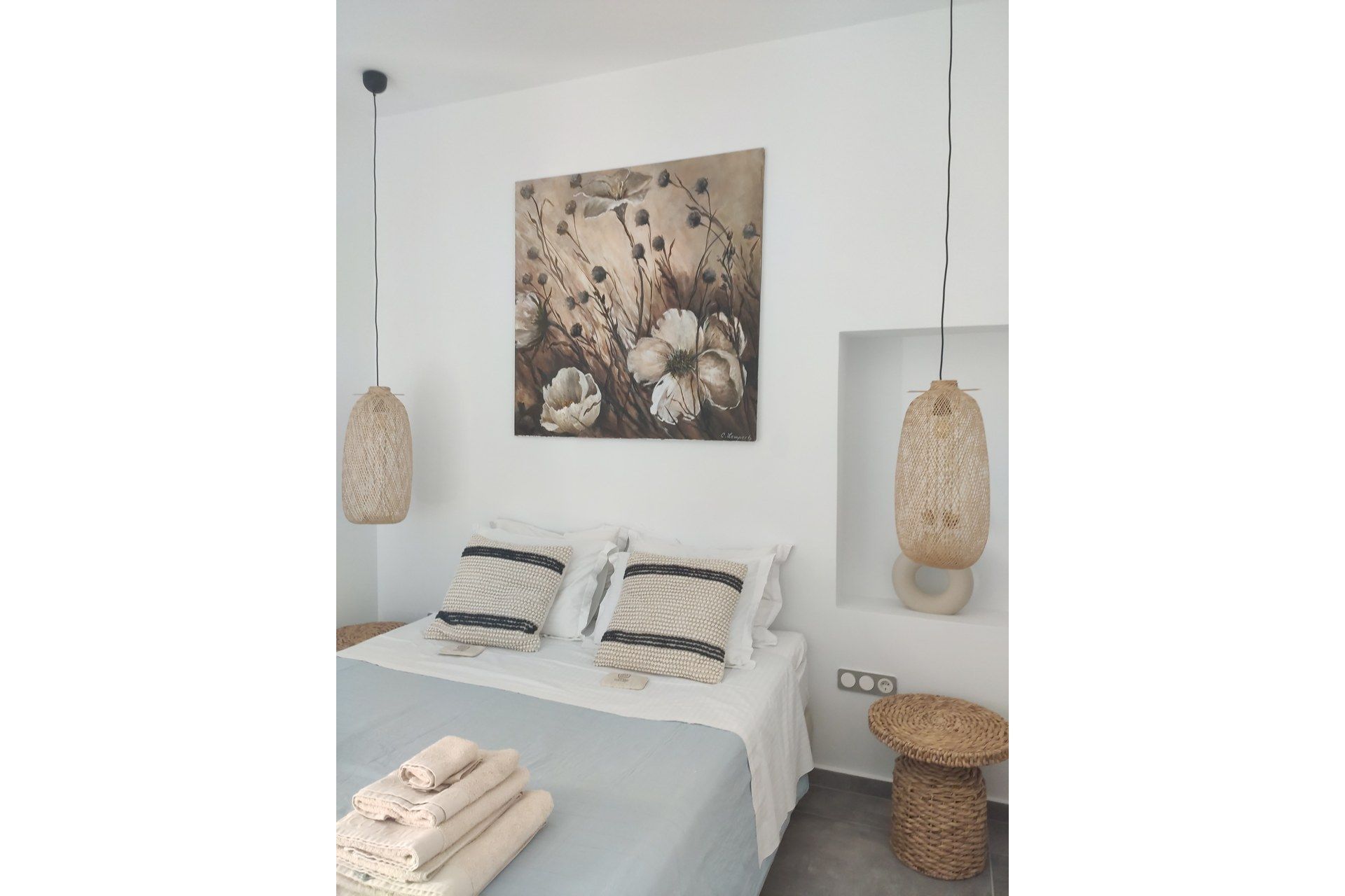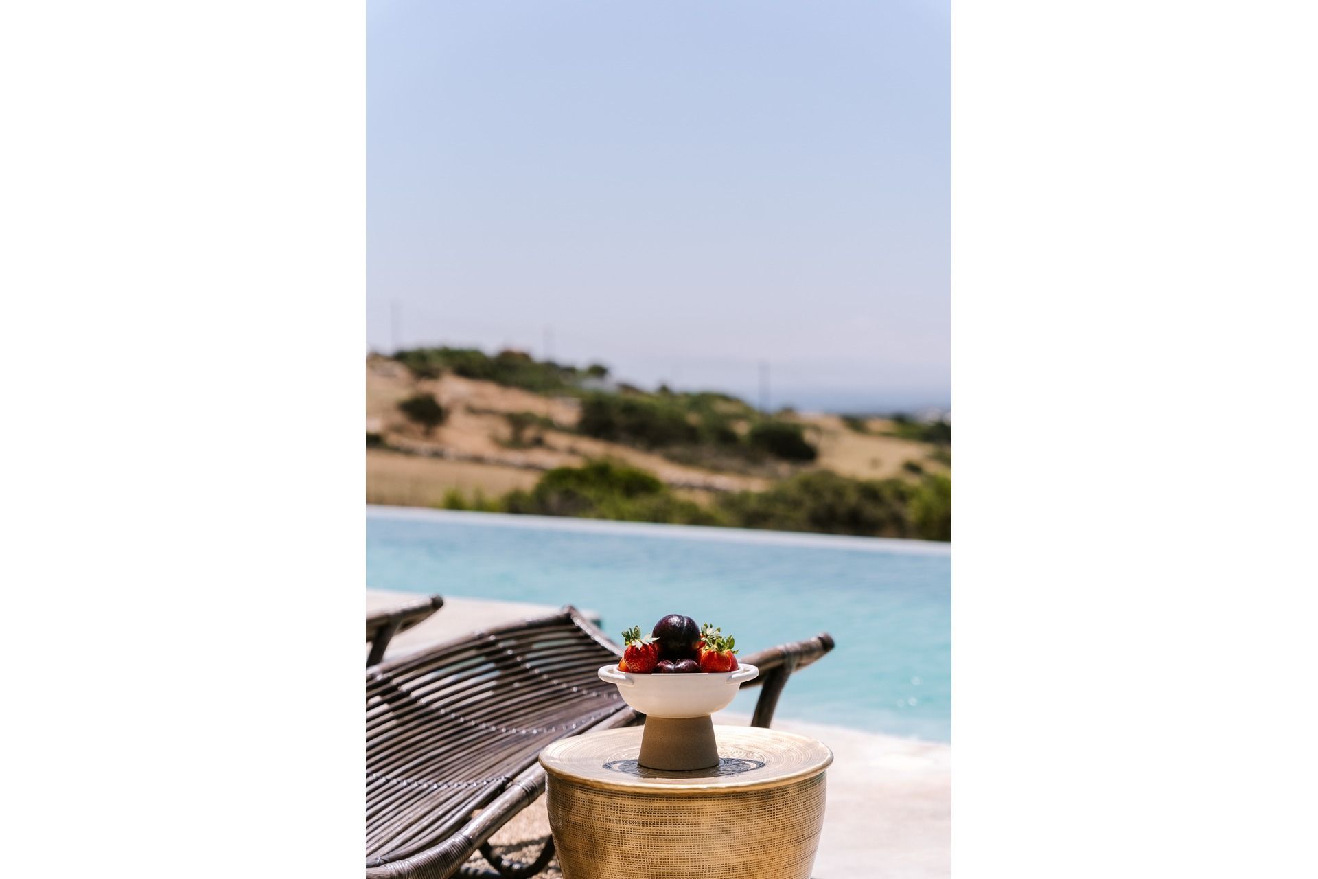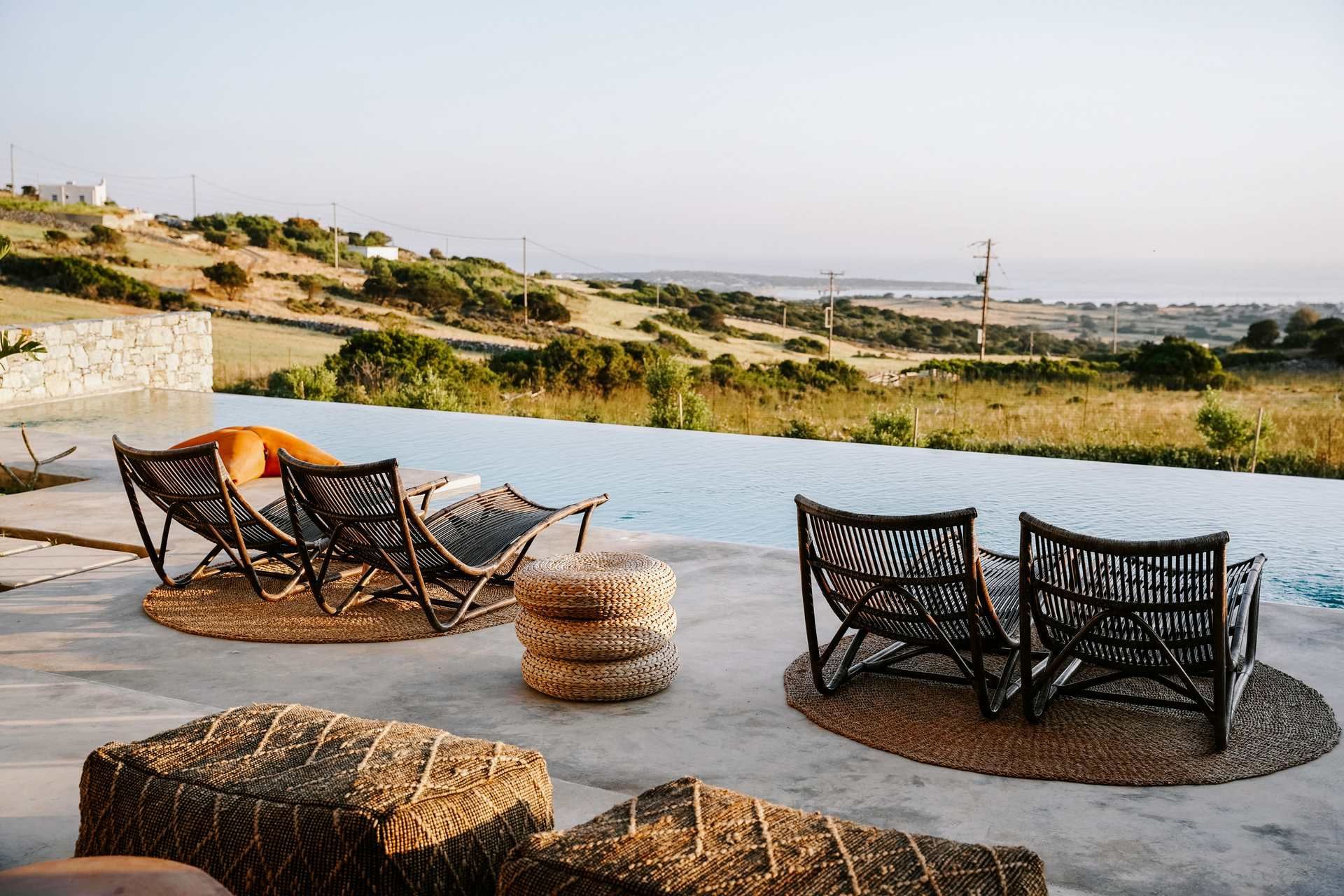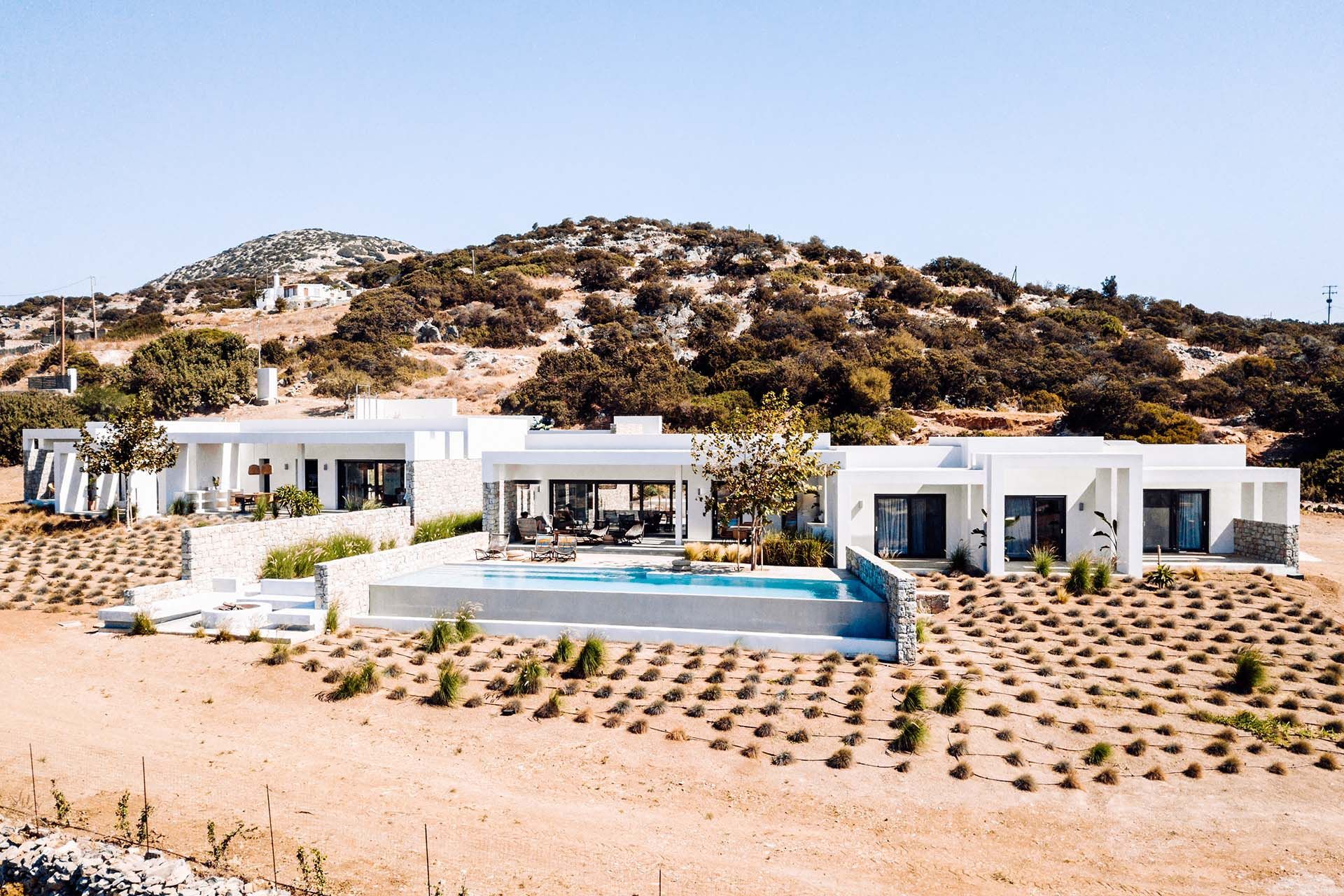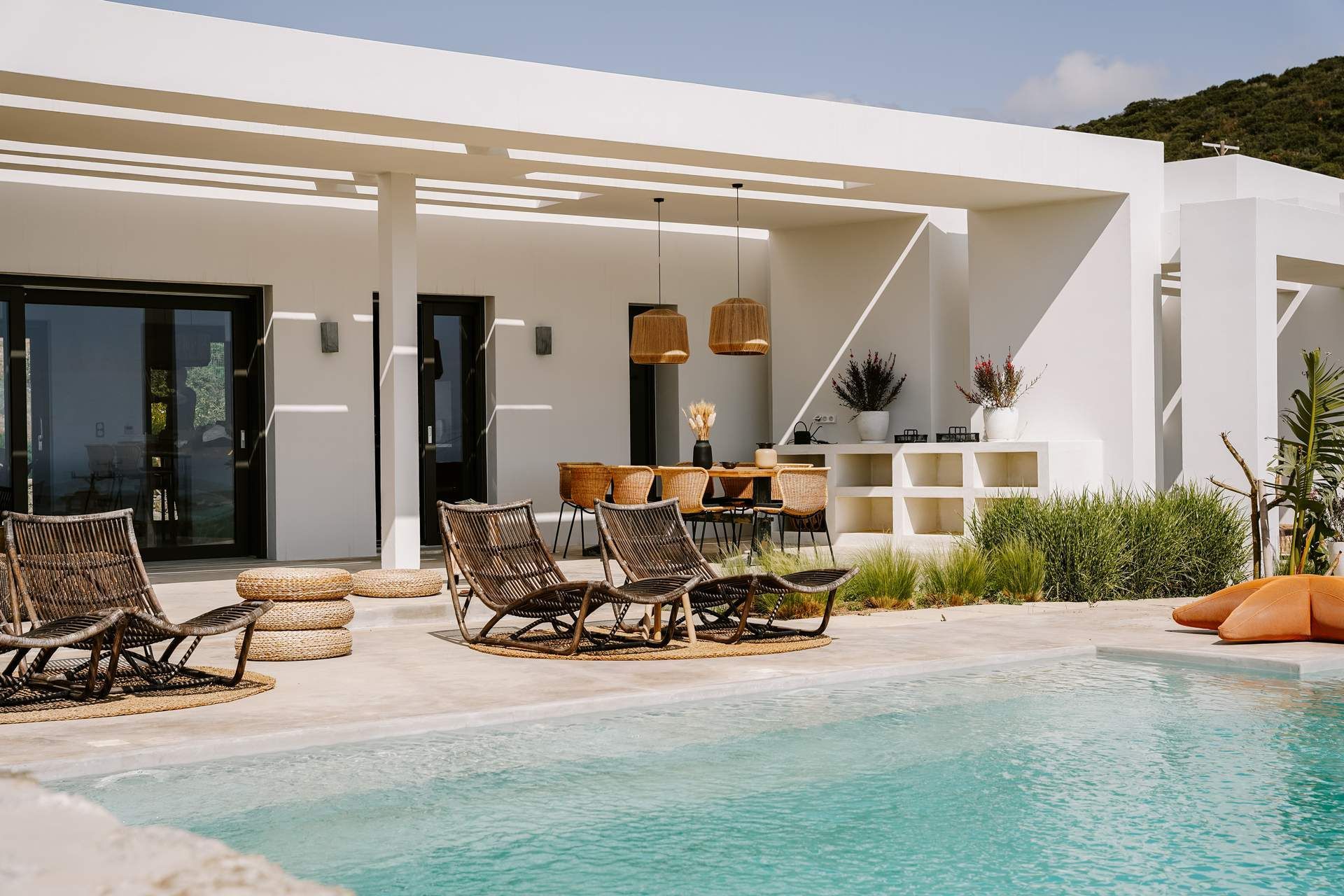 Villa Velour offers a grounded and flexible space for those who value understated comfort, thoughtful design, and the natural beauty of Naxos. Quietly located in the southwest part of the island, the villa accommodates up to six guests plus 2 children across three independent bedrooms, blending Cycladic architecture with a modern, earthy sensibility. It’s a place where you can be together without feeling confined, with open views, gentle sea breezes, and enough space to make each day your own.