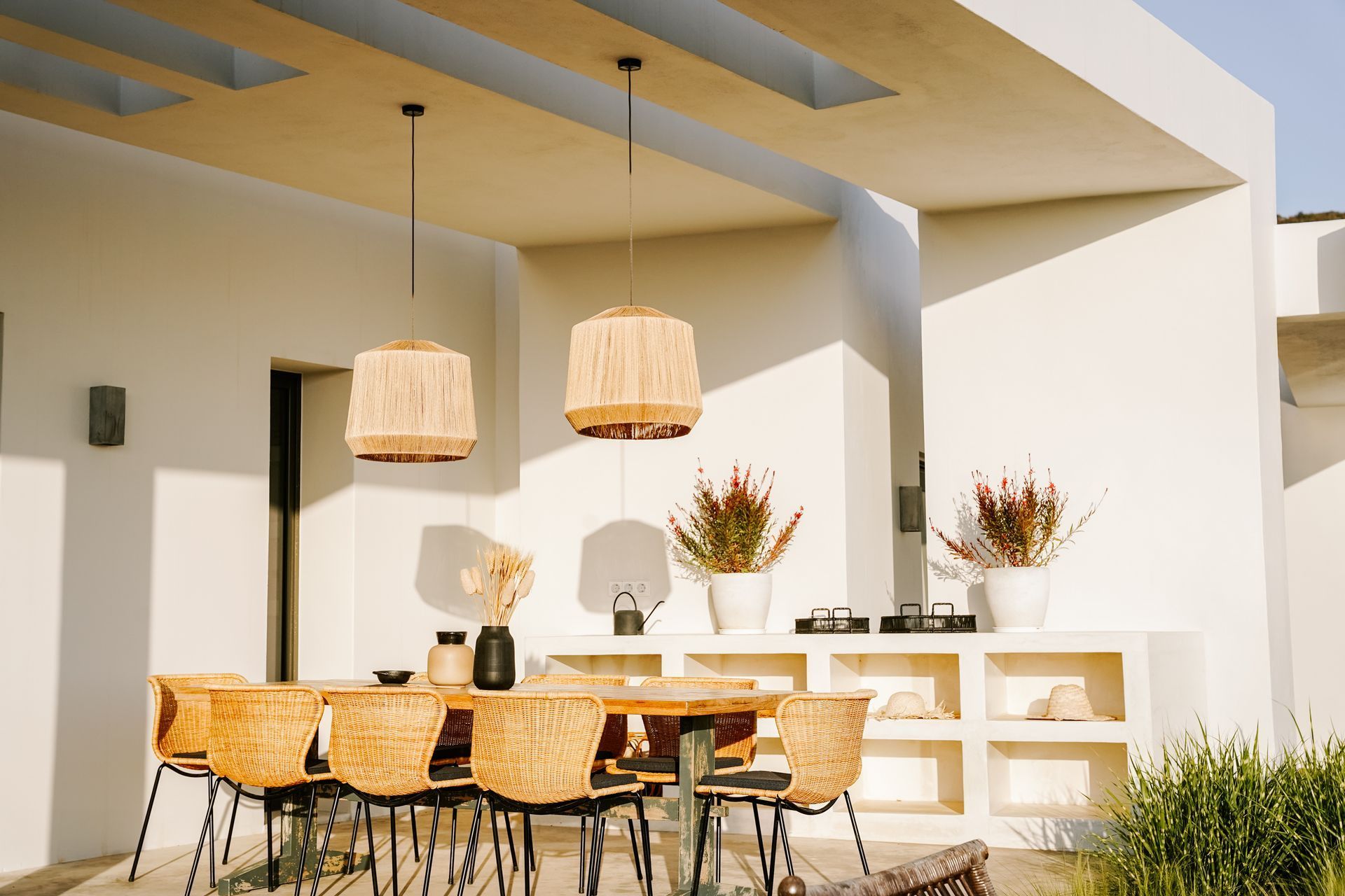 The outdoor layout centers around an infinity pool that opens to the sea, offering an ever-changing view throughout the day. The surrounding terrace is well-furnished with sun loungers, shaded corners, and a dedicated dining area perfect for open-air meals. Whether you're spending a quiet afternoon reading by the fire pit or gathering in the evening under the pergola, the outdoor areas are both functional and calming. A private gate and soft landscaping add to the sense of security and calm, making it particularly well-suited for families.