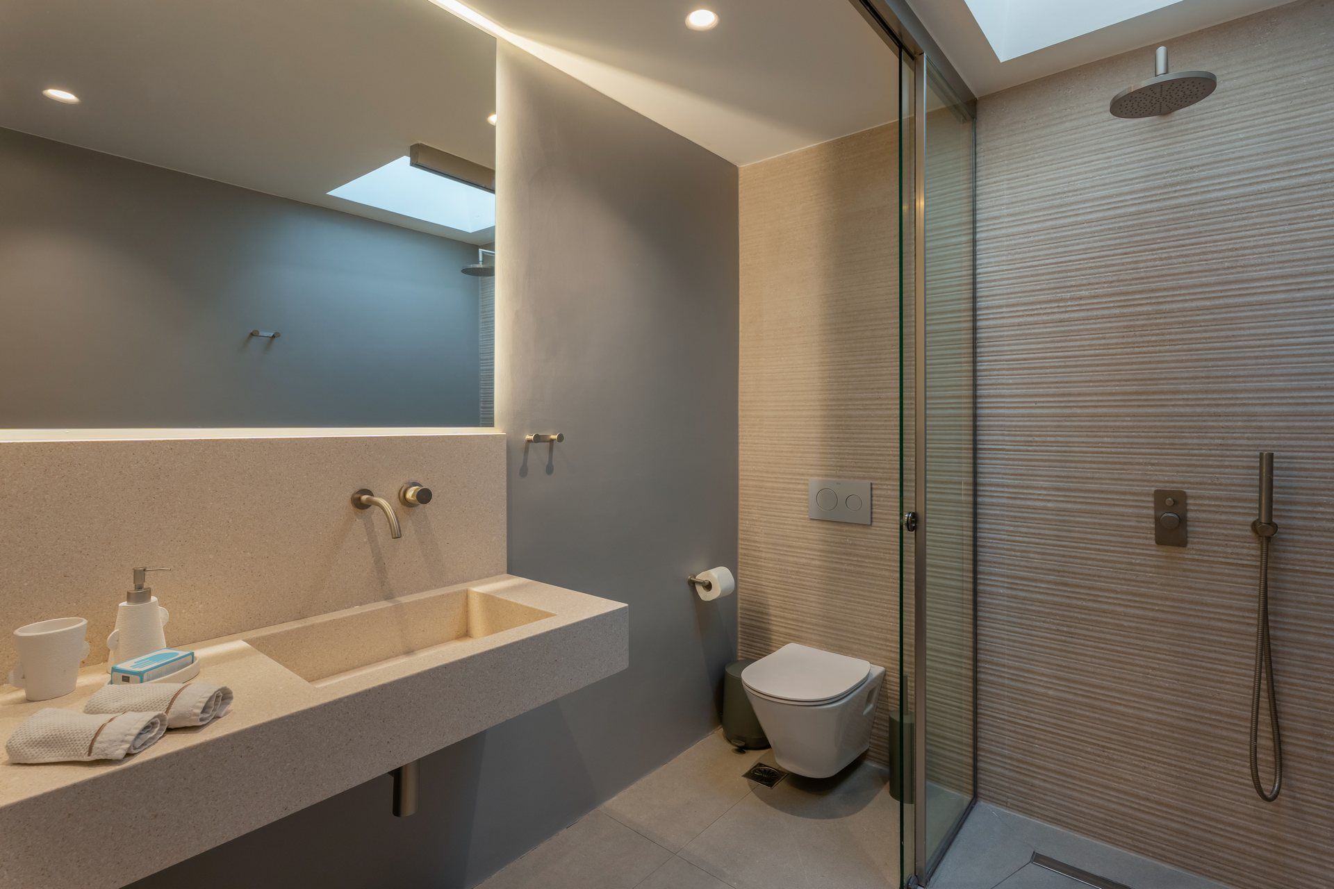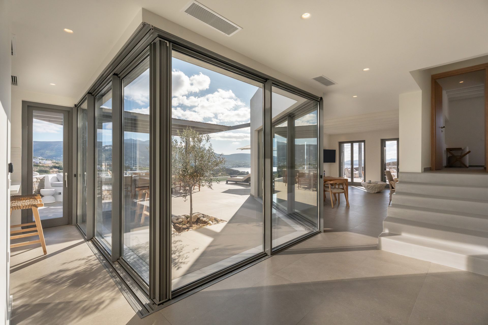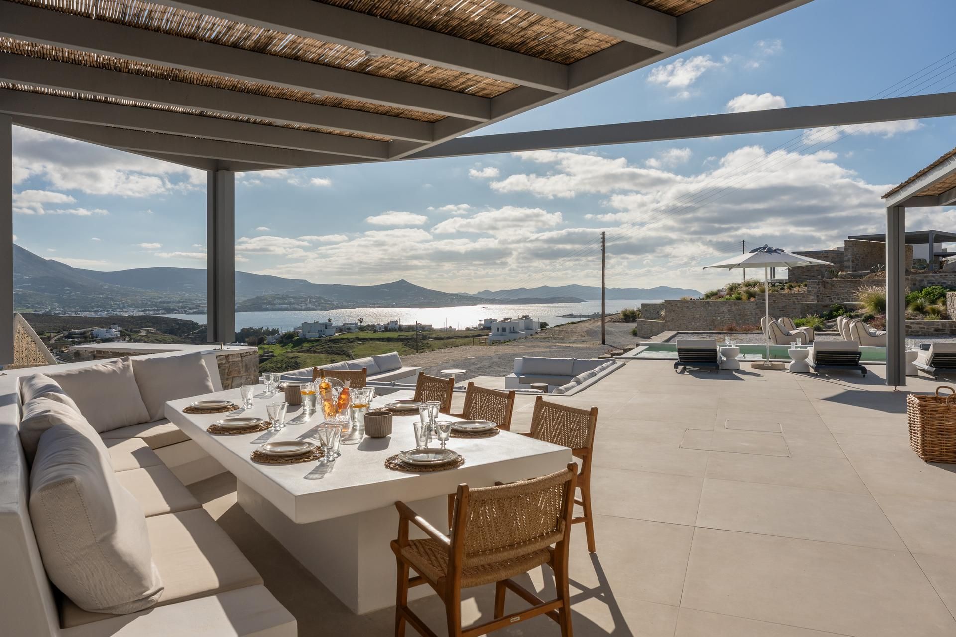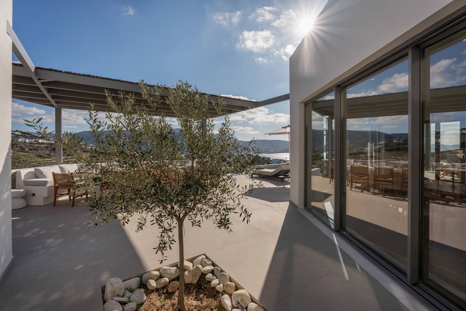 Amphitrite brings together two modern villas into one large Paros estate, offering the kind of scale and flexibility that is difficult to find without sacrificing atmosphere. Together, the houses host up to eighteen guests, with eight ensuite bedrooms and an additional flexible sleeping area, creating a layout that feels considered. The architecture stays crisp and contemporary, but the surrounding landscape, the sea view, and the more rugged setting keep the villa grounded in the island’s character.
