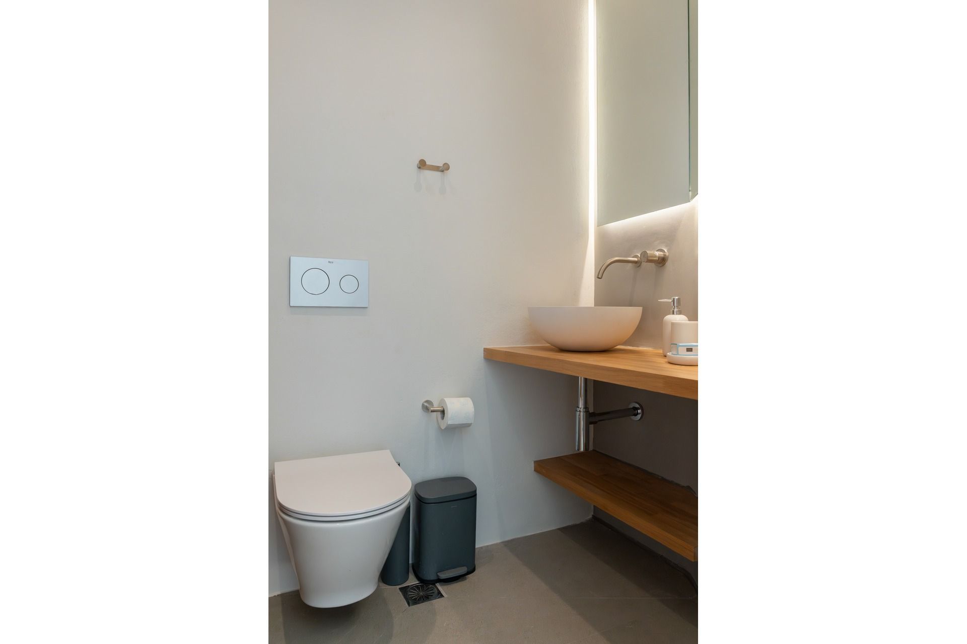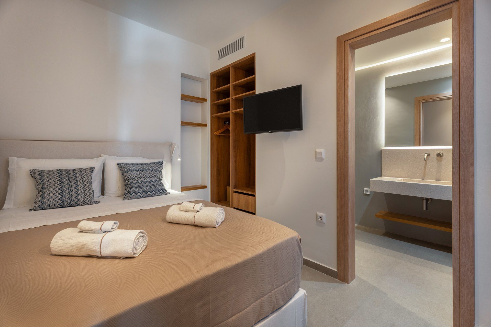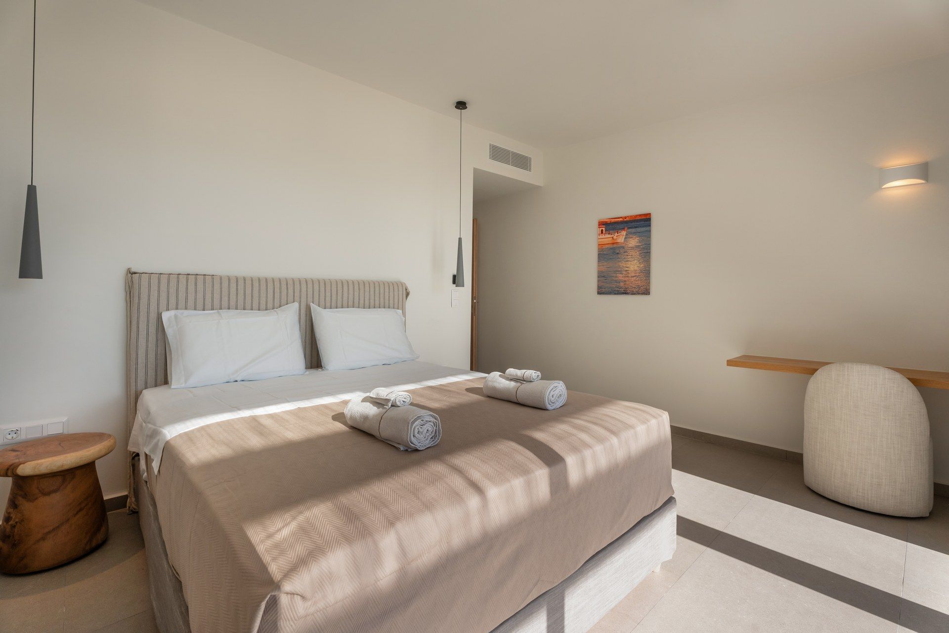Both villas are bright and composed inside, with open-plan living areas, sea-facing openings, and a restrained Cycladic palette. The bedroom layout is one of Amphitrite’s stronger points, because it combines main-house suites with an independent guesthouse that can function as either one or two bedrooms, depending on the needs of the stay. A master suite opening to a private jacuzzi veranda, a wheelchair-friendly bedroom, and a layout that gives each room a natural sense of privacy all make the estate feel not only attractive but genuinely easy to live in over time.