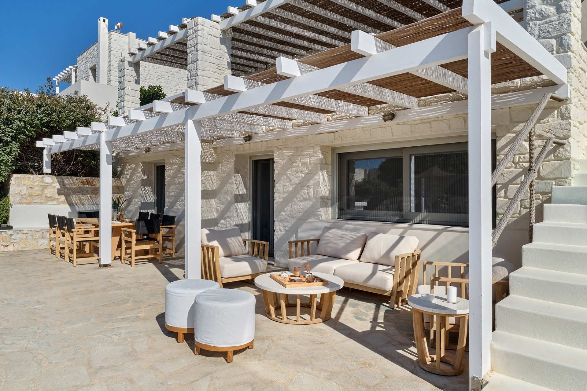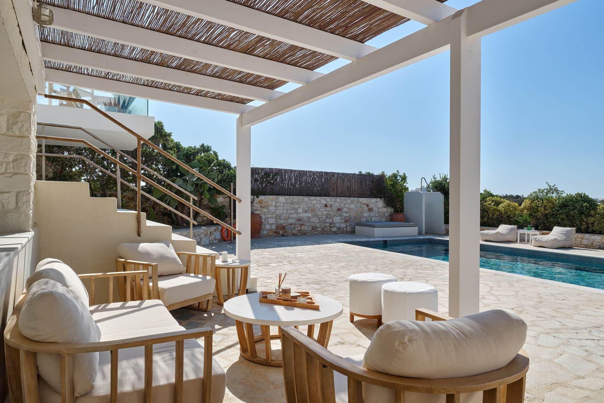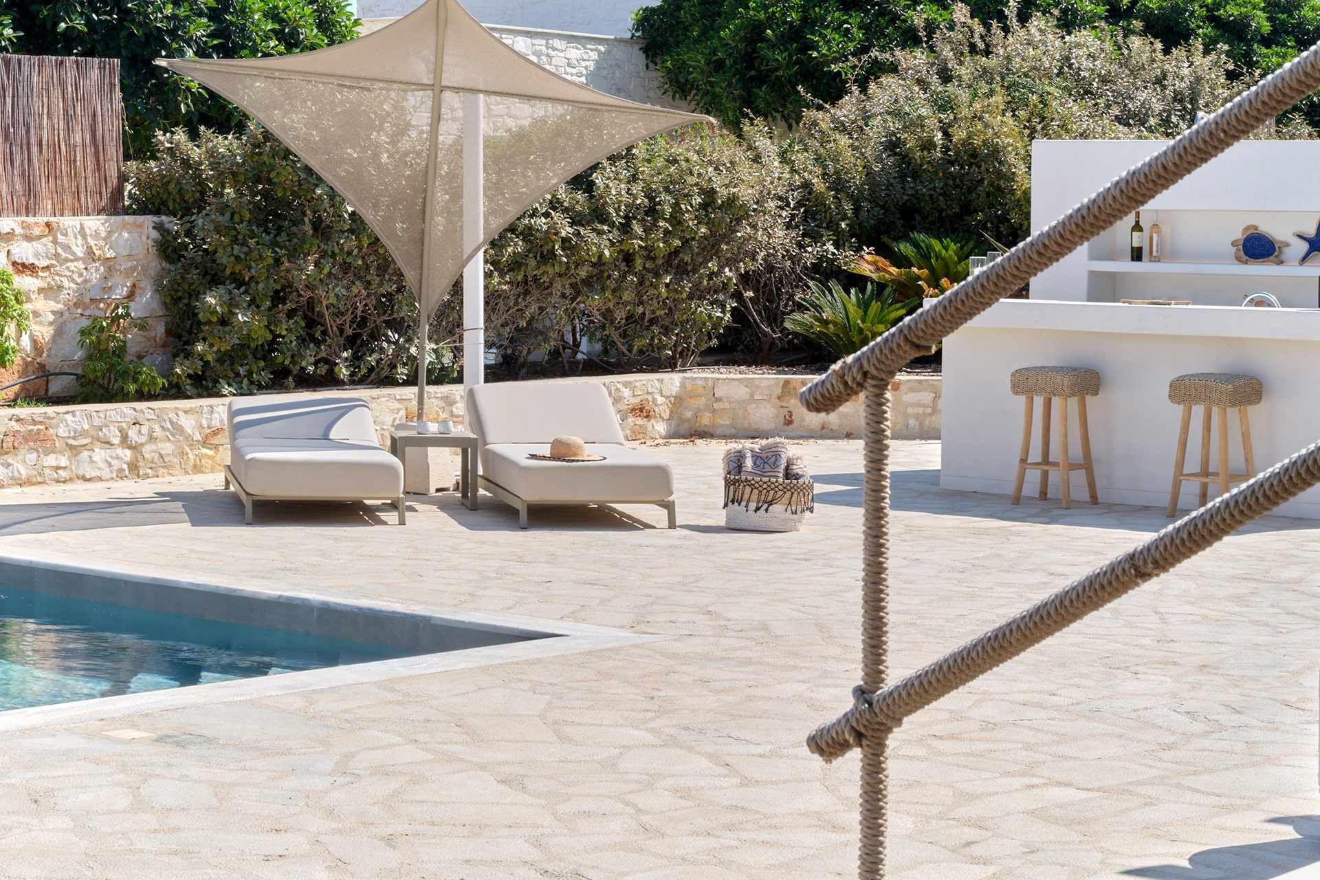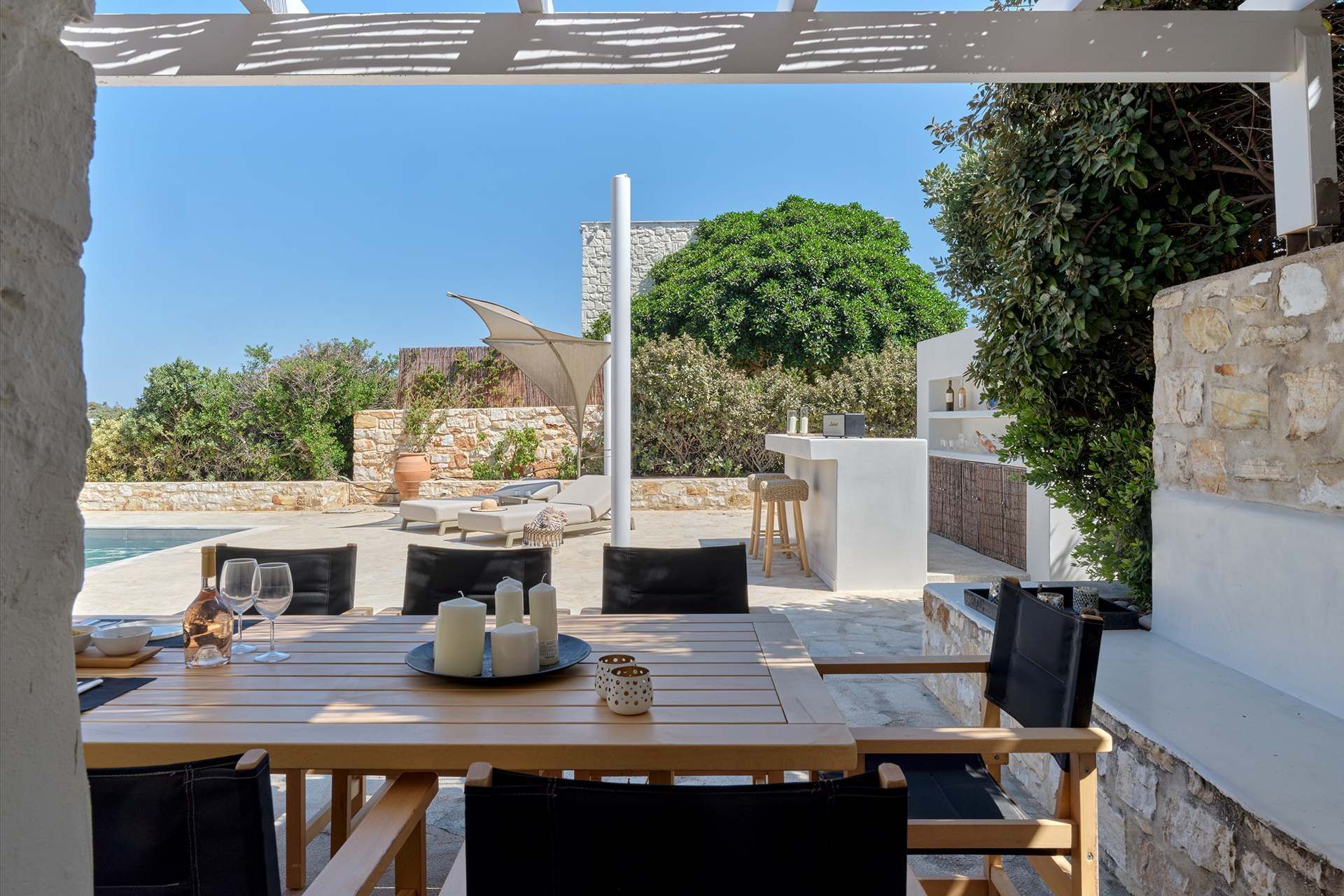 The exterior carries much of the villa’s personality. The pool works as the natural center of the property, but the terrace around it is what makes the space feel so comfortable, creating room for dining, lounging, swimming, and sitting out of the sun. The pool bar and BBQ add a more social energy, and the pergola-covered spaces bring just enough shade and structure to keep the day outdoors. The whole setting feels designed for longer stays.