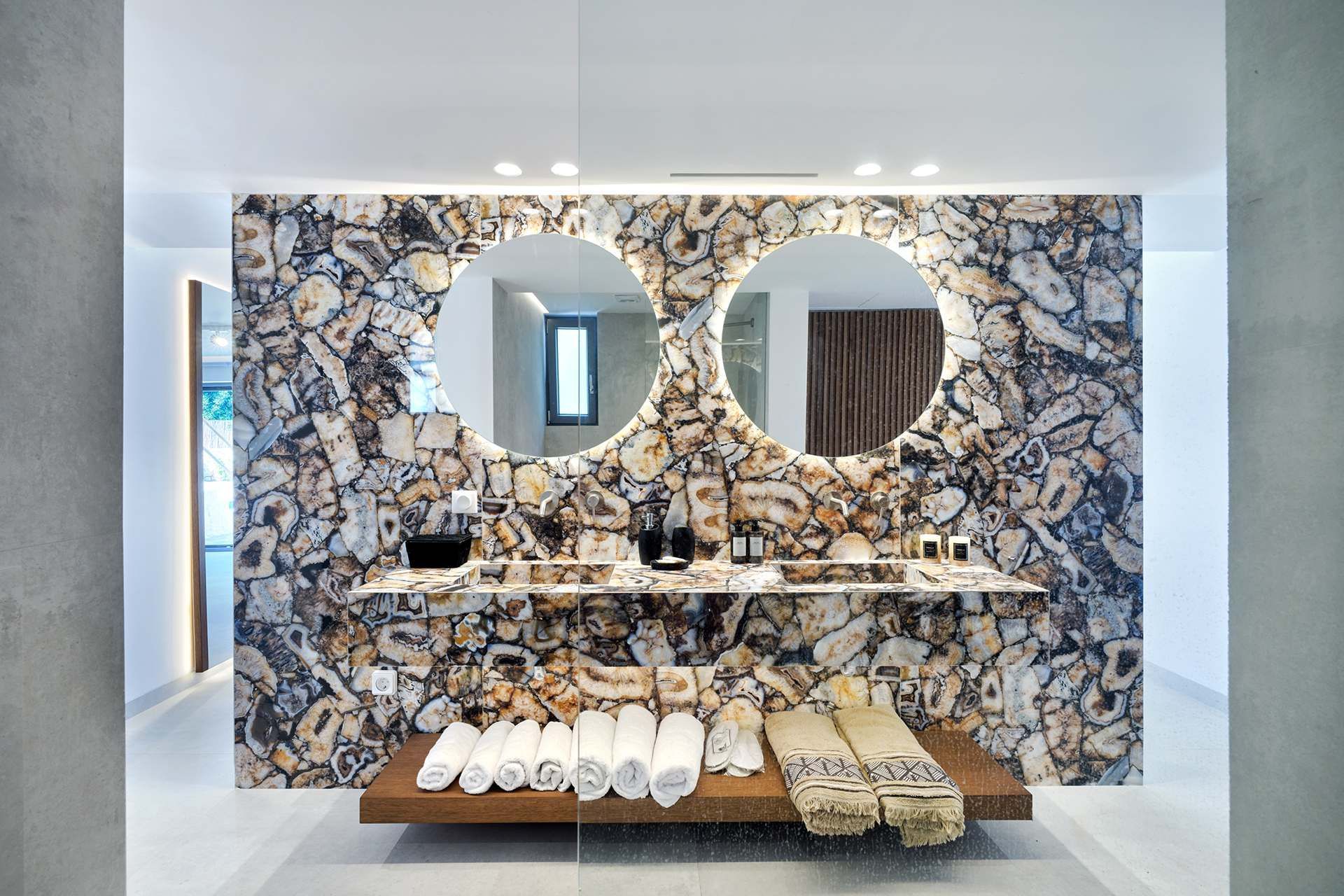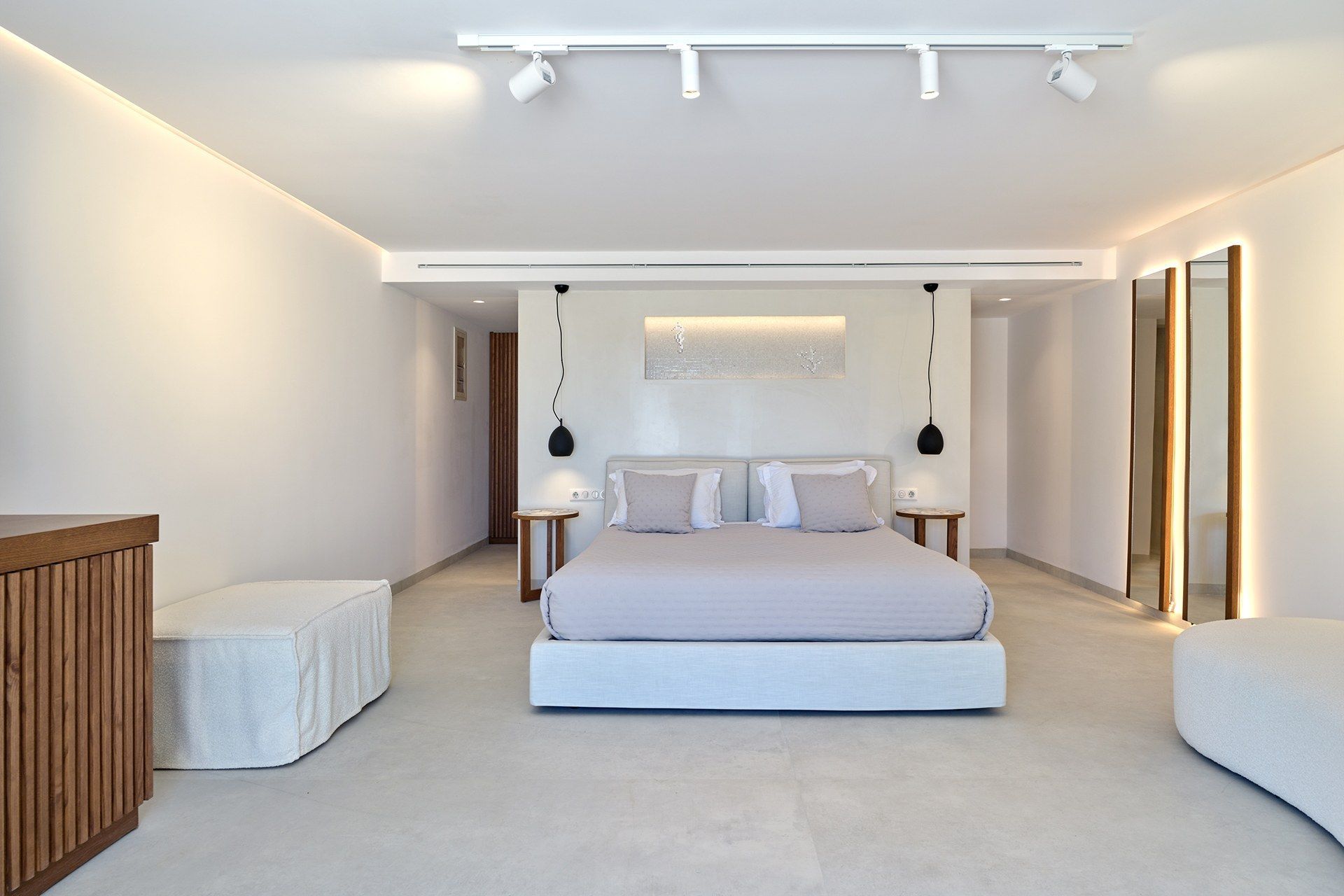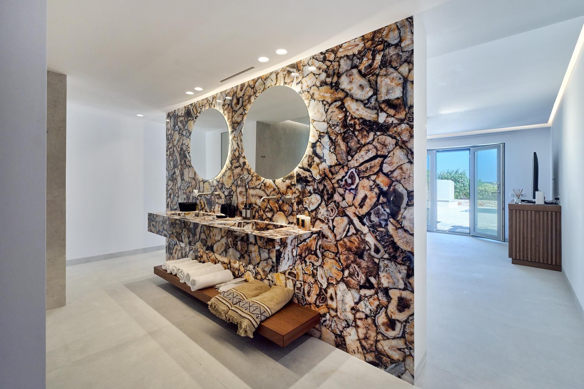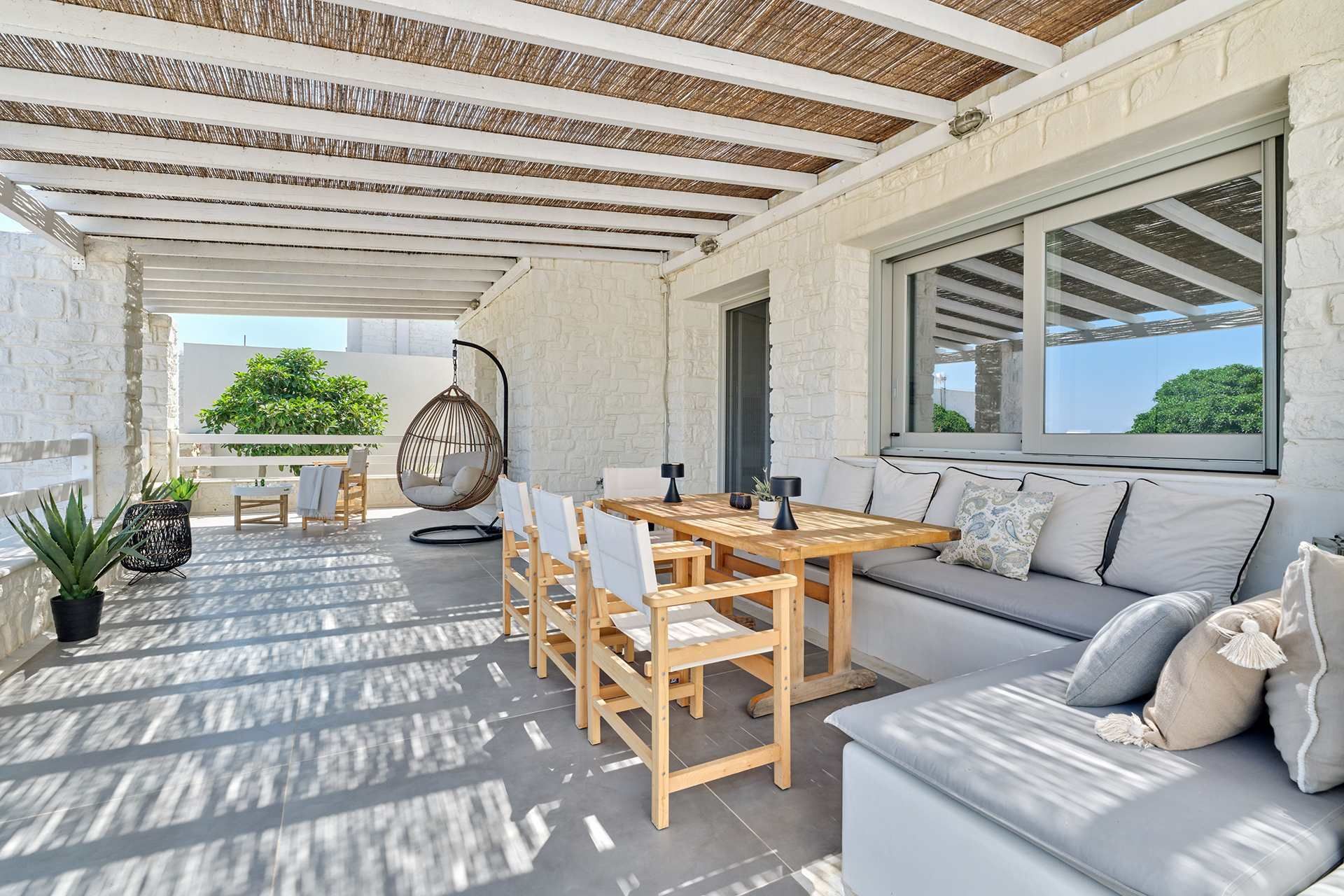 The exterior carries much of the villa’s personality. The pool works as the natural center of the property, but the terrace around it is what makes the space feel so comfortable, creating room for dining, lounging, swimming, and sitting out of the sun. The pool bar and BBQ add a more social energy, and the pergola-covered spaces bring just enough shade and structure to keep the day outdoors. The whole setting feels designed for longer stays.