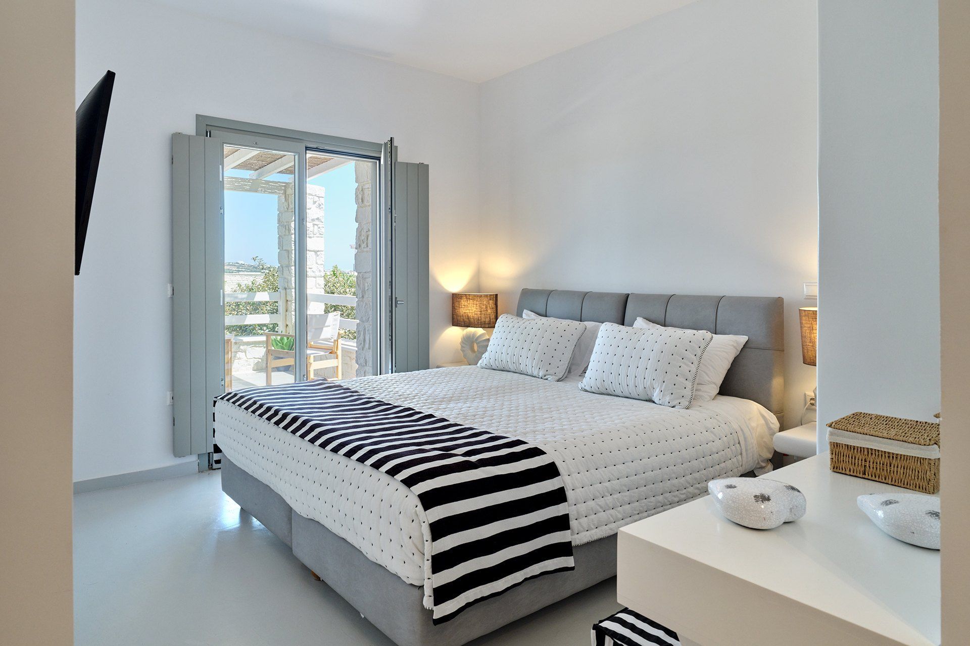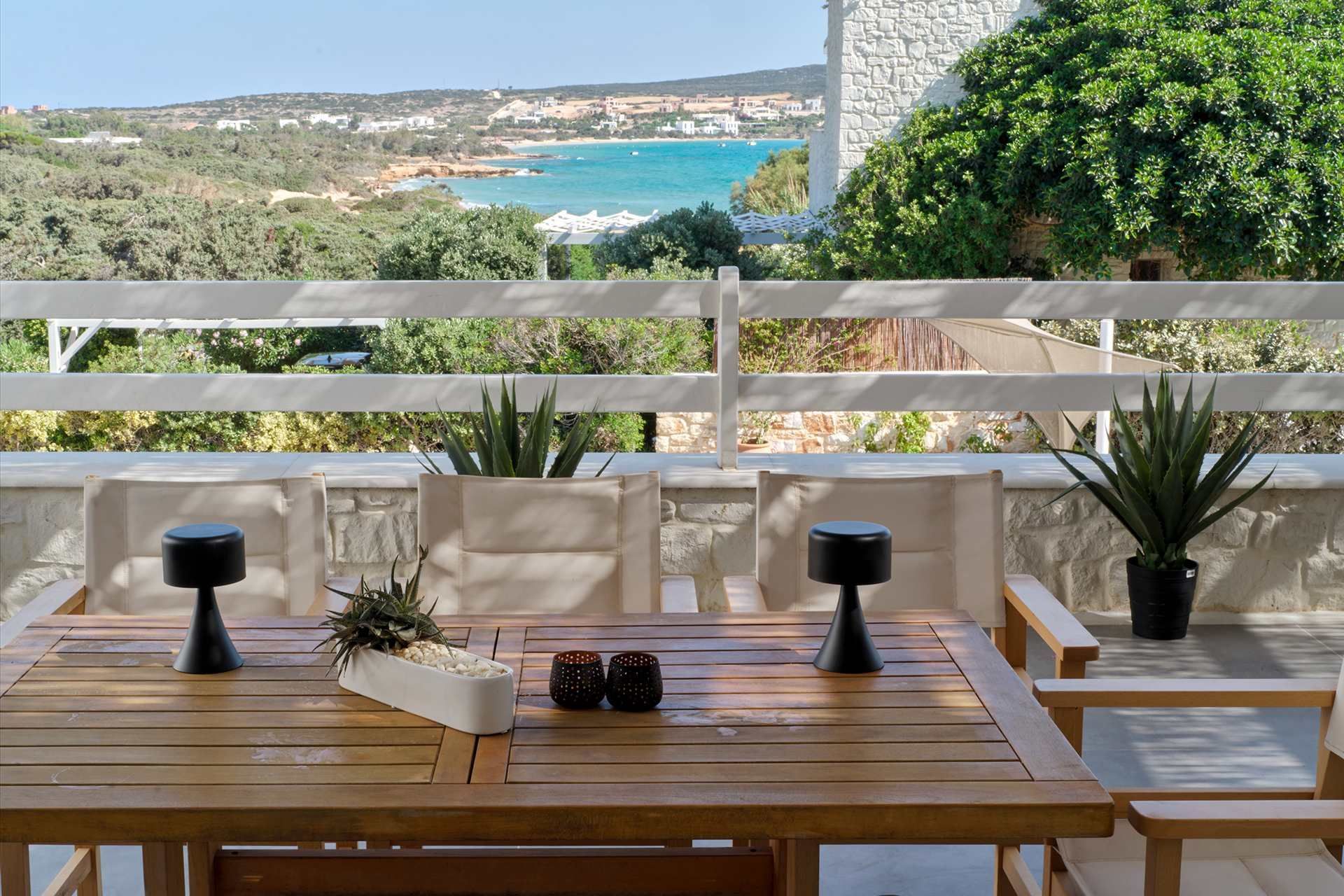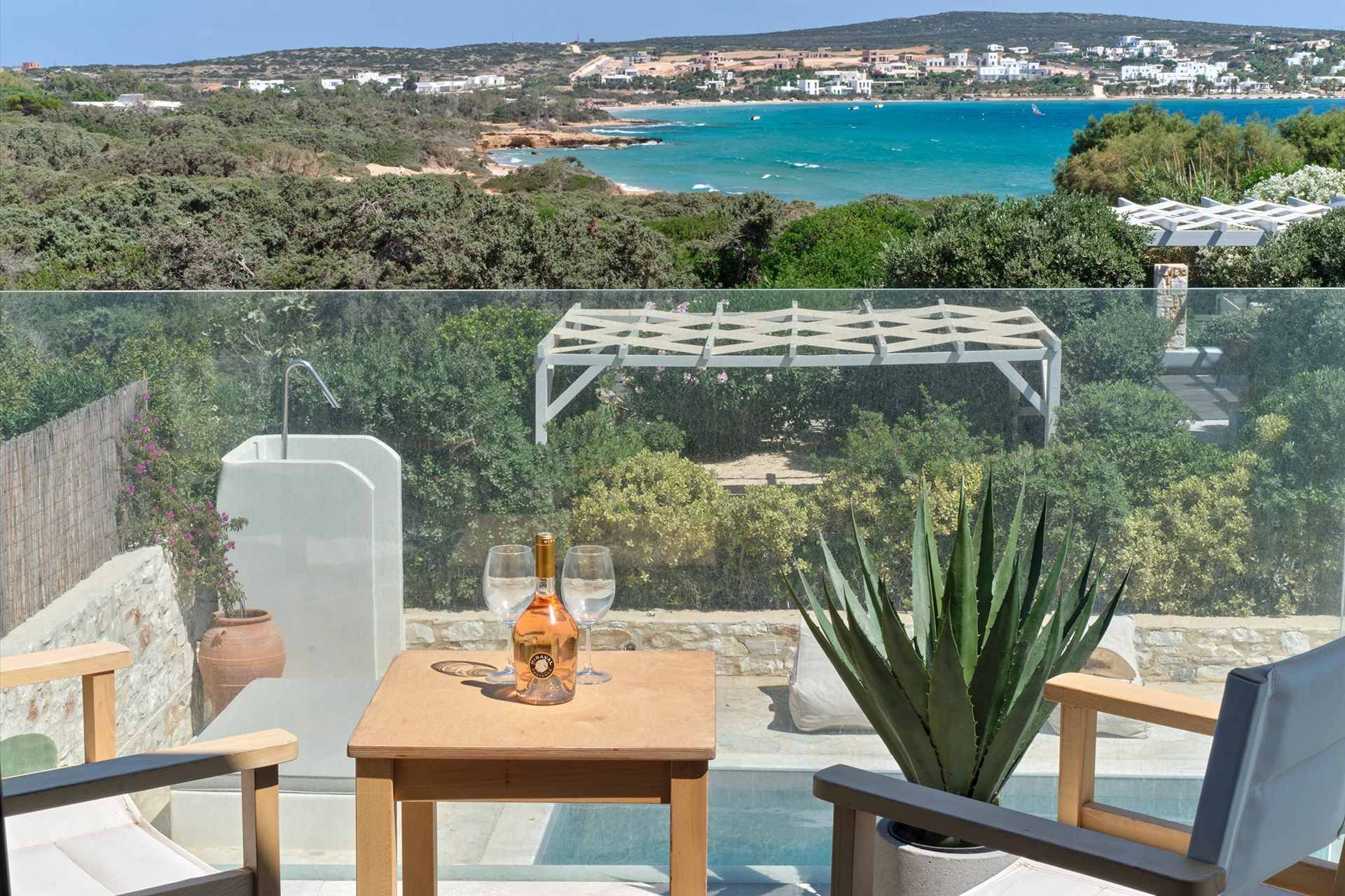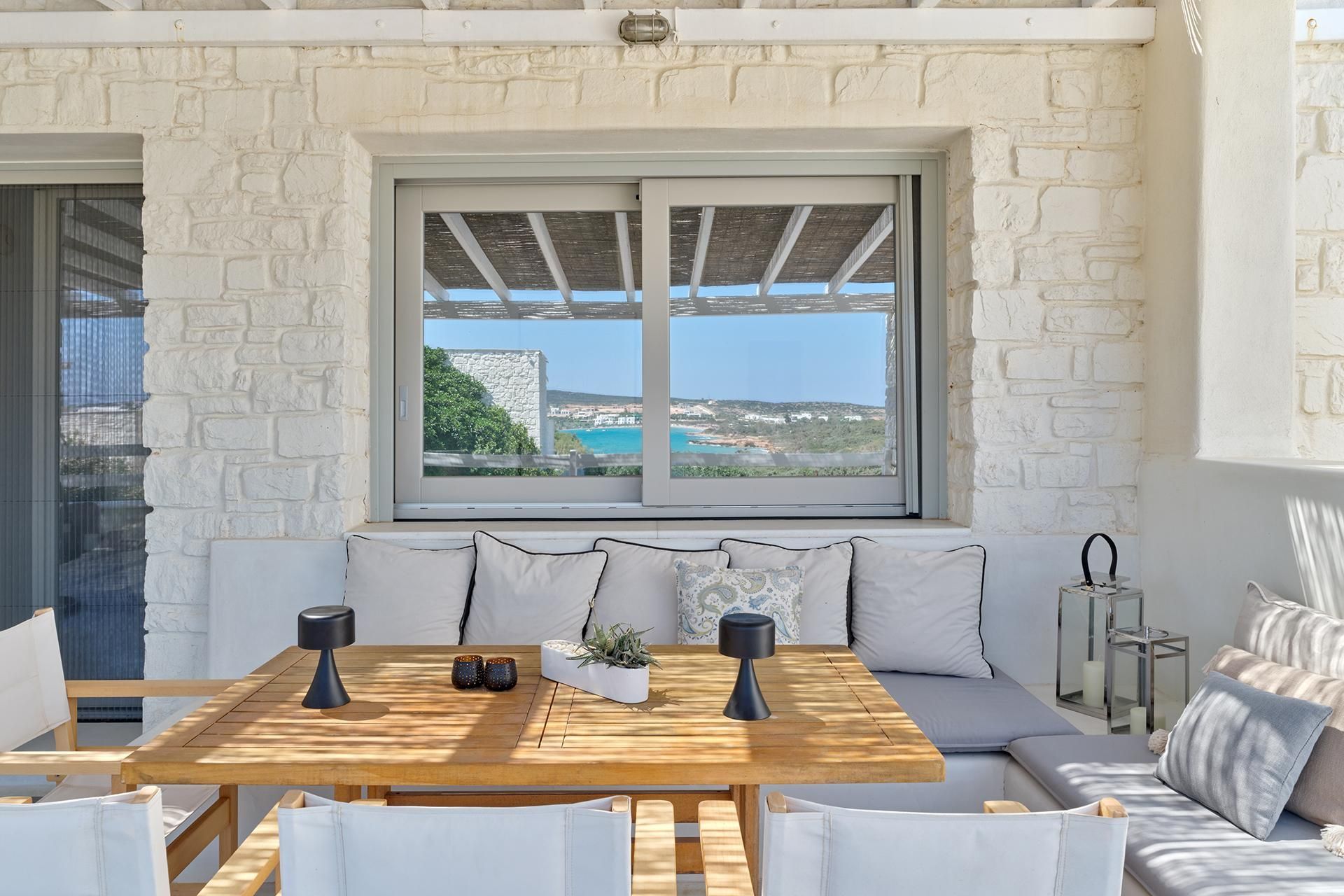 The setting is part of what makes Brigitte so appealing. A quieter sandy stretch of Santa Maria is a short walk away for a quick dip, while the more organized beach area is also close if the group wants something livelier. Naousa is also within easy driving distance, so dinners out and evenings in town are simple to fit into the week without the villa ever losing its quieter feel.